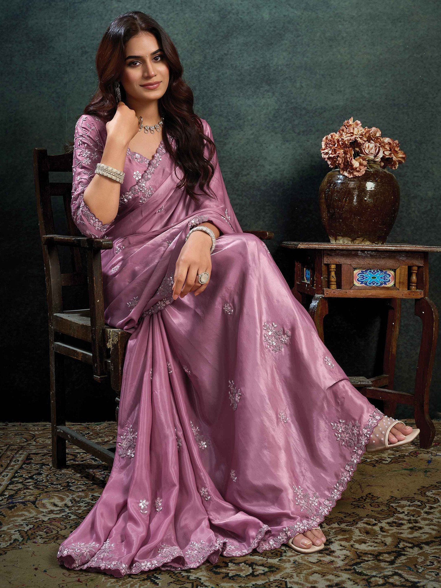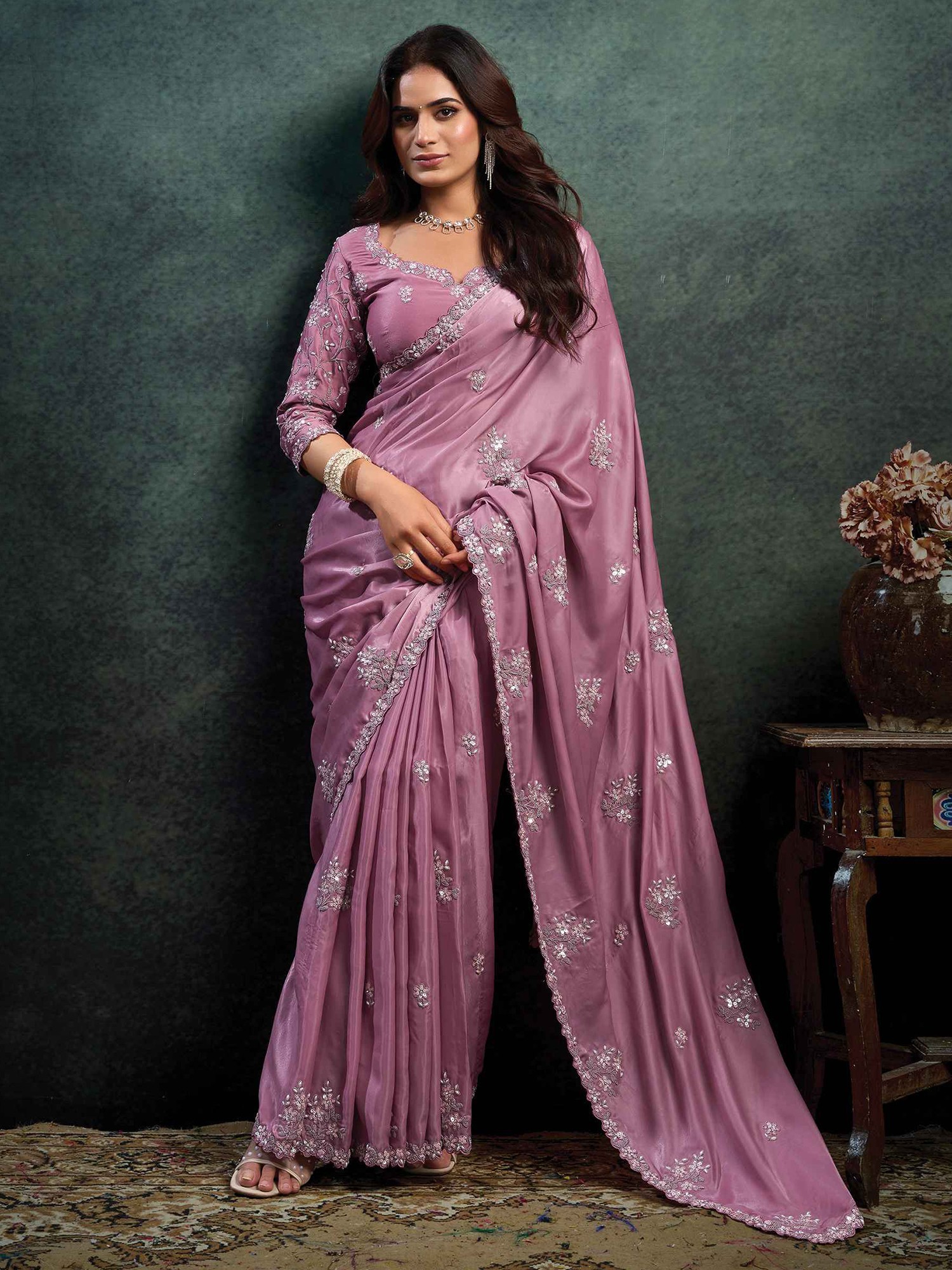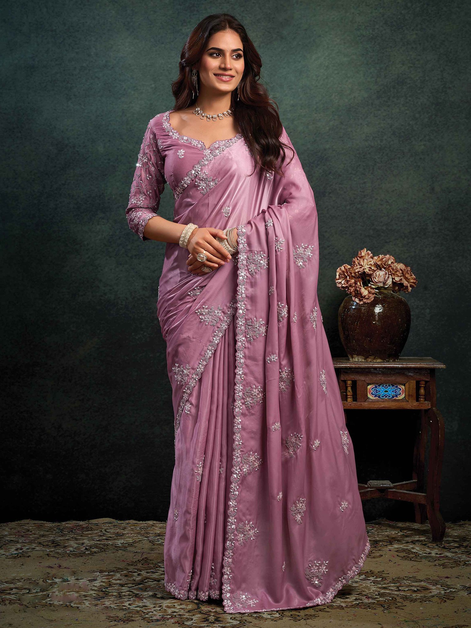 Soft Satin Saree With Sequins Embroidery Pearl And Stone Handwork Designer Party Wear Wedding Saree For Women