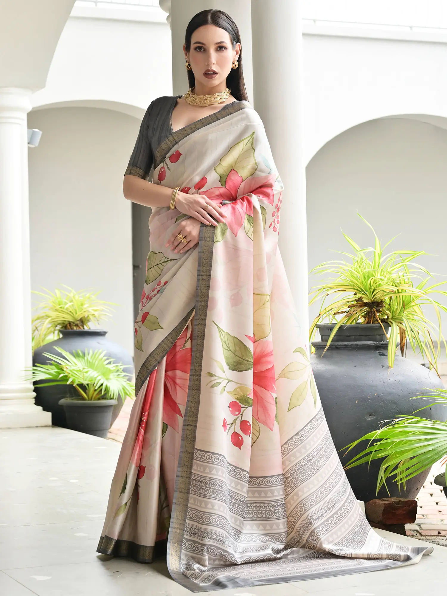 Adorn yourself in a symphony of color and form, where vibrant floral motifs burst forth against a soft, luminous backdrop. The delicate watercolor-like print evokes the freshness of a blooming garden, each petal and leaf rendered with graceful detail. The complementary Zari border frames this natural splendor with an elegant, geometric precision, hinting at heritage.