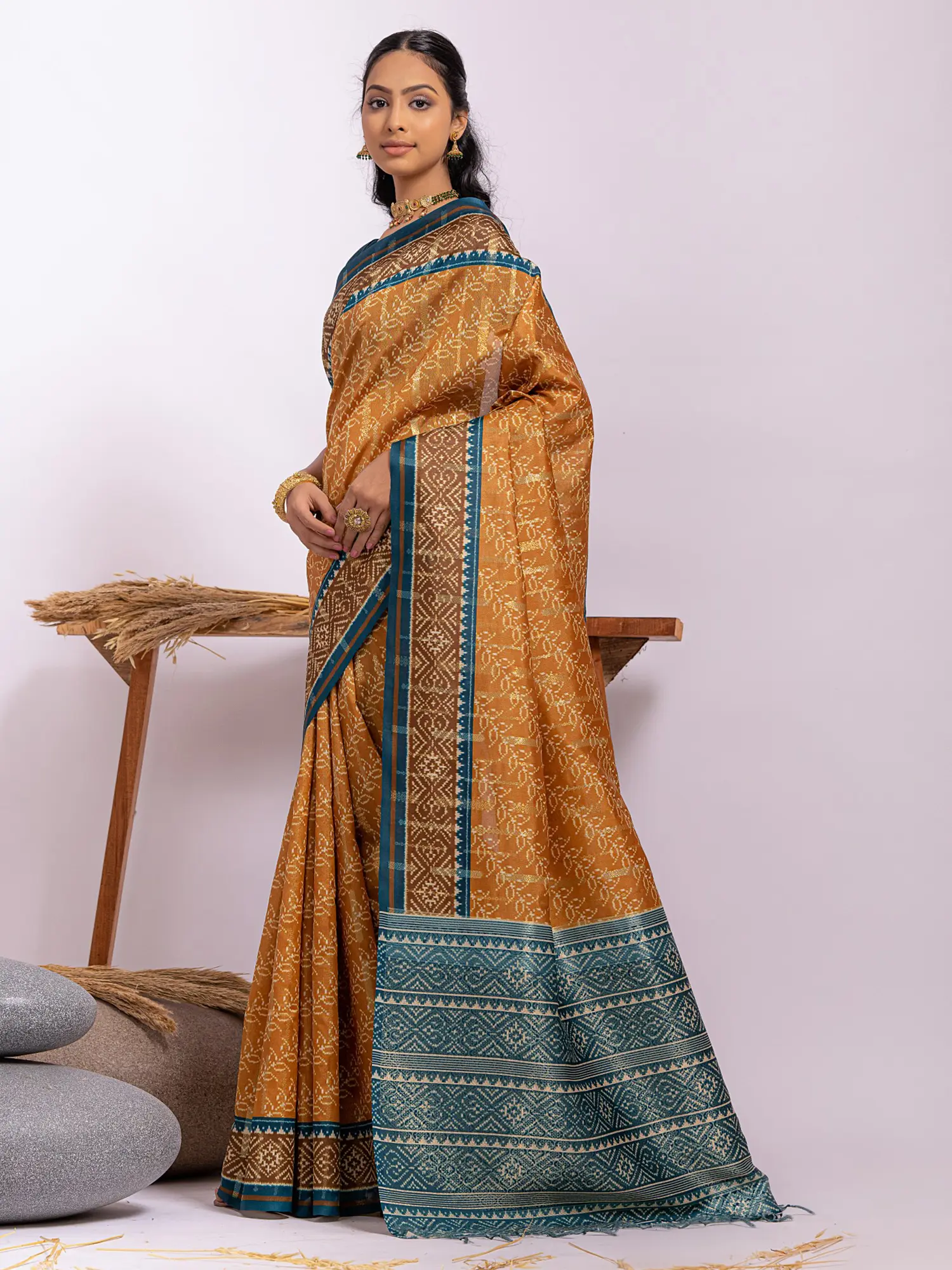 Kosa Tussar Silk Saree with Hand Block Printed Tribal Drummer Figures from Bengal