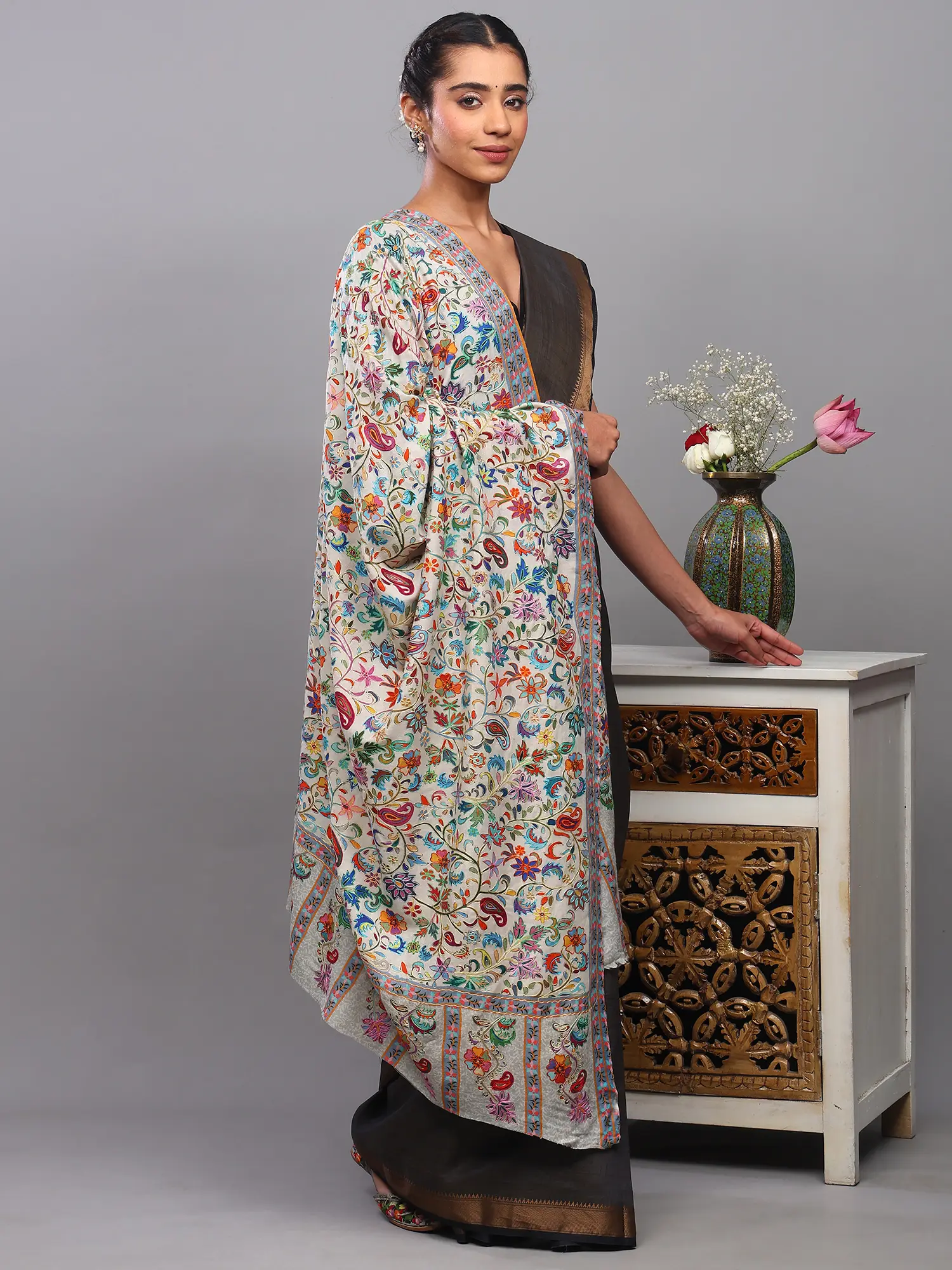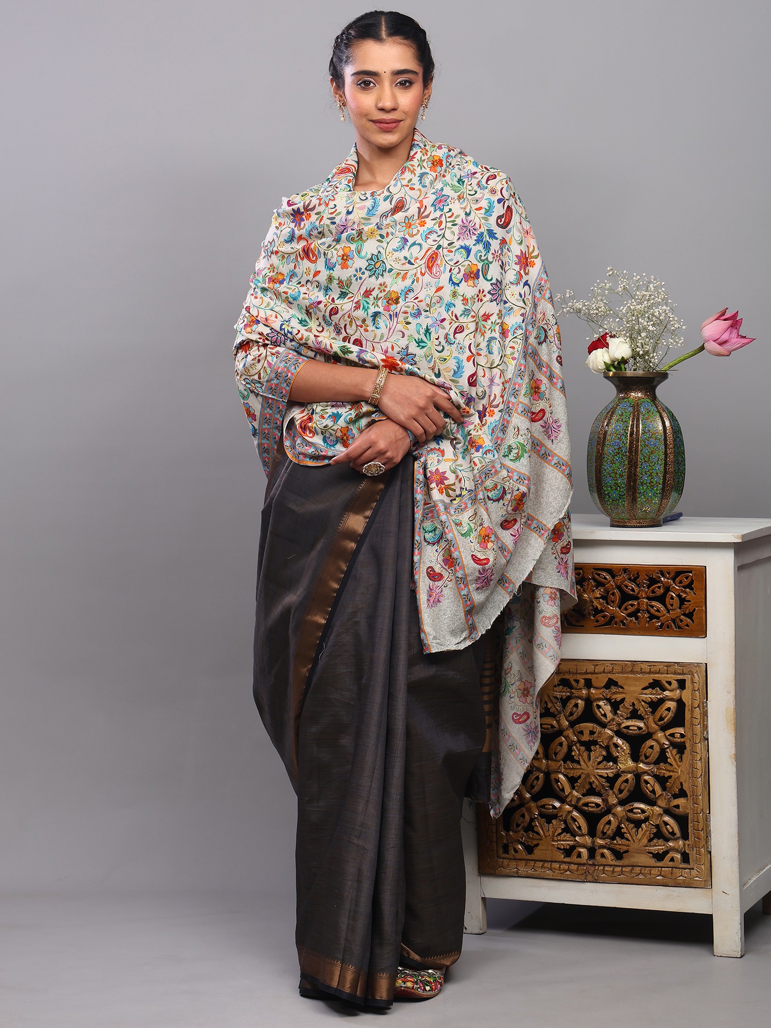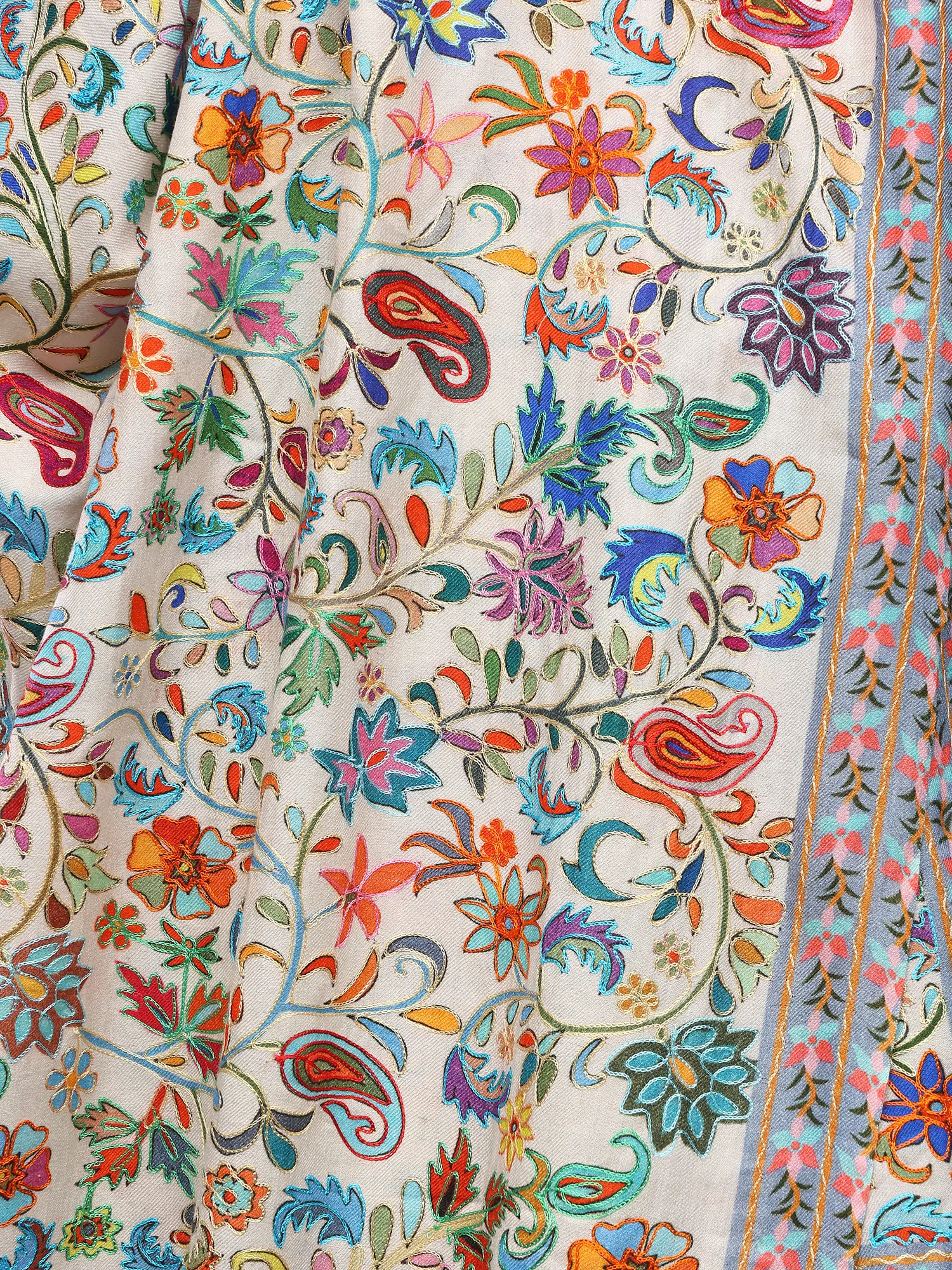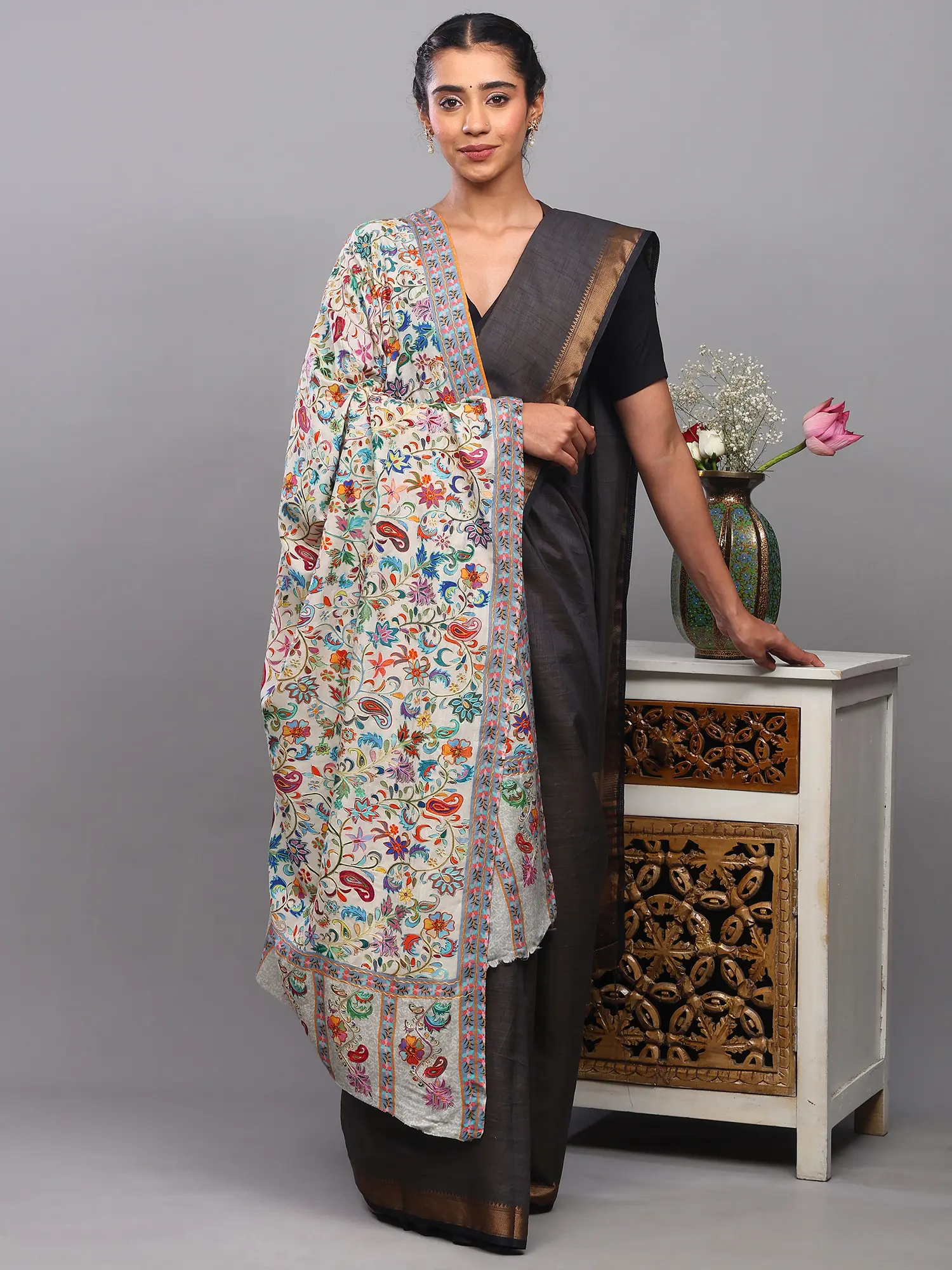 Pure Pashmina Stole with Sozni Hand-Embroidered Floral Jaal from Kashmir