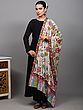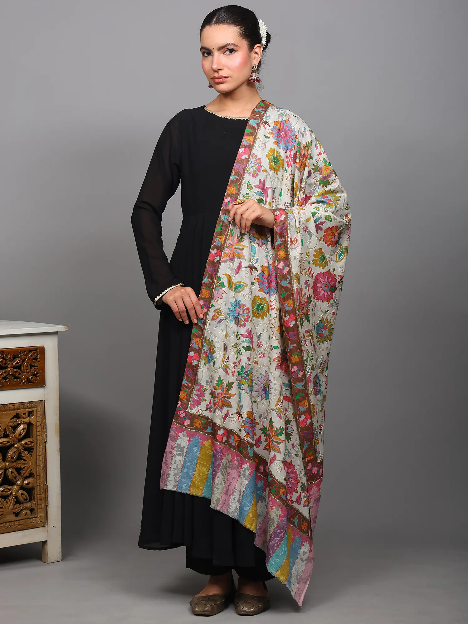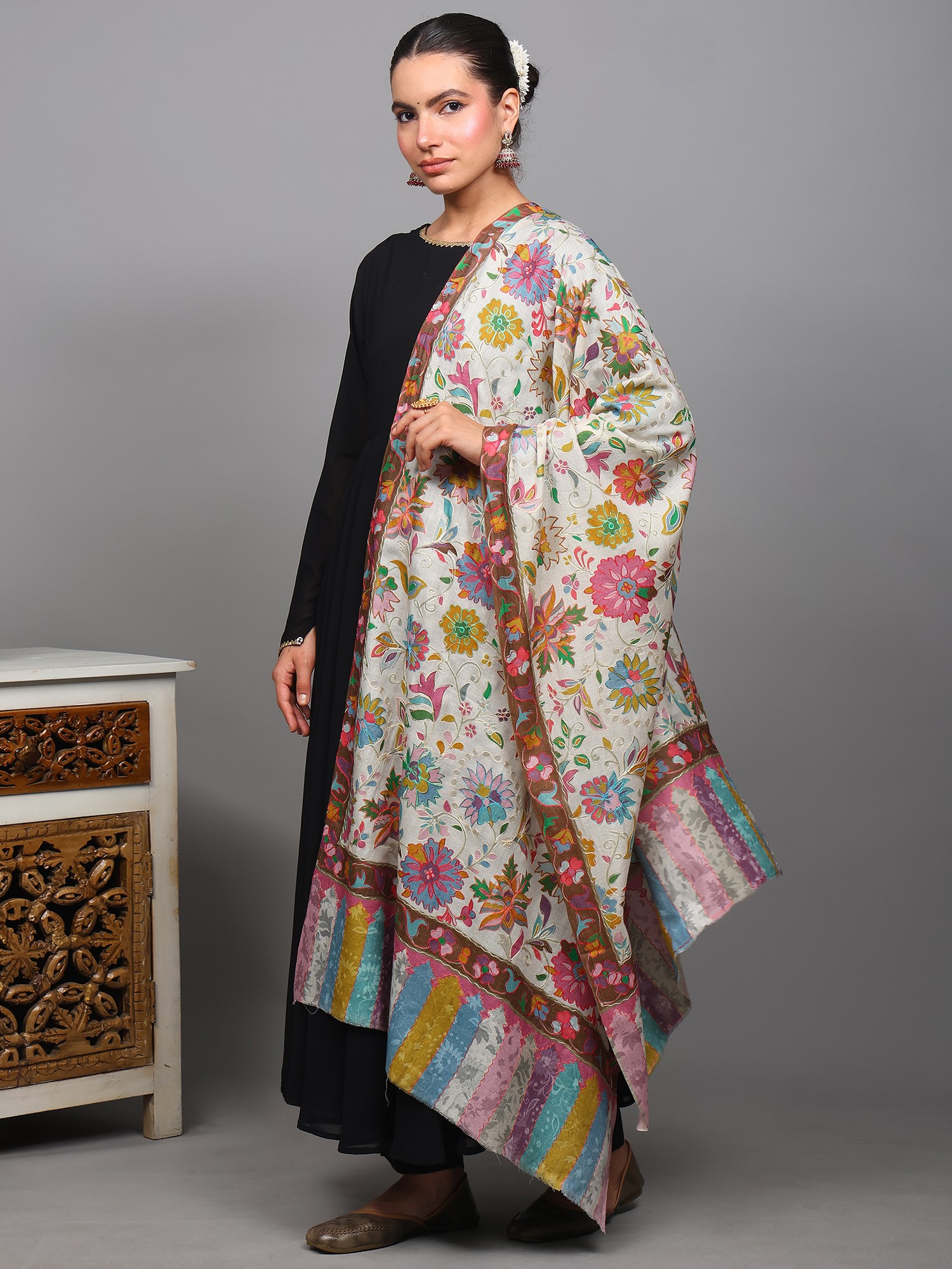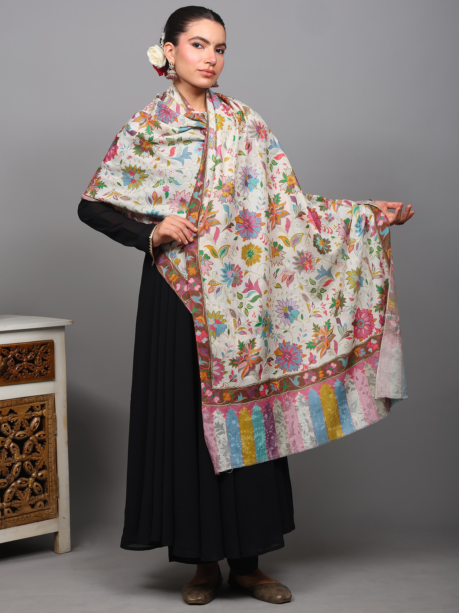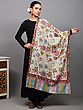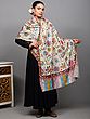 Cannoli-Cream Aari Embroidered Kalamkari Stole with Printed Multicolor Paisleys-Flowers Motifs from Punjab