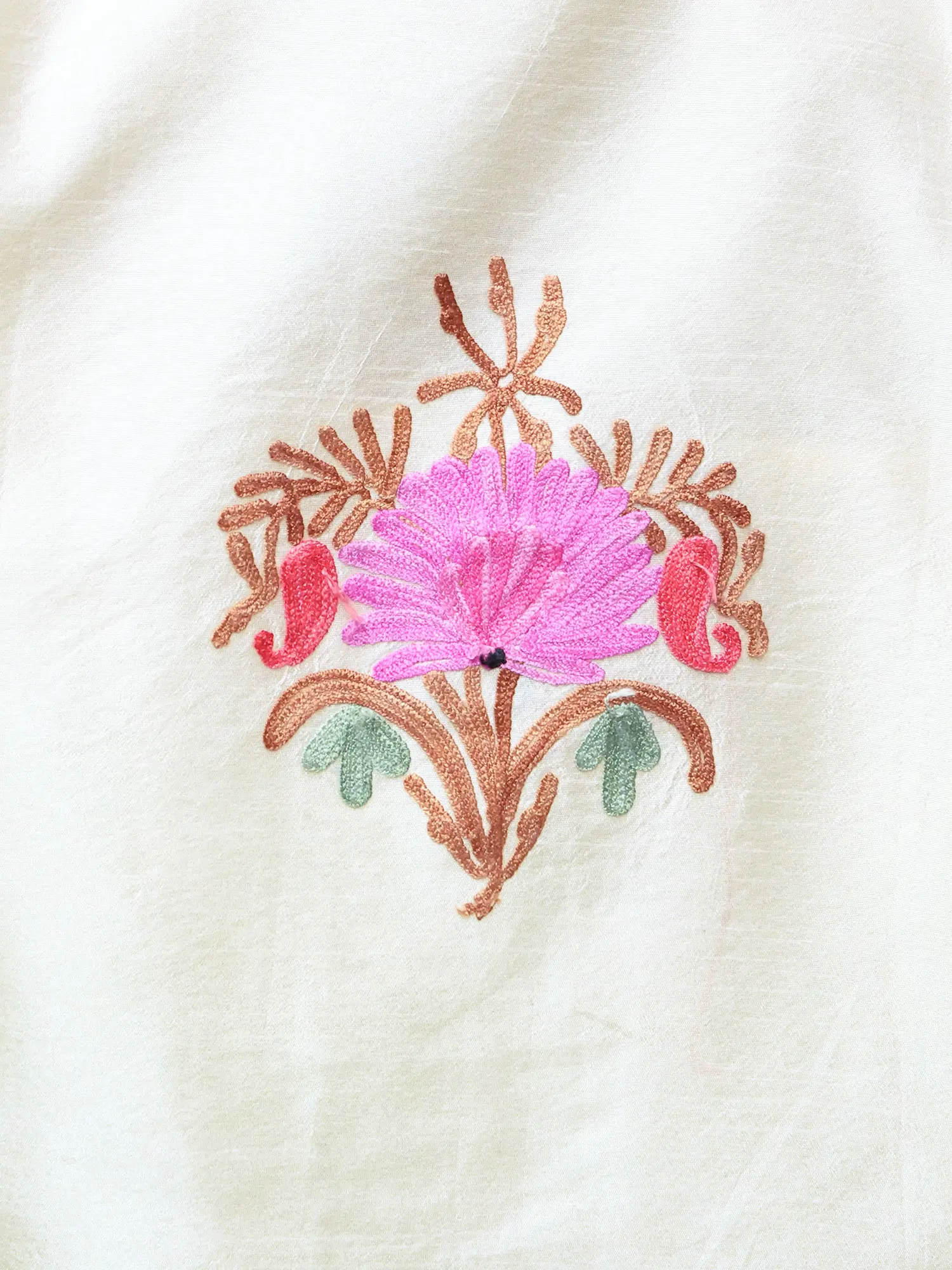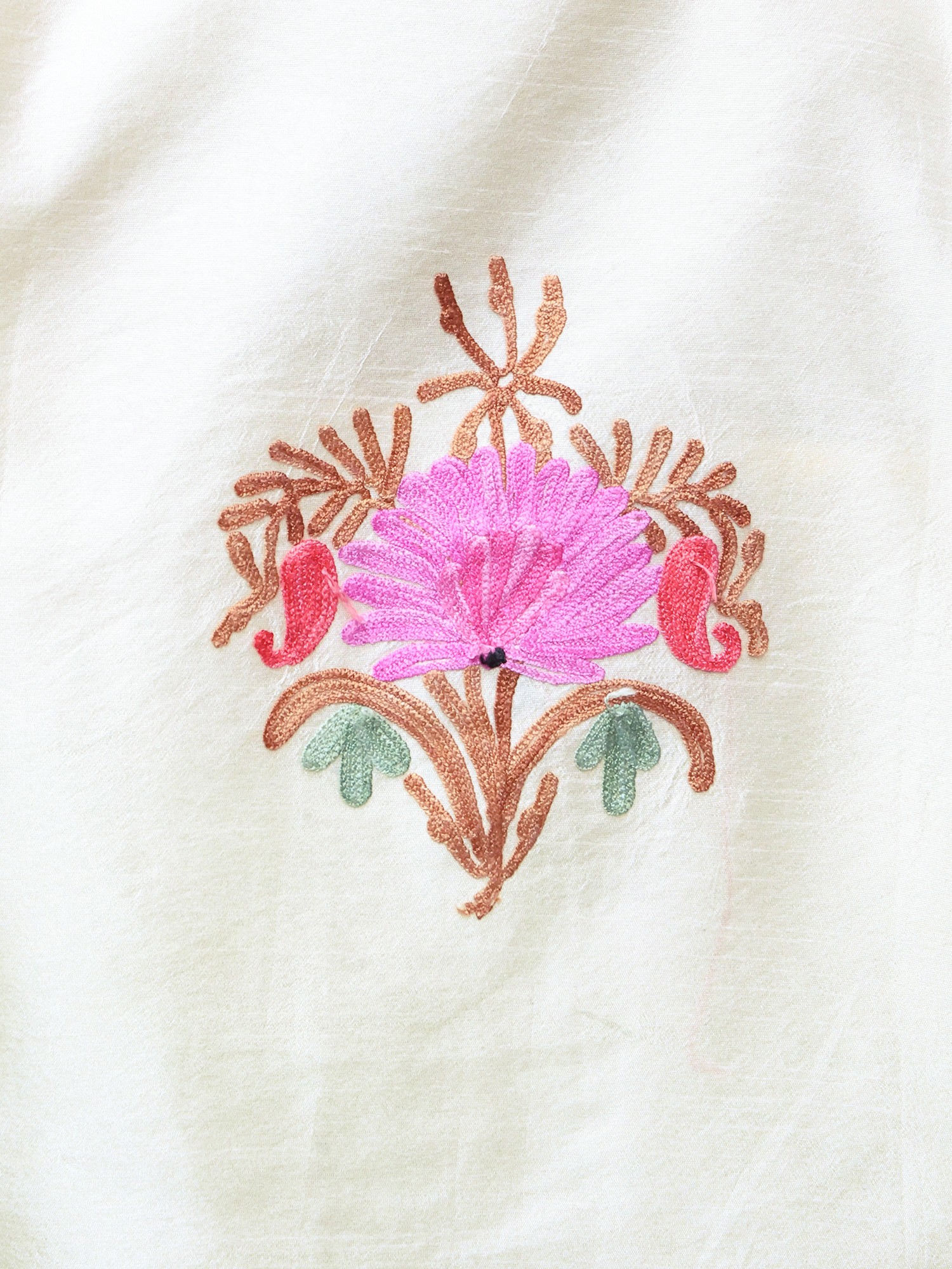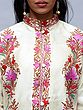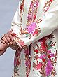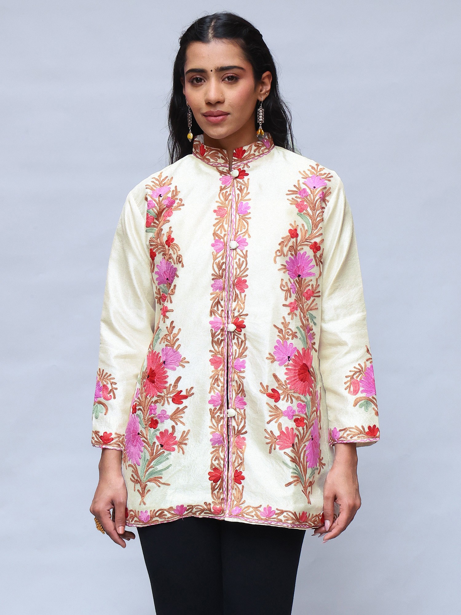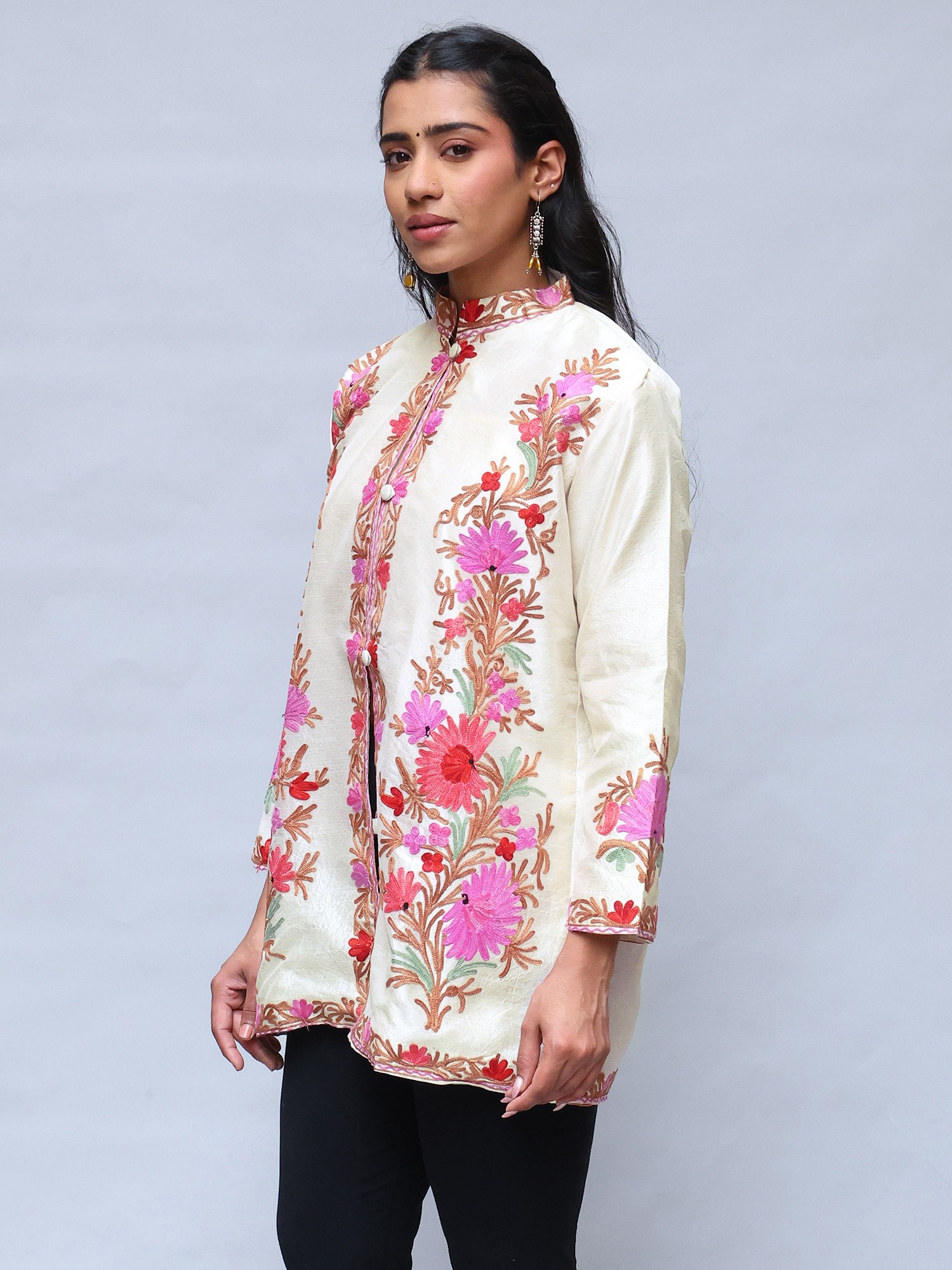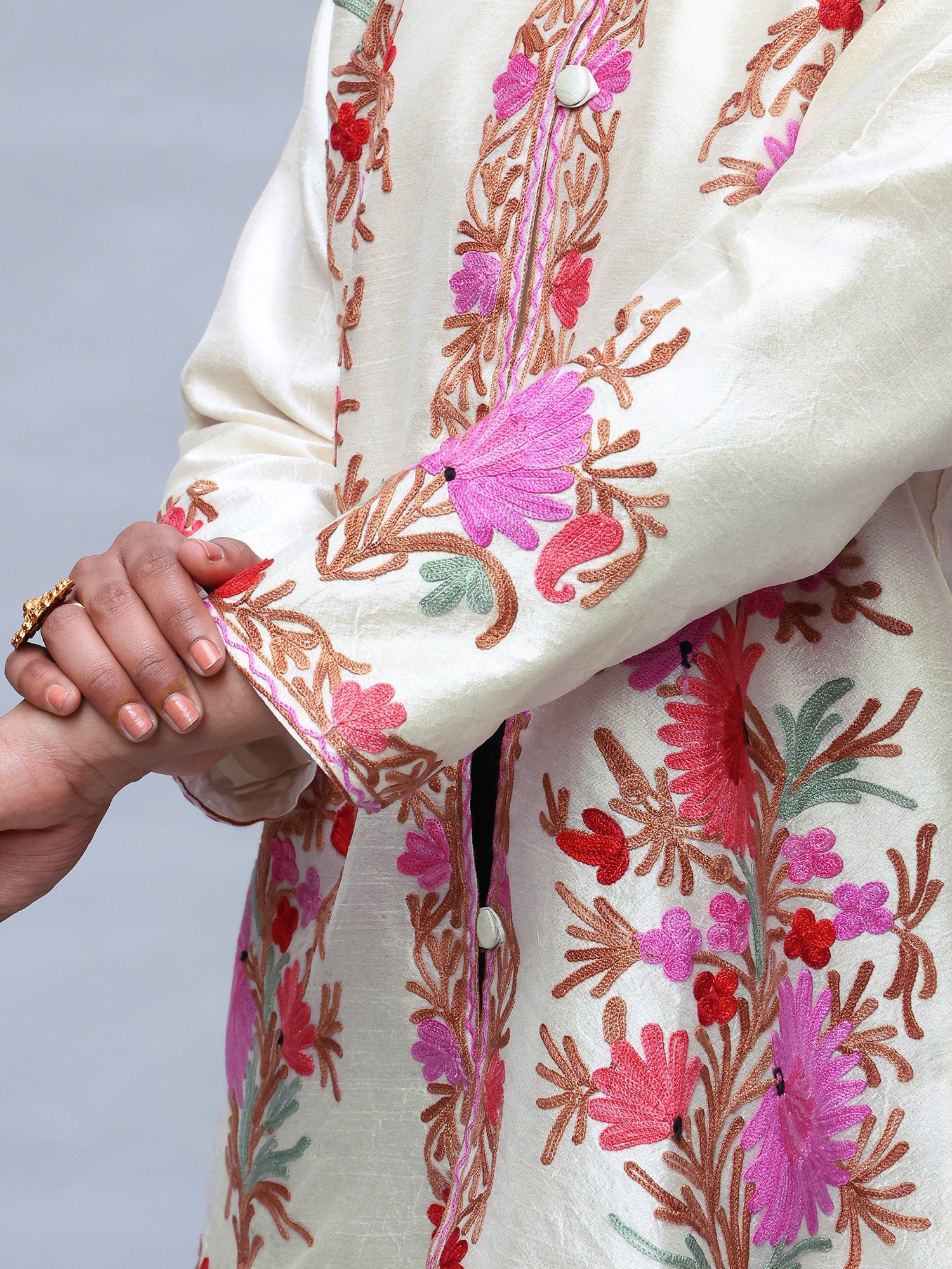 Frosted-Almond Kashmiri Long Jacket with Aari Embroidered Flowers in Multicolor Thread