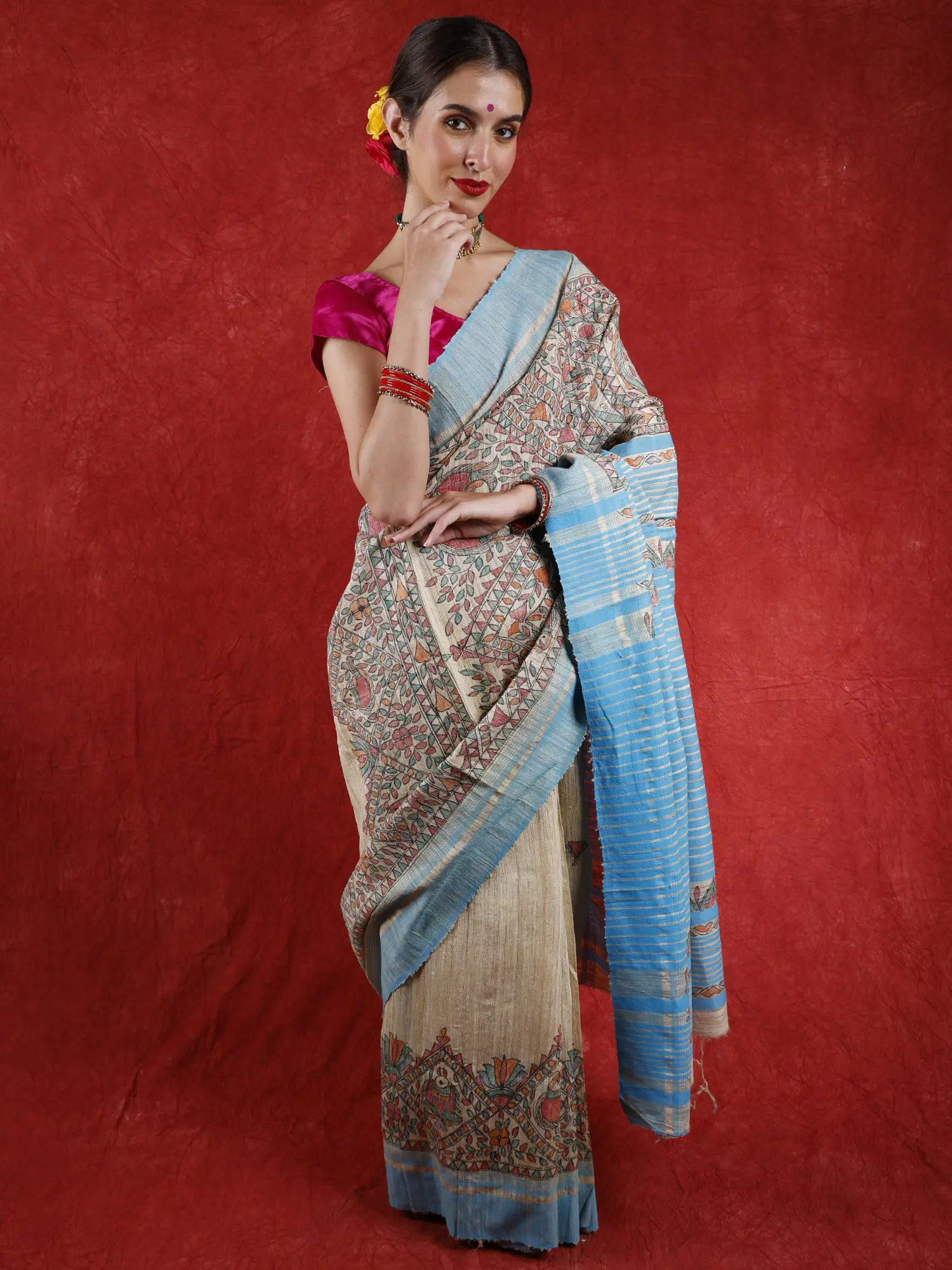 Khadi cotton fabric offers unparalleled comfort, known for its softness, breathability, and ability to keep the wearer cool in warm weather. This Solitary-Star Khadi Cotton Madhubani Saree from Bihar further enhances comfort with its lightweight texture and gentle drape.