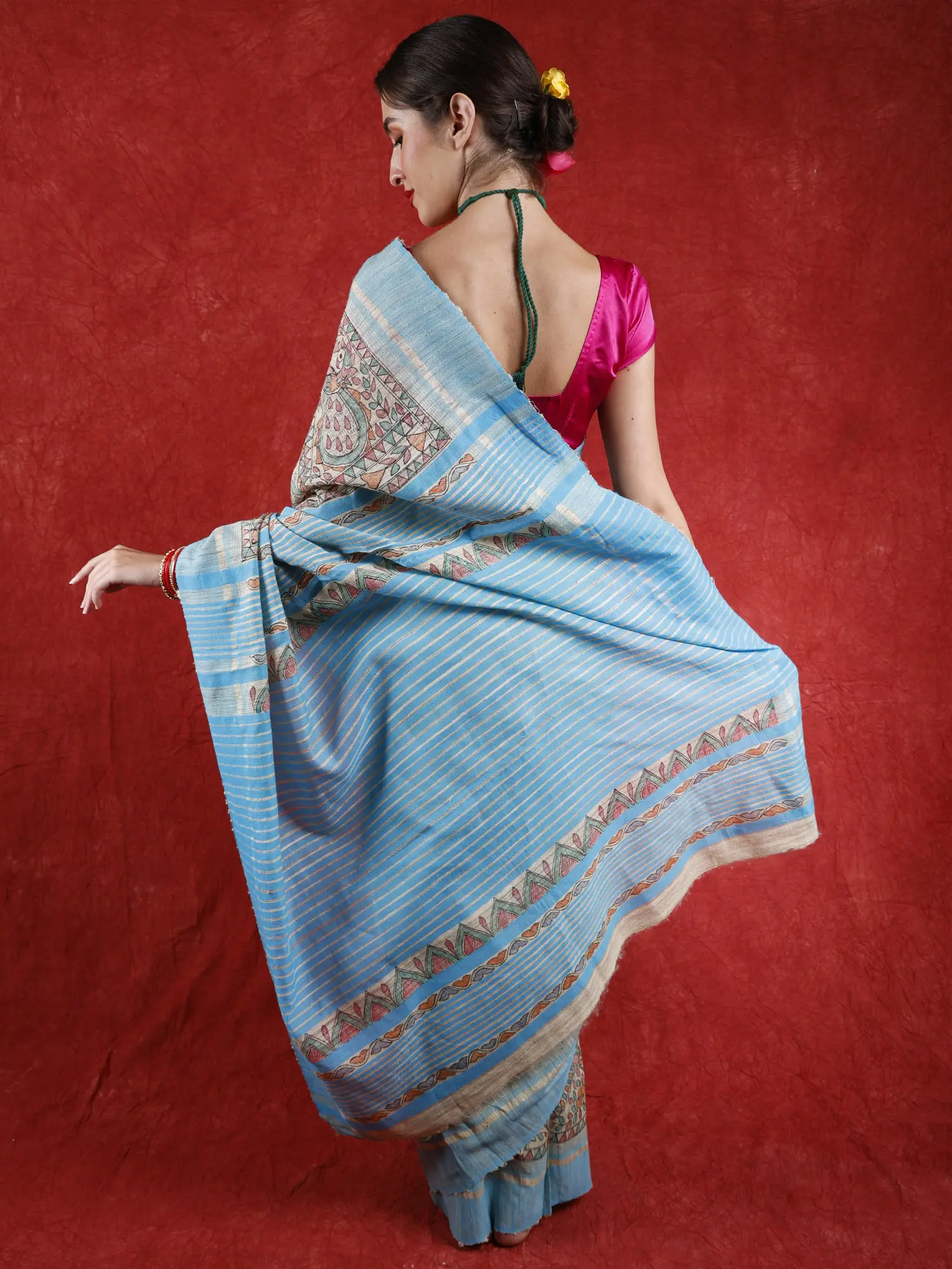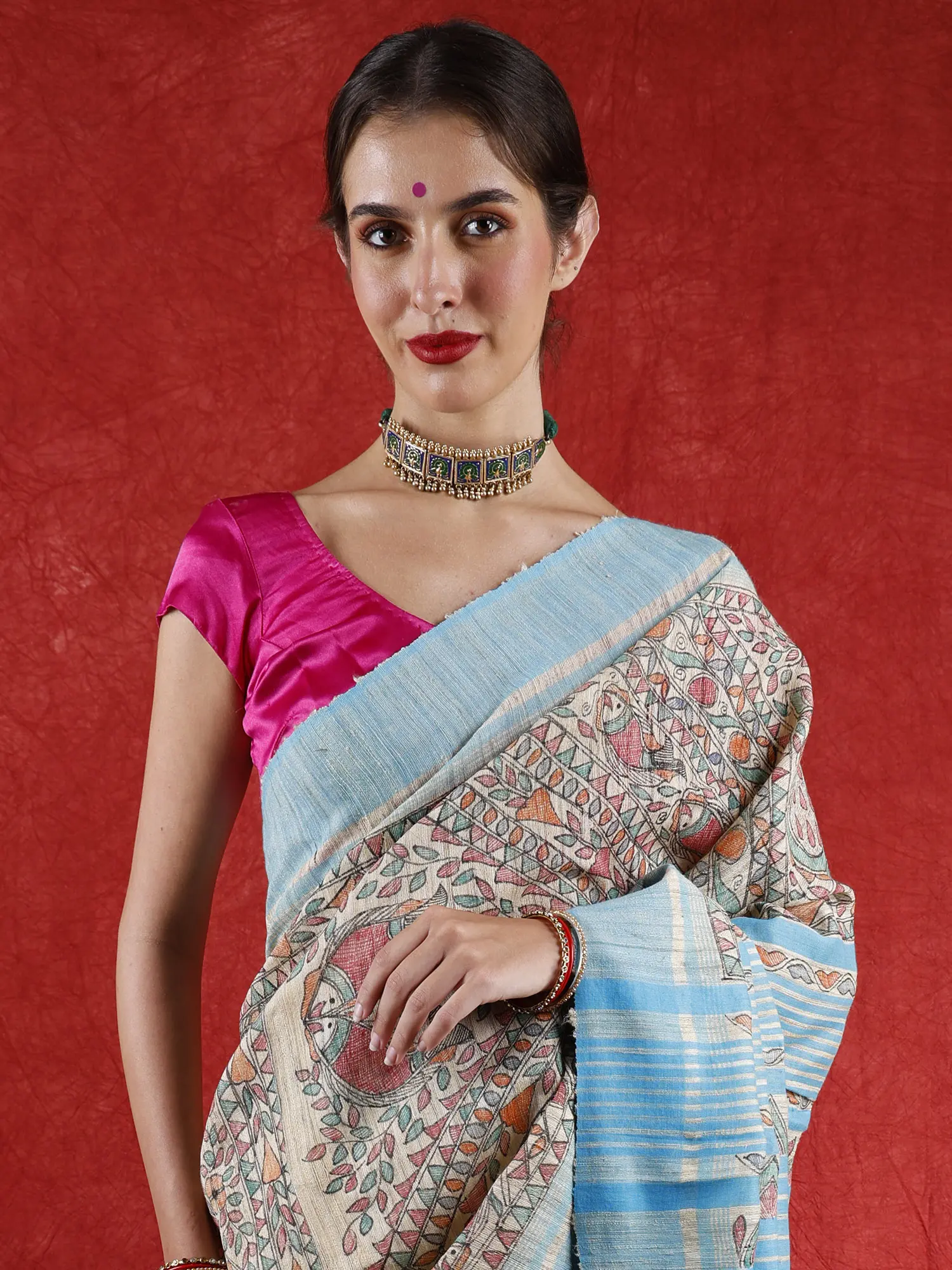 Hand-painted with intricate motifs of fishes and flowers in the traditional Madhubani style, the saree exudes beauty and charm. Each brushstroke tells a story, adding depth and character to the fabric. As you adorn this saree, you not only experience the luxurious comfort of khadi cotton but also carry a piece of Bihar's rich artistic heritage, making it a truly exquisite garment.