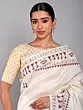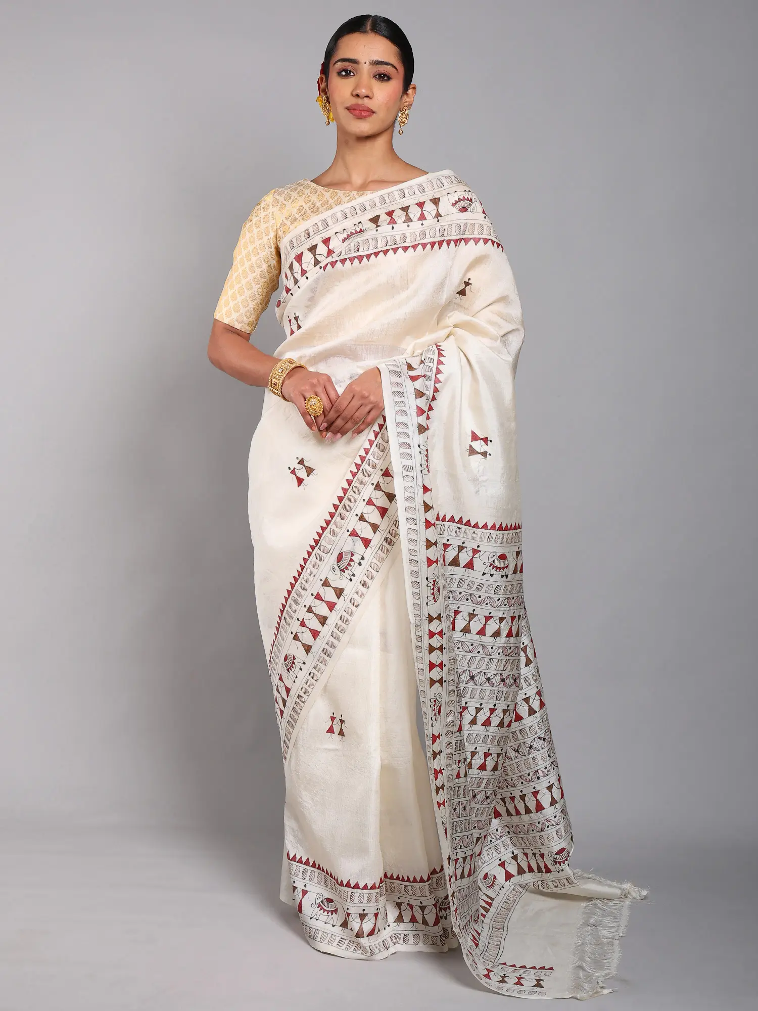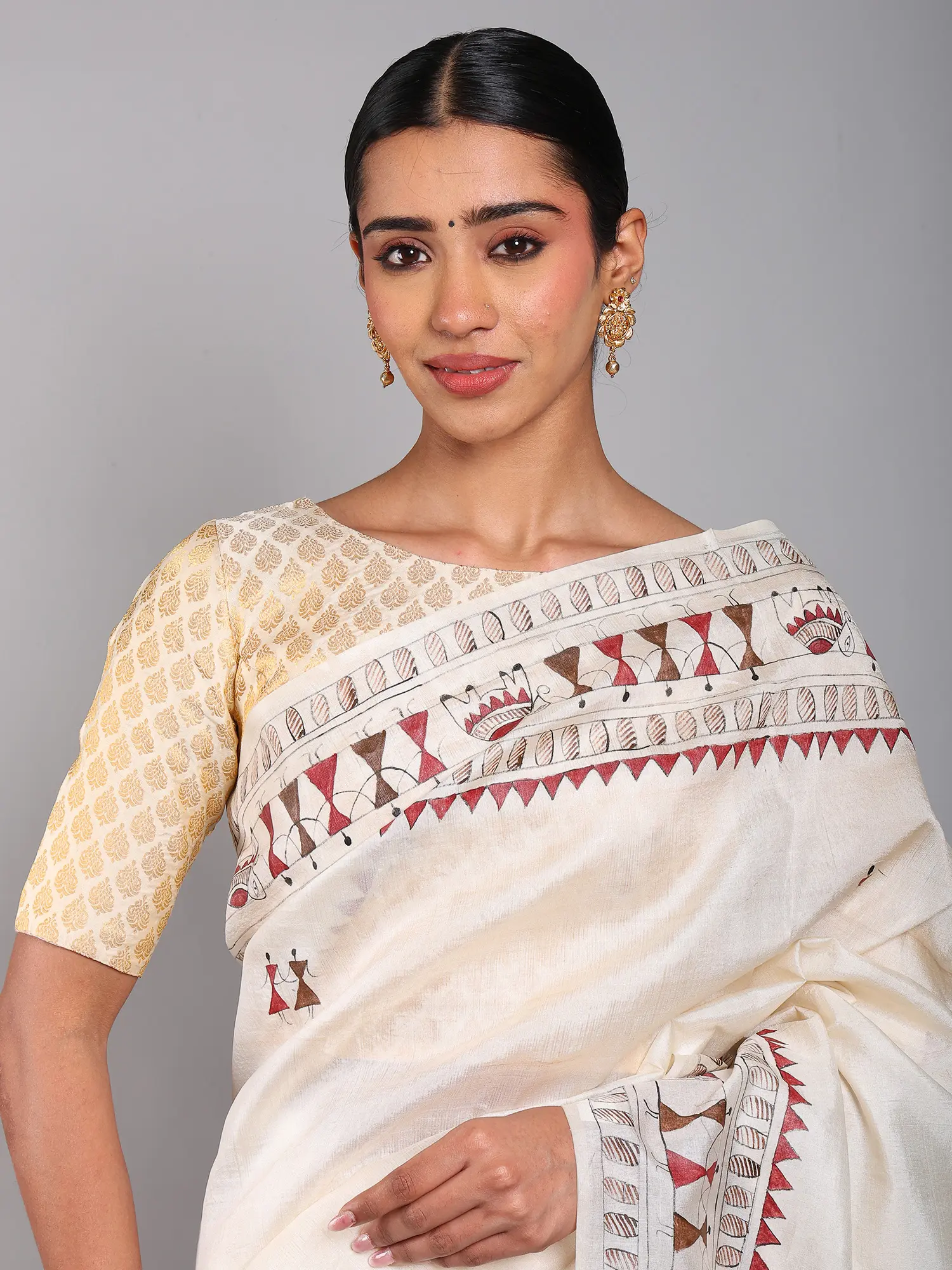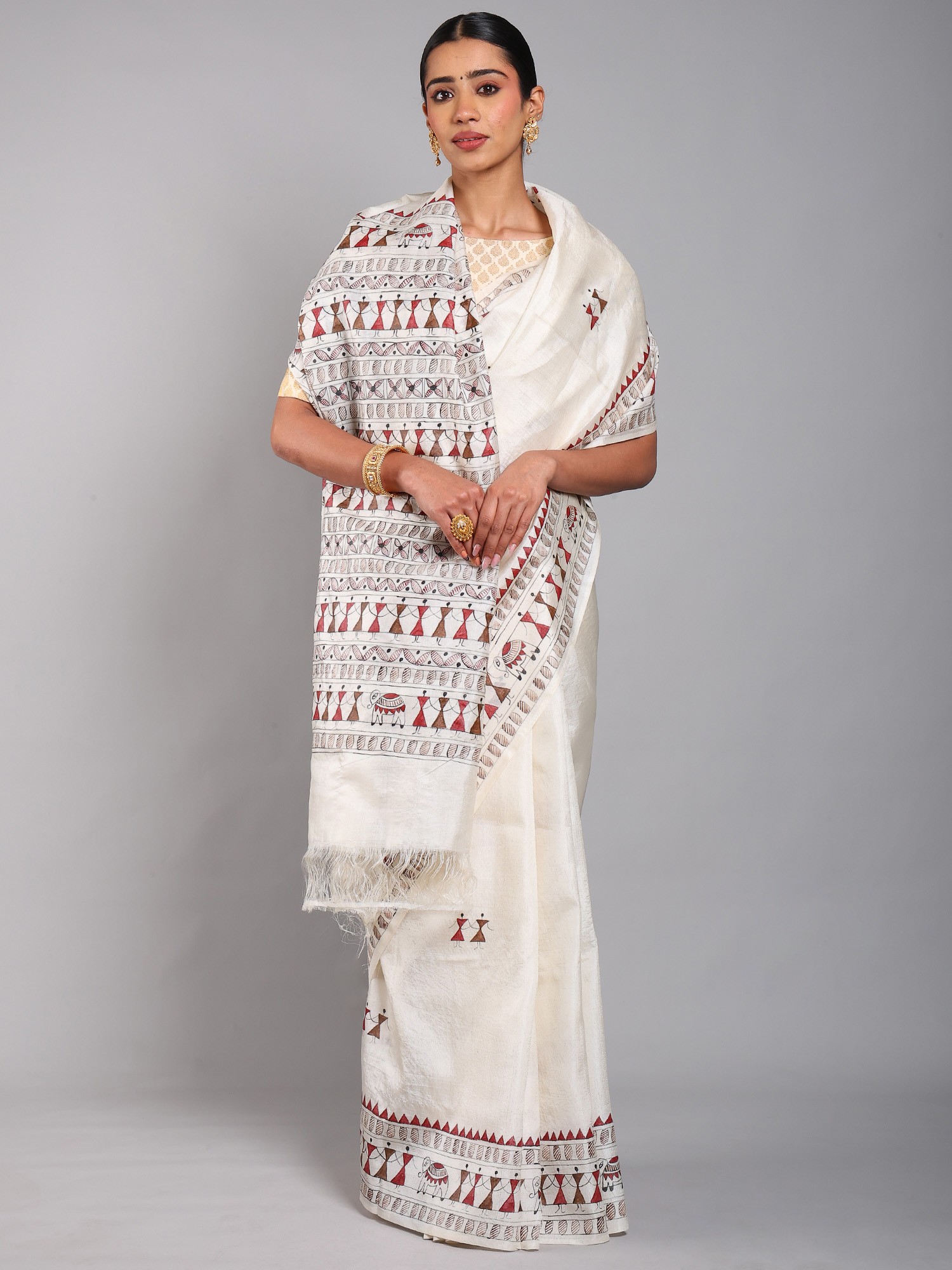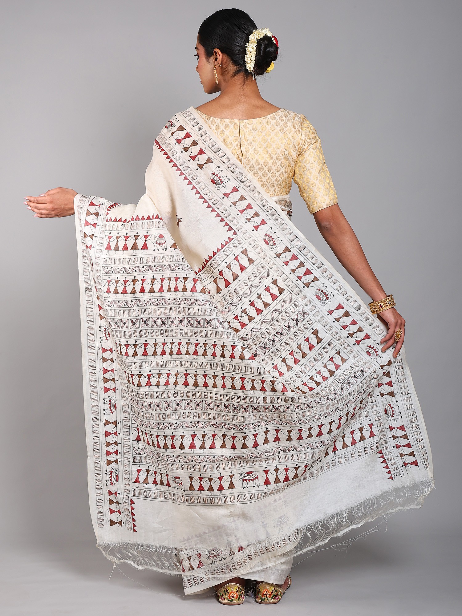 Beige-colored Warli Fabric with Block-Printed Chakra of Life