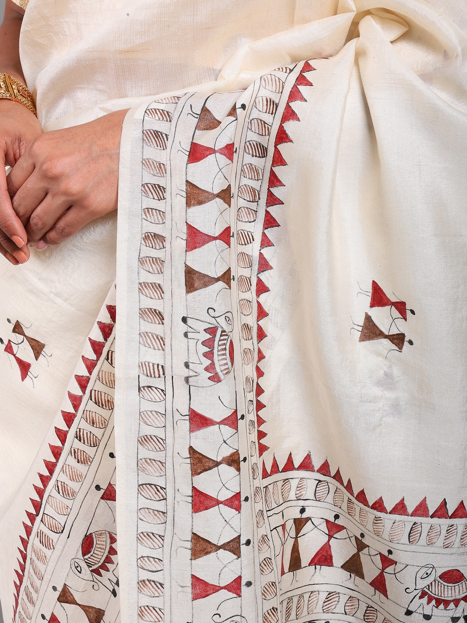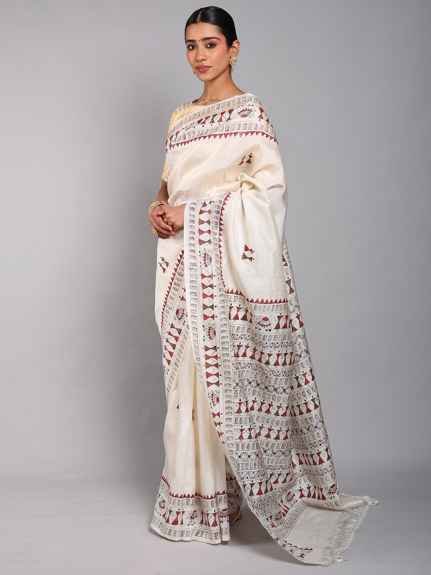 Lambs-Wool Nakshi Kantha Dupatta with Black Color Hand Embroidered Warli Inspired Motif