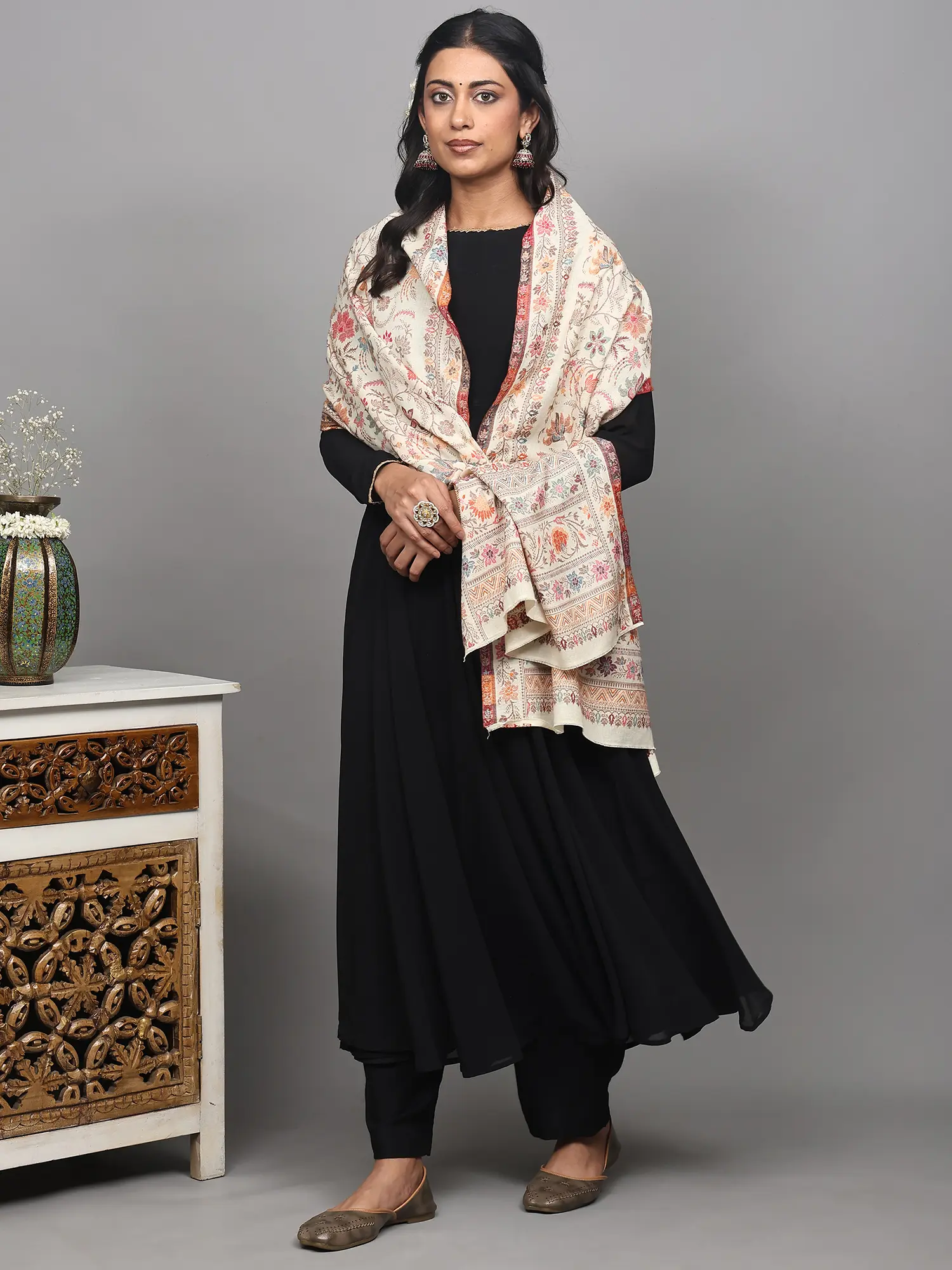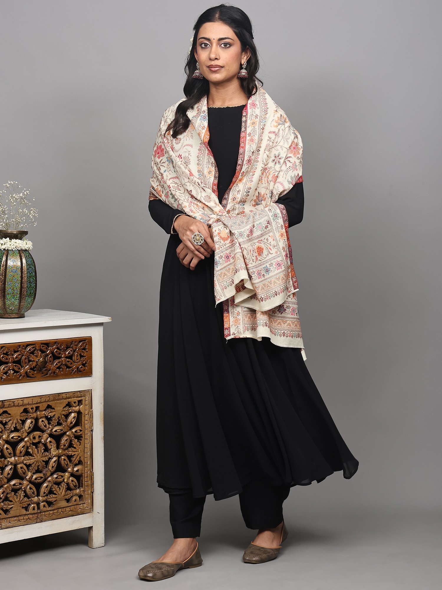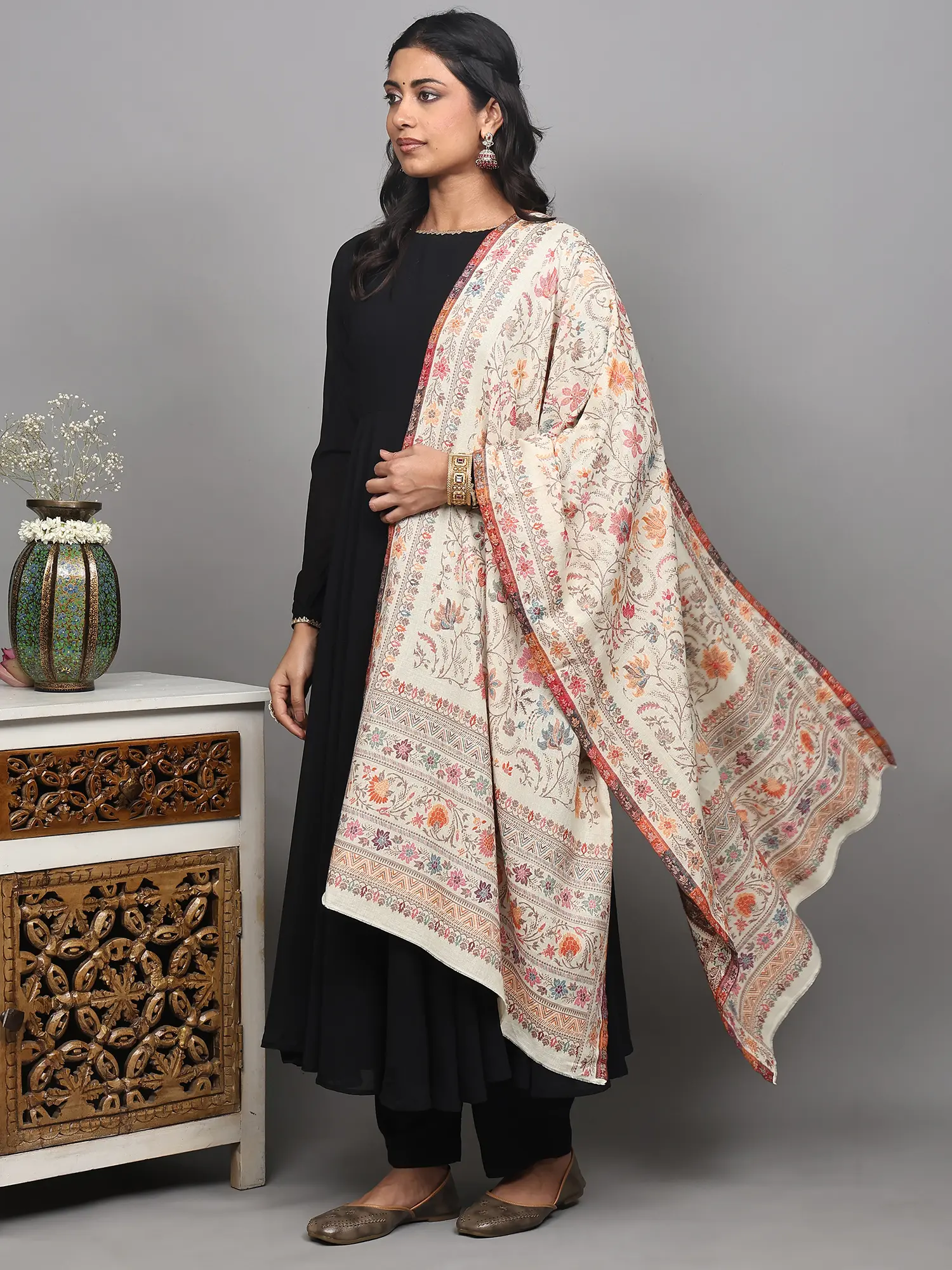 Fallen-Rock Wool Kullu Stole with Woven Triple Kinnauri Border in Multicolor