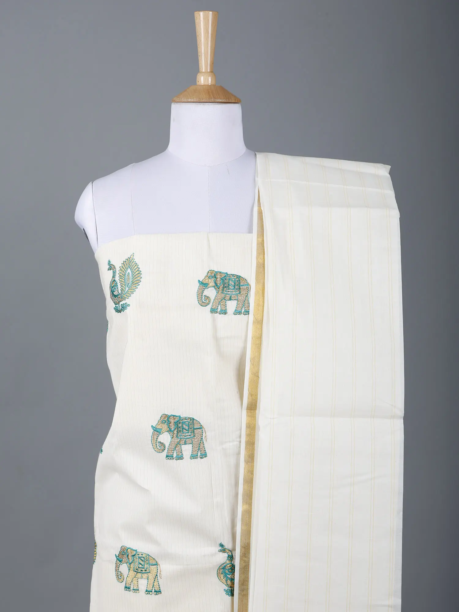 Solitary-Star Three Piece Kasavu Salwar Kameez Fabric with Dupatta from Kerala with Embroidered Peacocks and Elephants