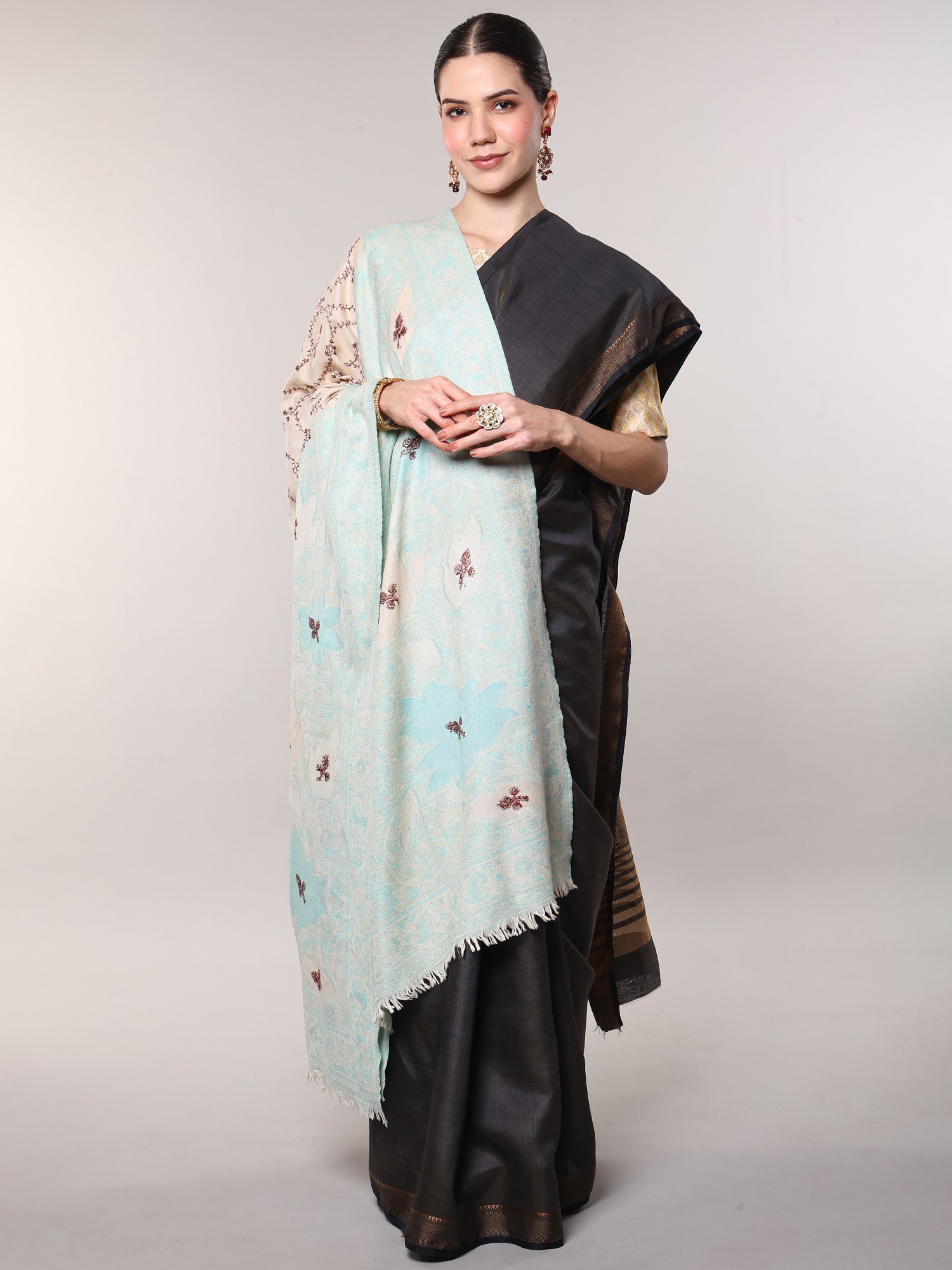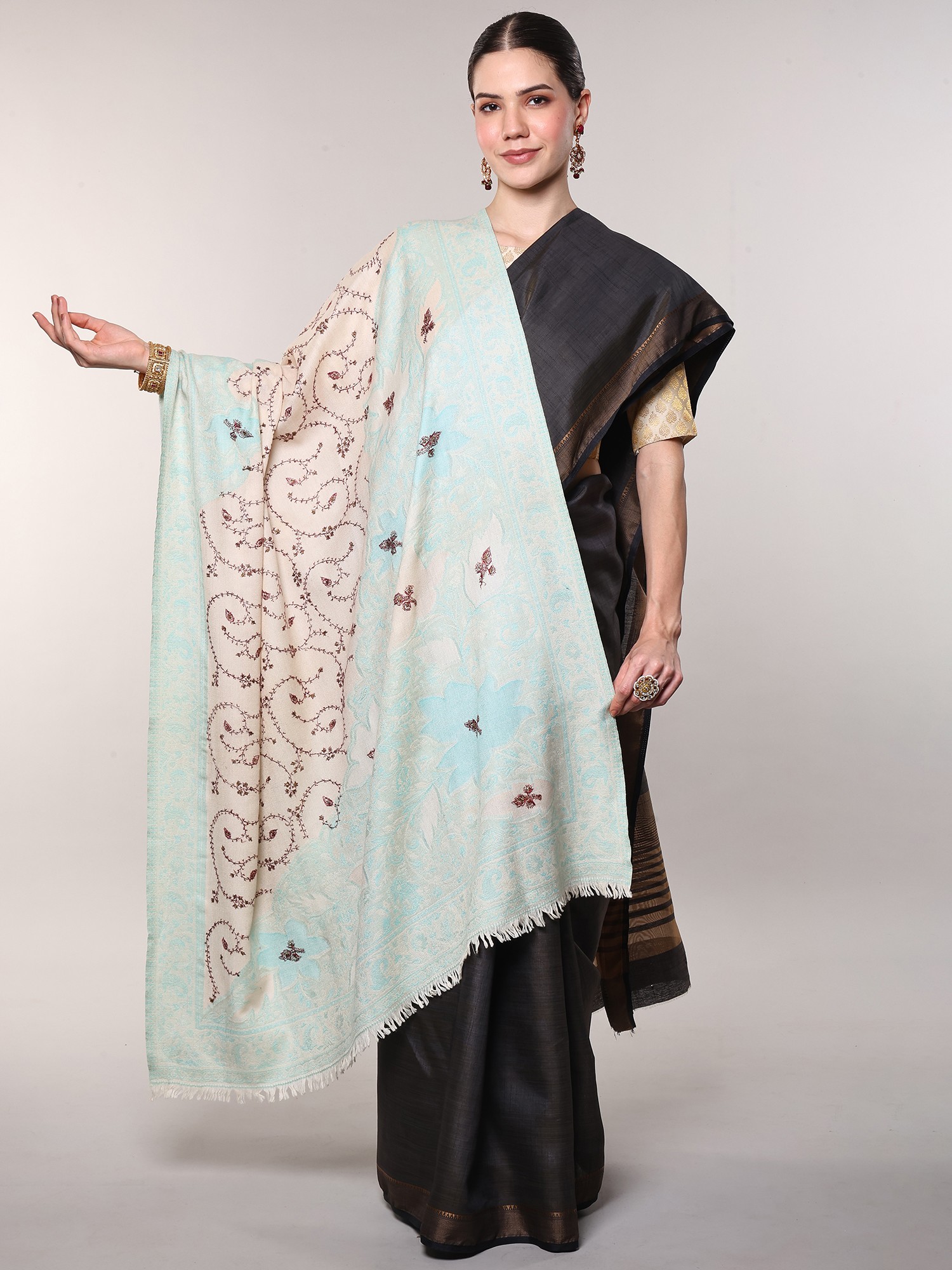 White-Swan Pure Pashmina Sozni Hand-Embroidered Aksi Butta Shawl