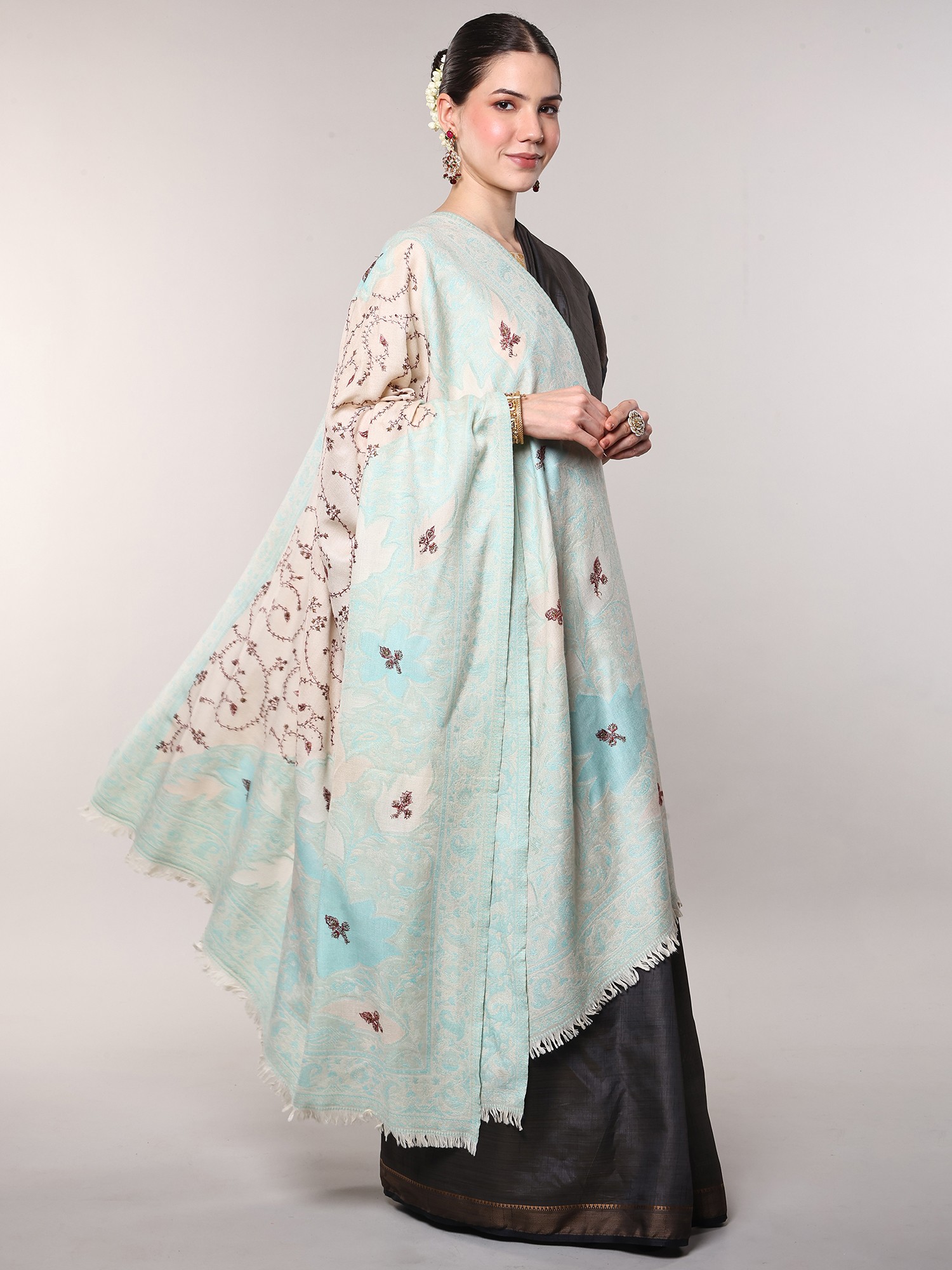 French-Oak Diamond Weaved Woolen Shawl with Sozni Embroidered Border