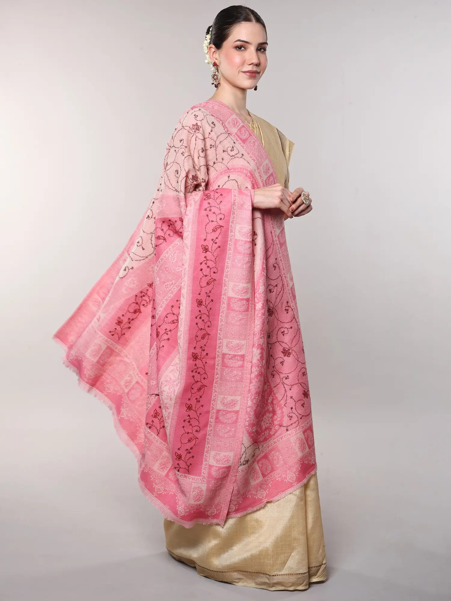 Slightly-Pink Sozni Embroidered Wool Shawl with Woven Giant Paisleys-Flowers