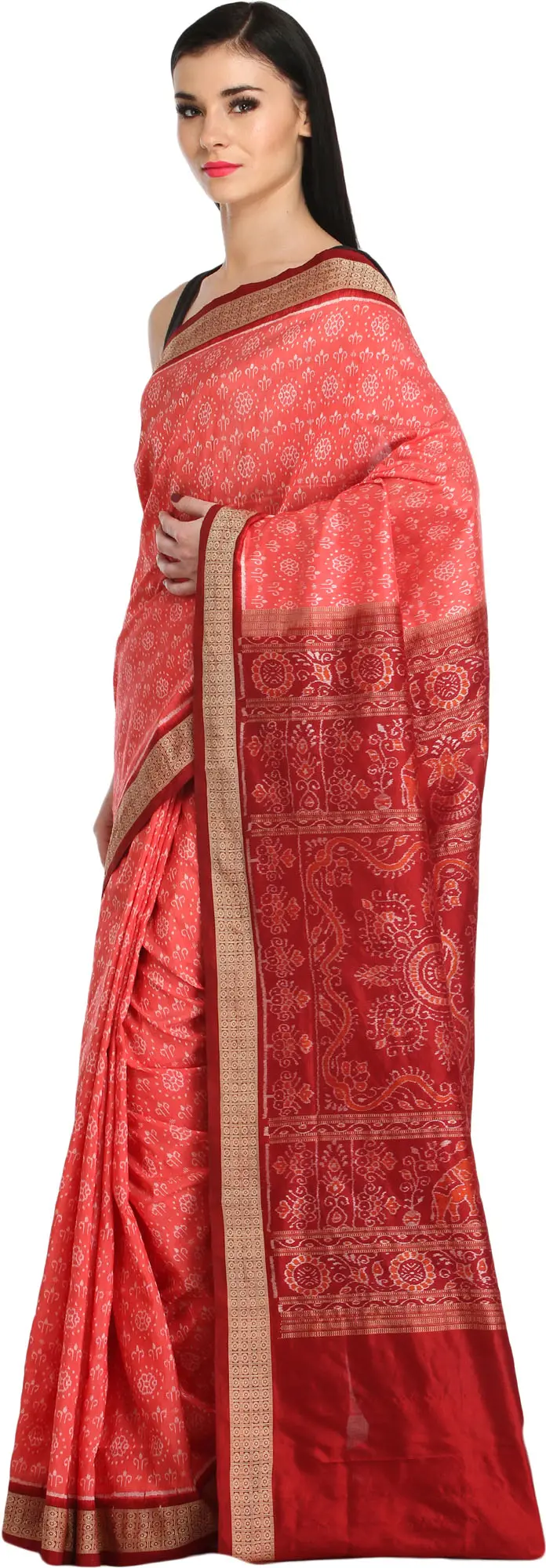 Tawny-Port Pure Cotton Ikat Handloom Saree from Sambhalpur with Woven Fish-Peacocks Wide Border