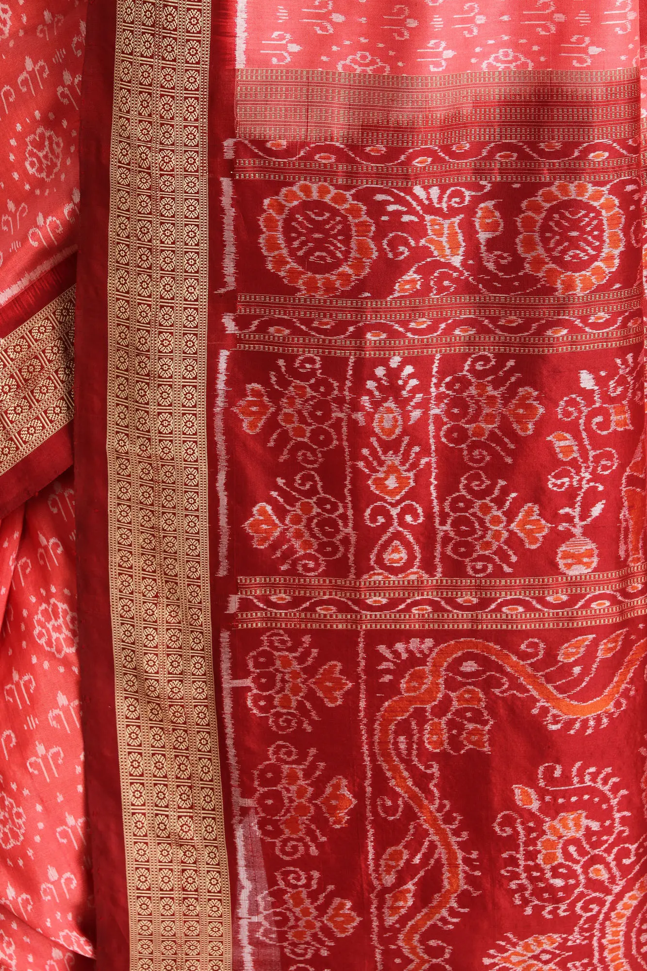 Russet-Orange Pure Cotton Ikat Handloom Saree with Rudraksha Border and Contrast Anchal from Sambhalpur