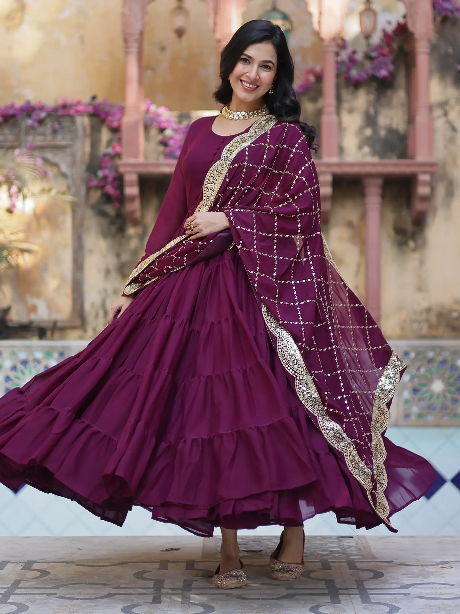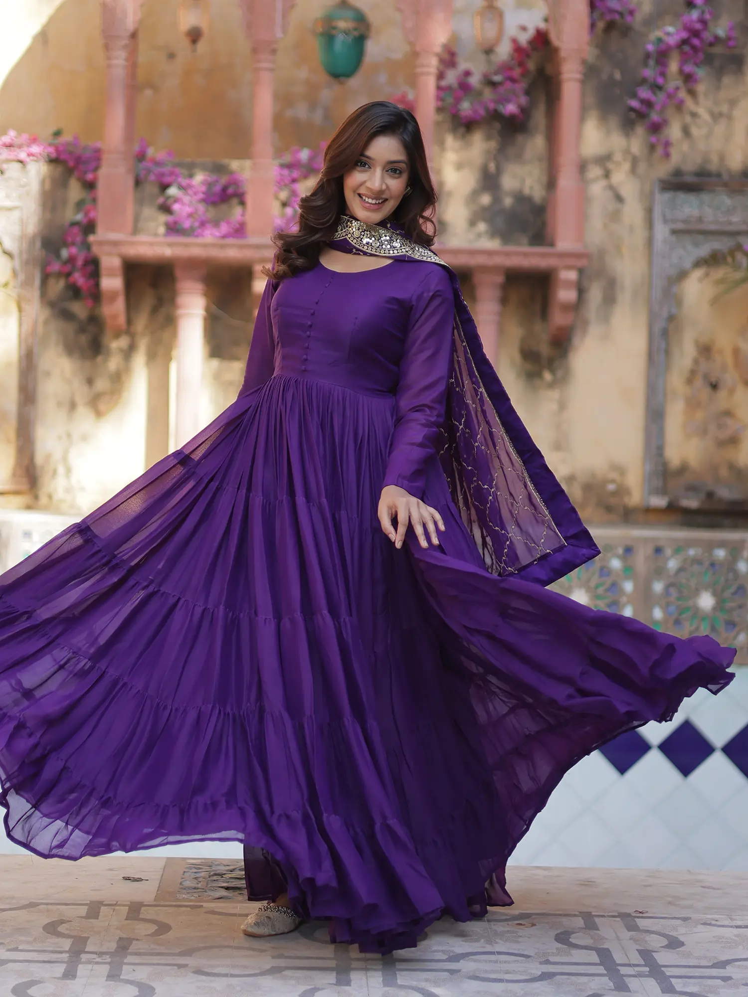 The floor-length flared gown is crafted from the finest Star Georgette fabric, renowned for its lightweight drape and ethereal feel. The fabric cascades beautifully, creating a mesmerizing silhouette that moves with every step. Intricate, tiered layers add depth and dimension, imbuing the gown with a voluminous flair that is both elegant and dramatic. The bodice features a classic round neckline and a row of delicate buttons, offering a subtle yet refined detail. The full-length sleeves provide a graceful coverage, ensuring comfort without compromising on style. This gown is a celebration of movement and form, designed to make you feel like the belle of any ball.