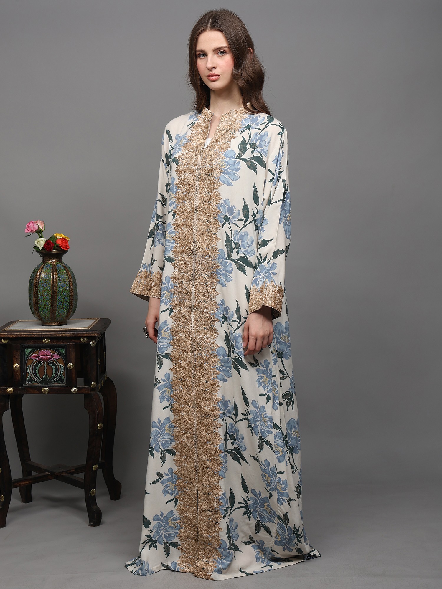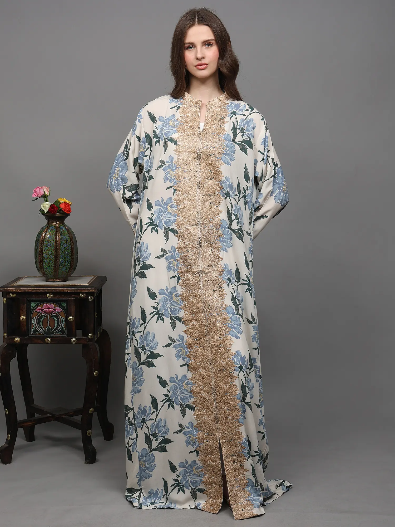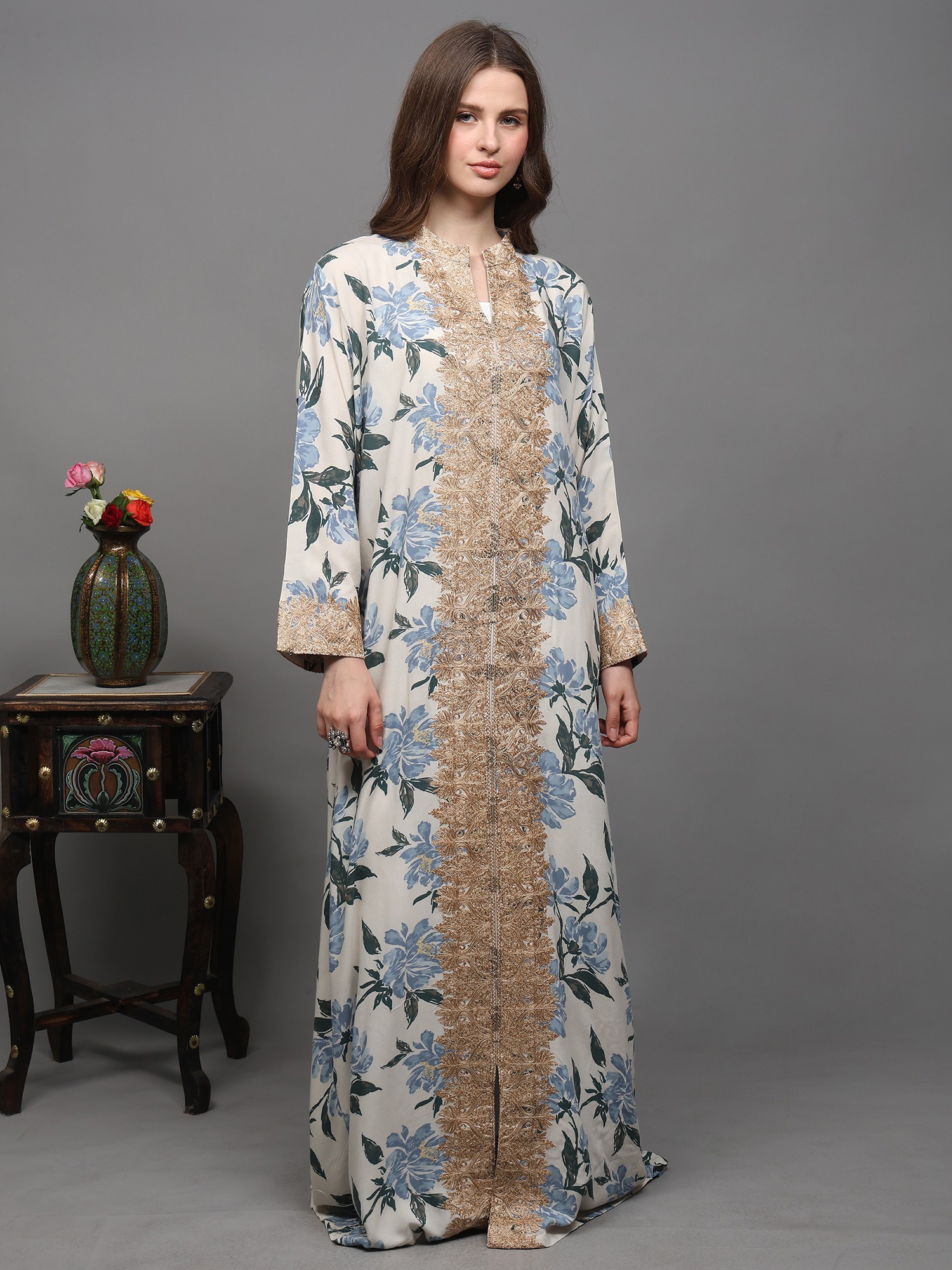 Pure White Floral Print Rayon Kashmiri Abaya with Fine Pastel Blue Print and Aari Embroidery