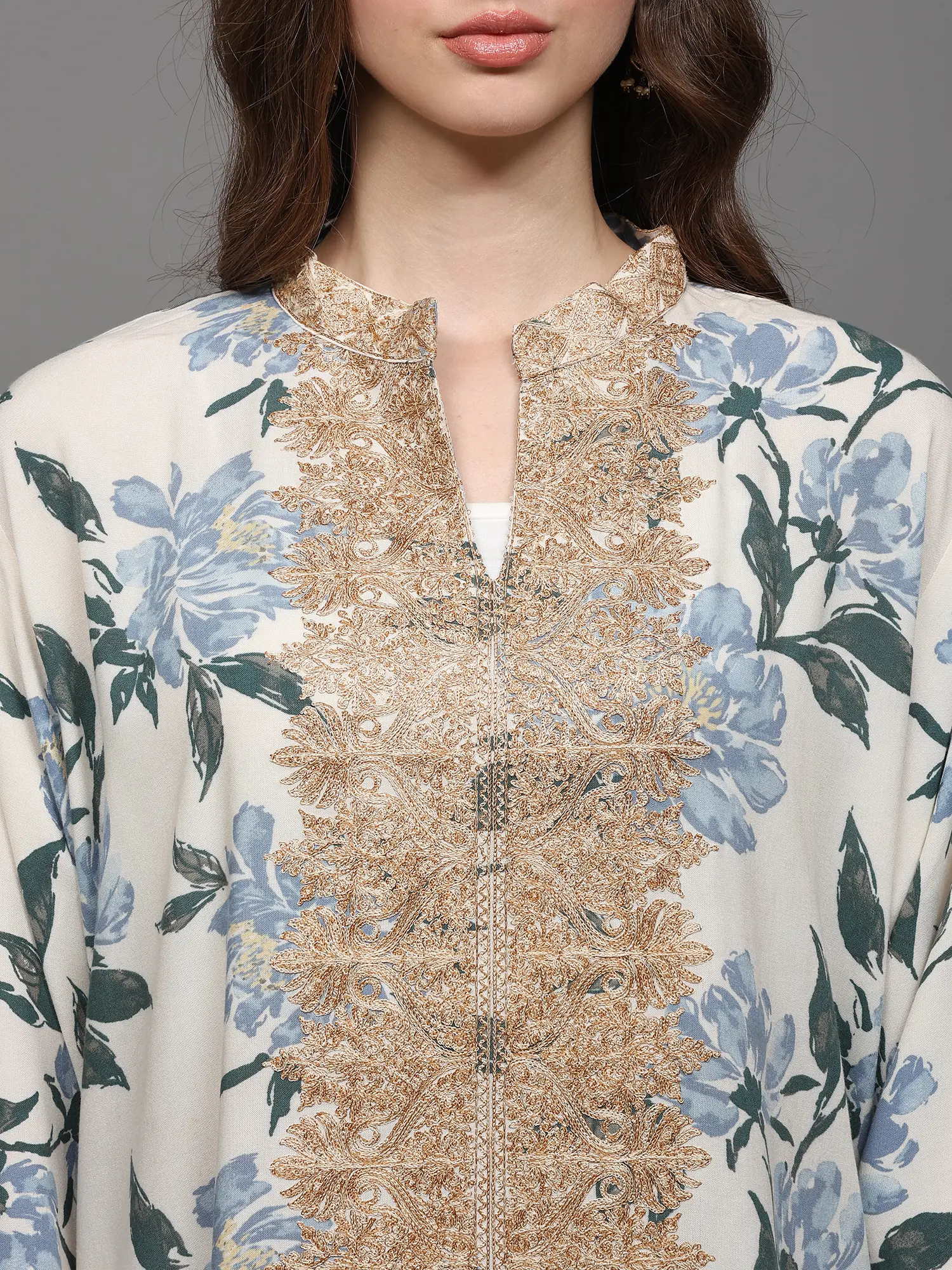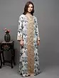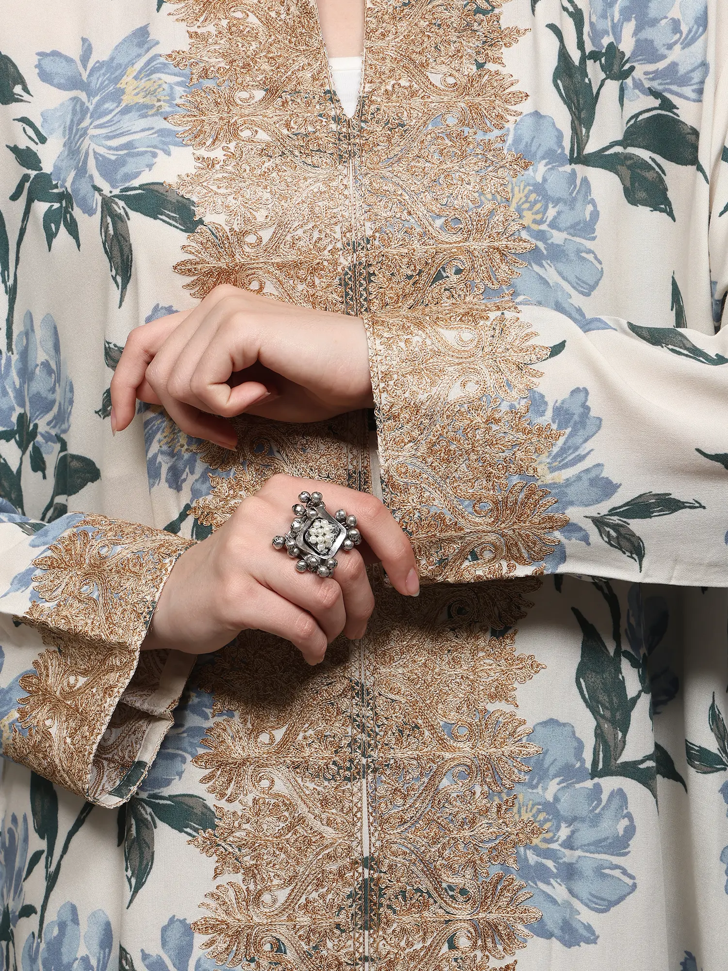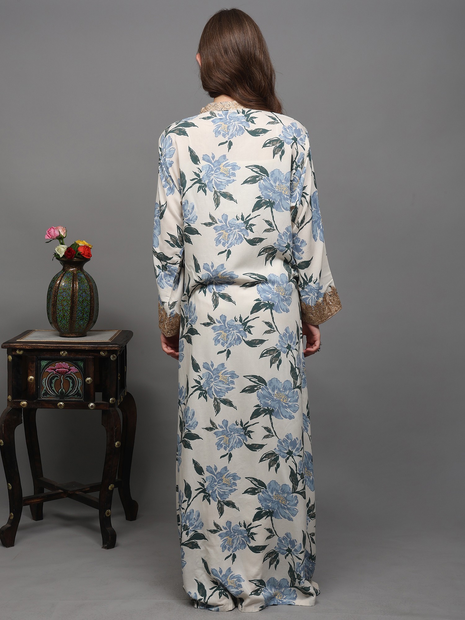 Pure White Floral Print Rayon Kashmiri Abaya with Fine Pastel Blue Print and Aari Embroidery