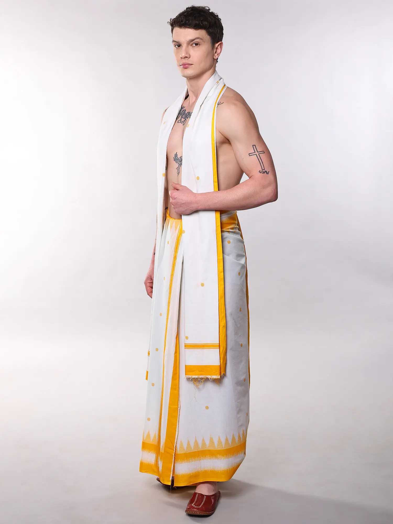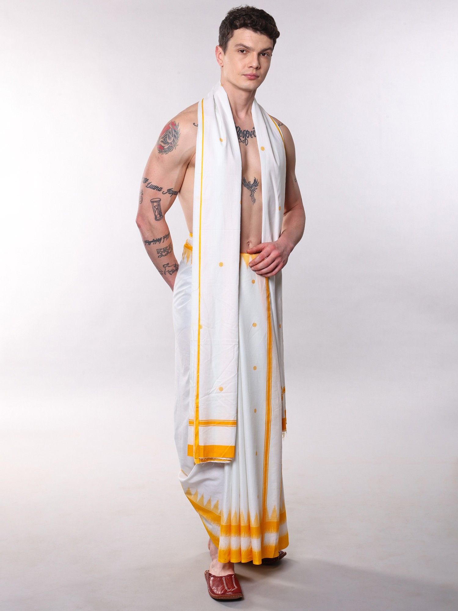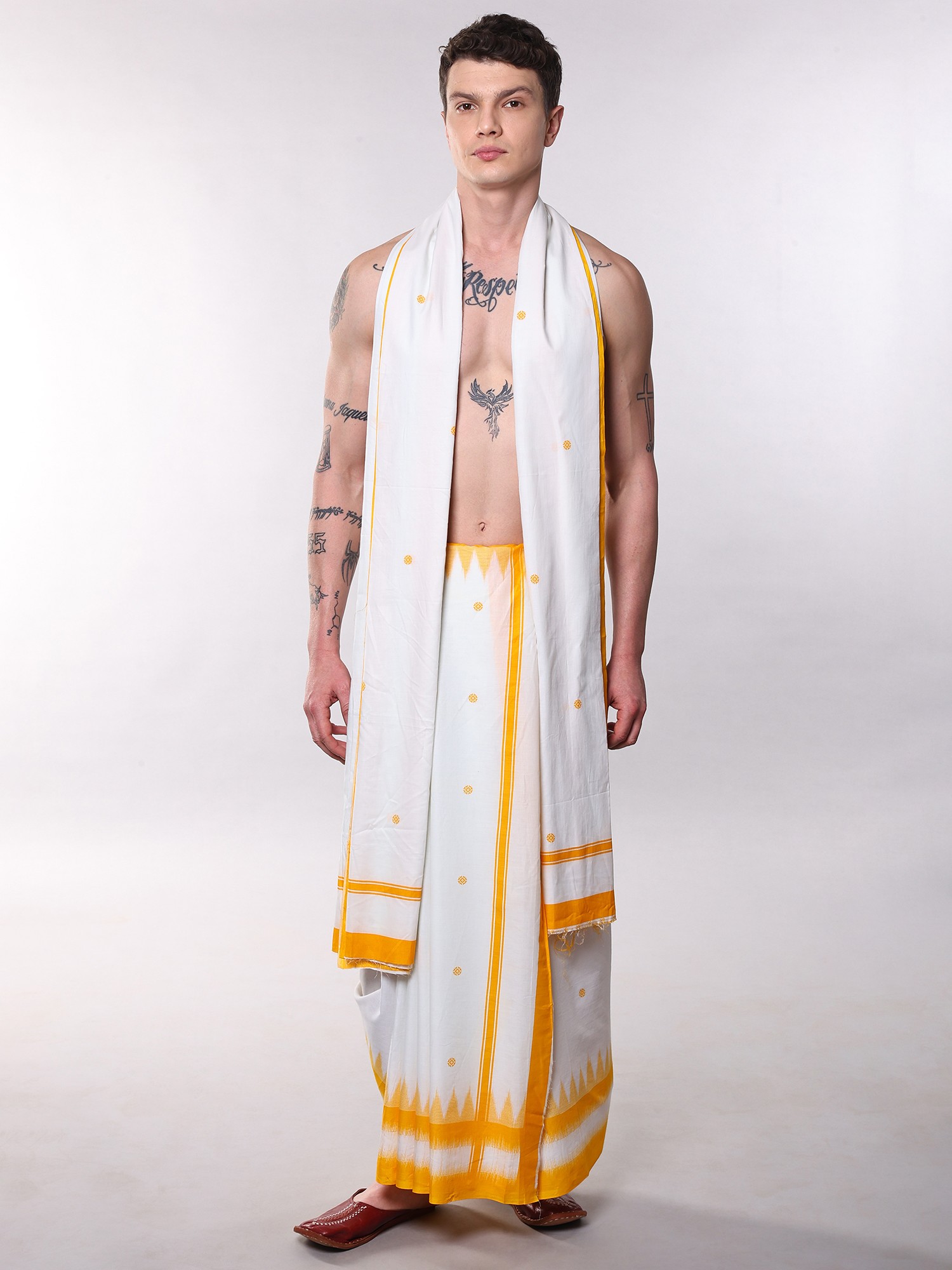 Star-White Cotton Dhoti and Angavastram Set with Printed Bootis & Temple Border