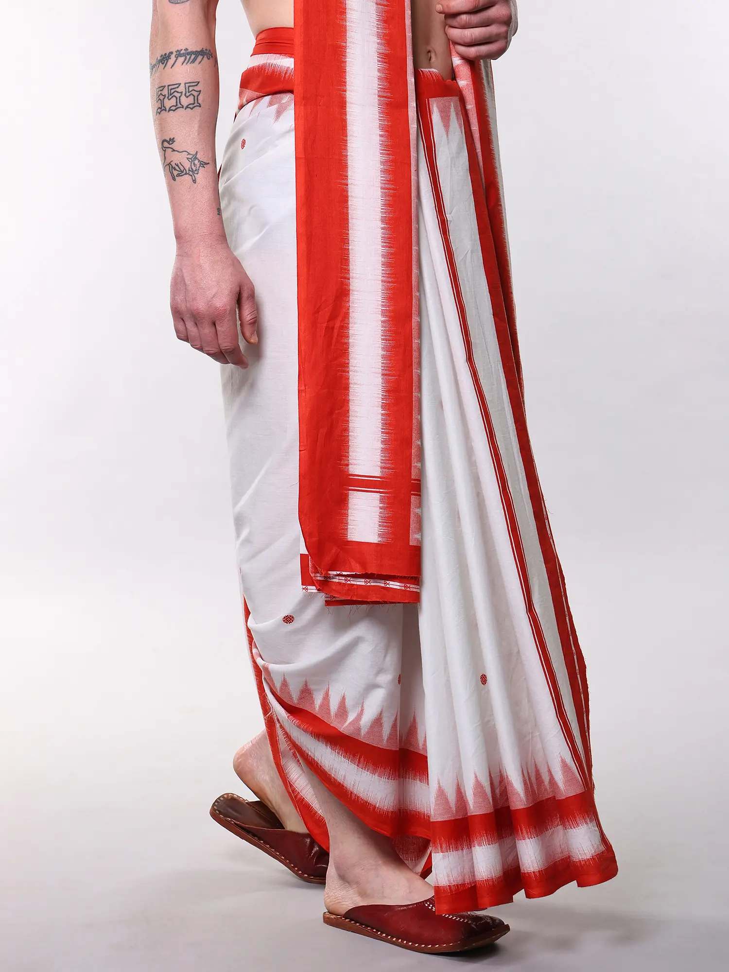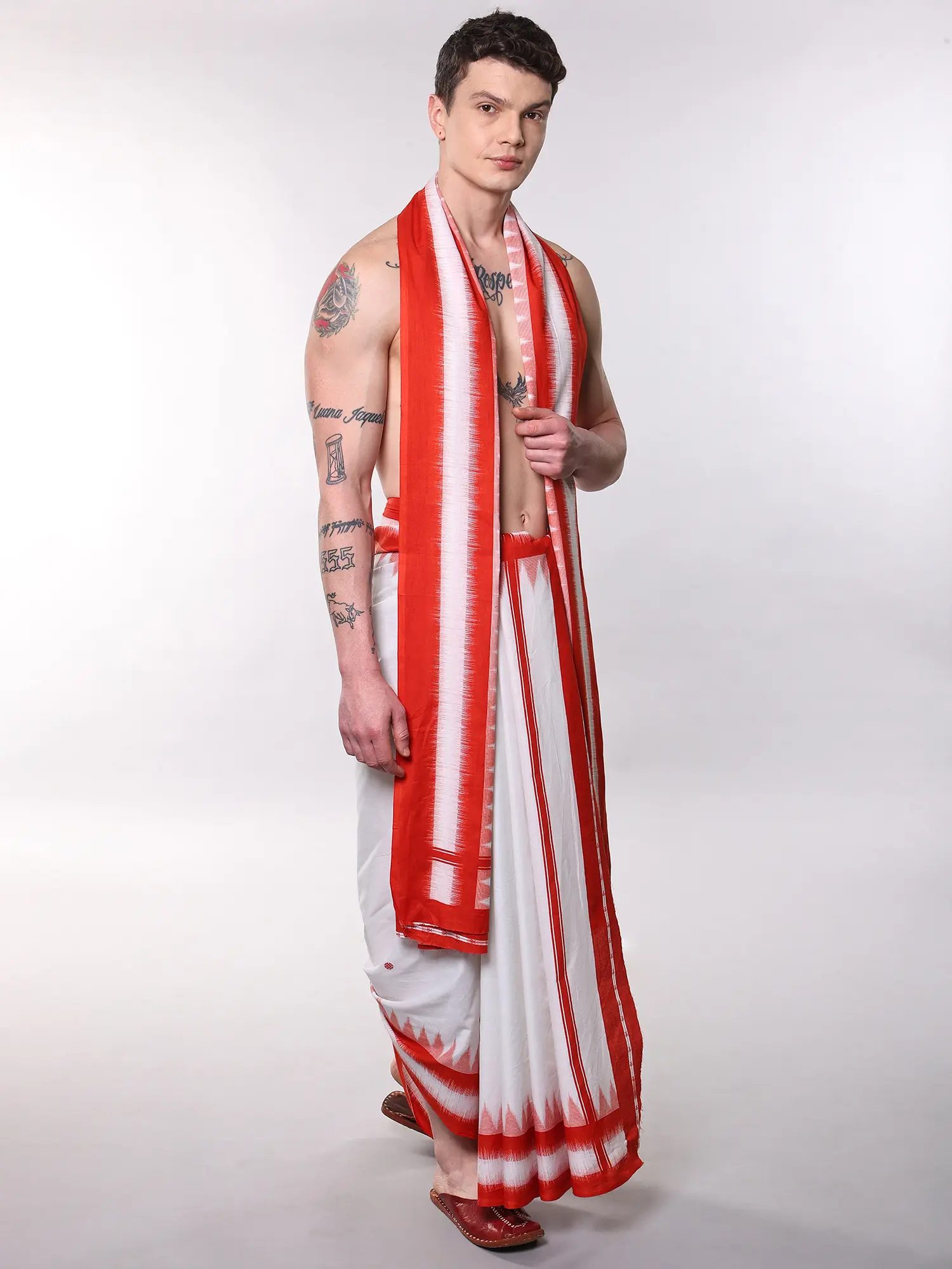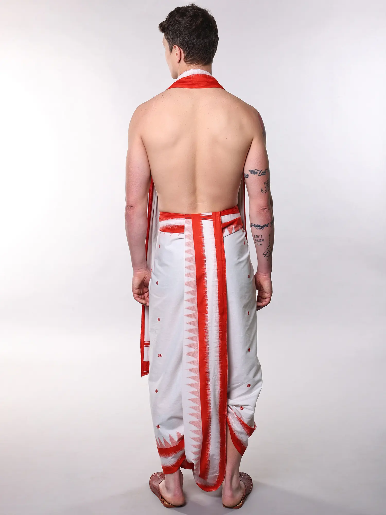 Star-White Cotton Dhoti and Angavastram Set with Printed Bootis & Temple Border