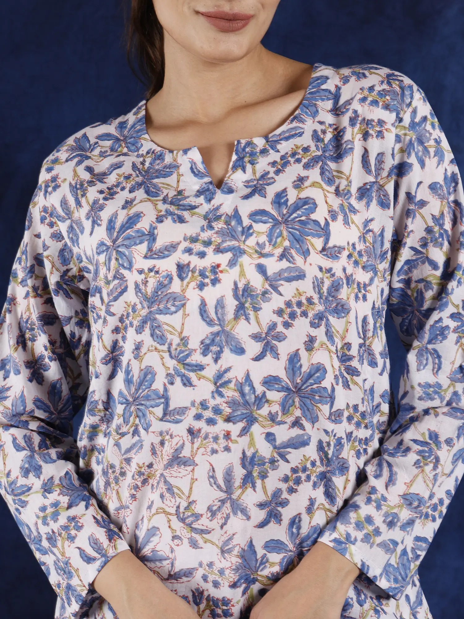 The fabric is made lovely with blooming blue flowers. A touch of utility comes from the side pockets, making this cotton co-ord a classy and comfy everyday wear.
