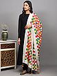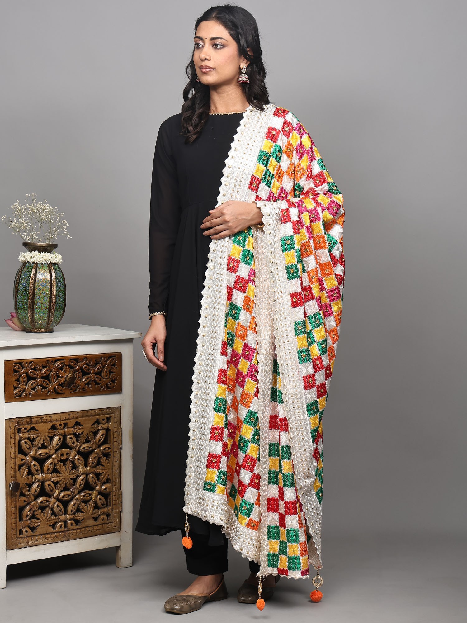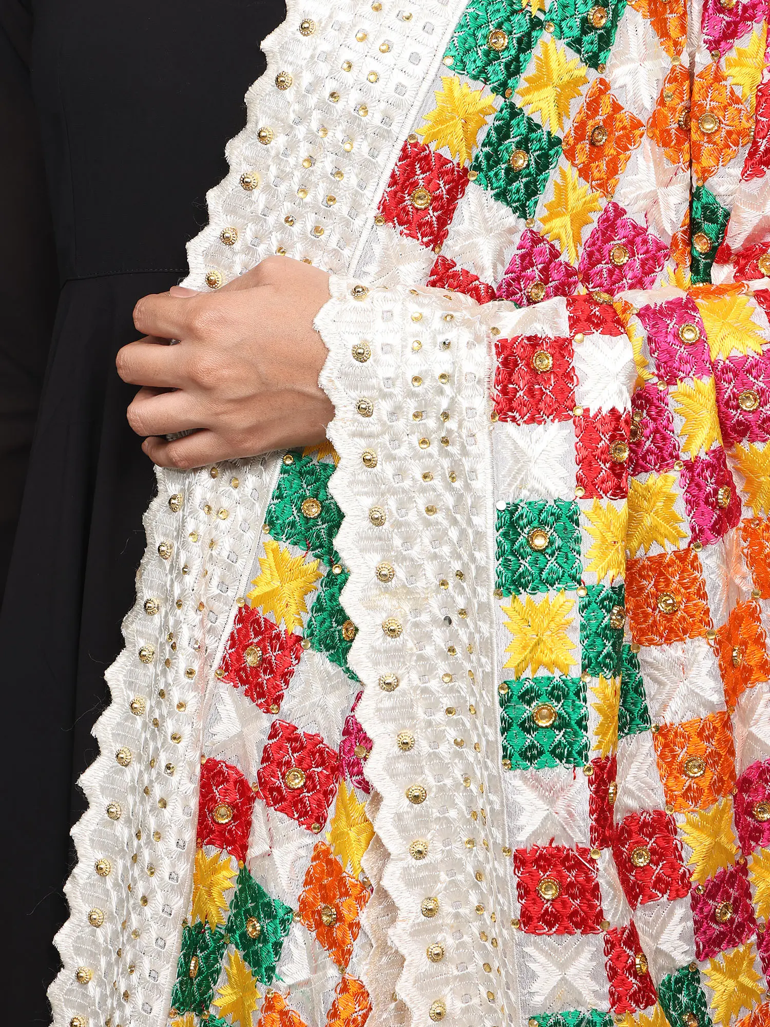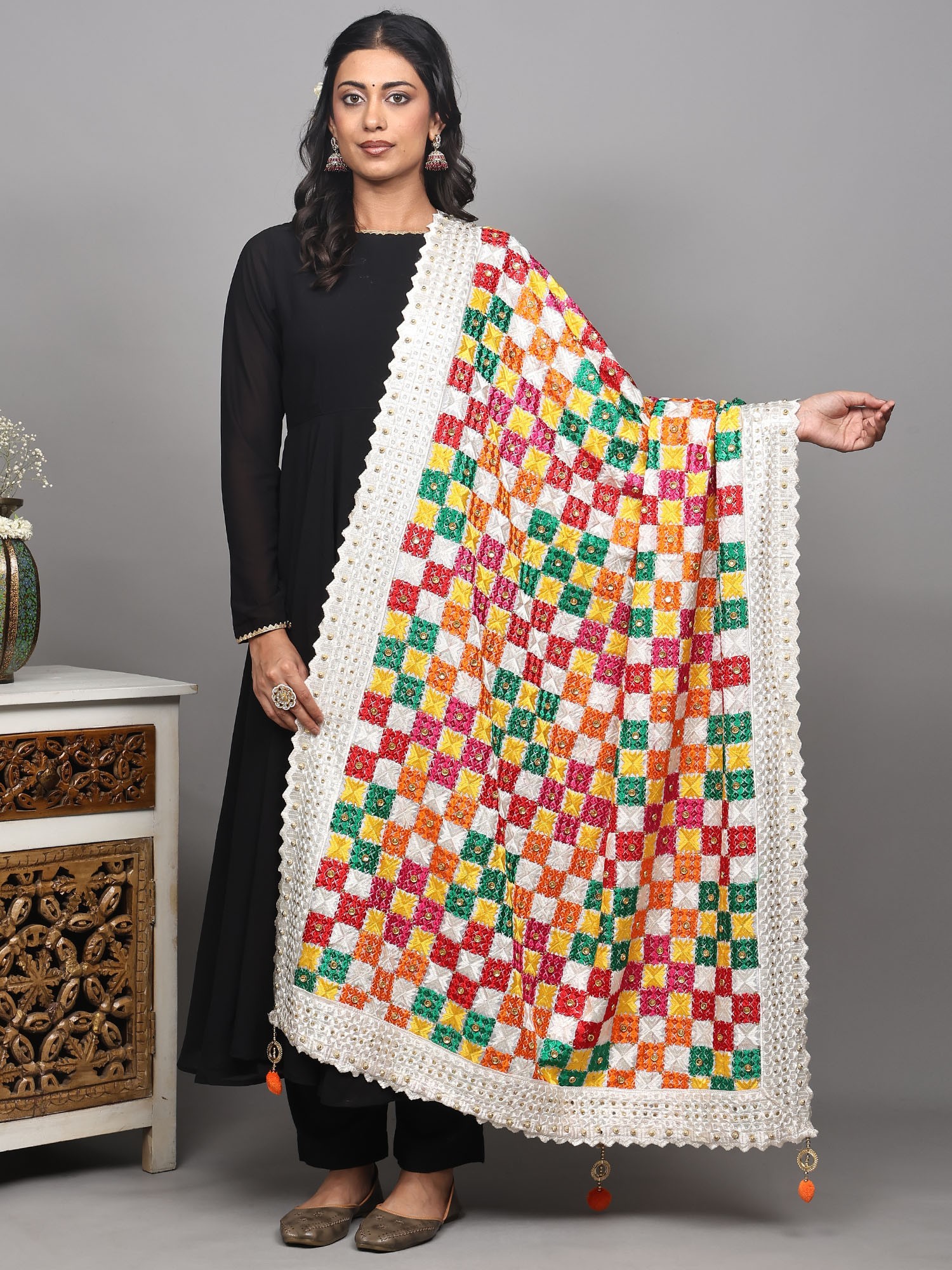 Star-White Phulkari Dupatta with Embroidered Floral Stripes in Multicolor Thread and Lace Border from Amritsar