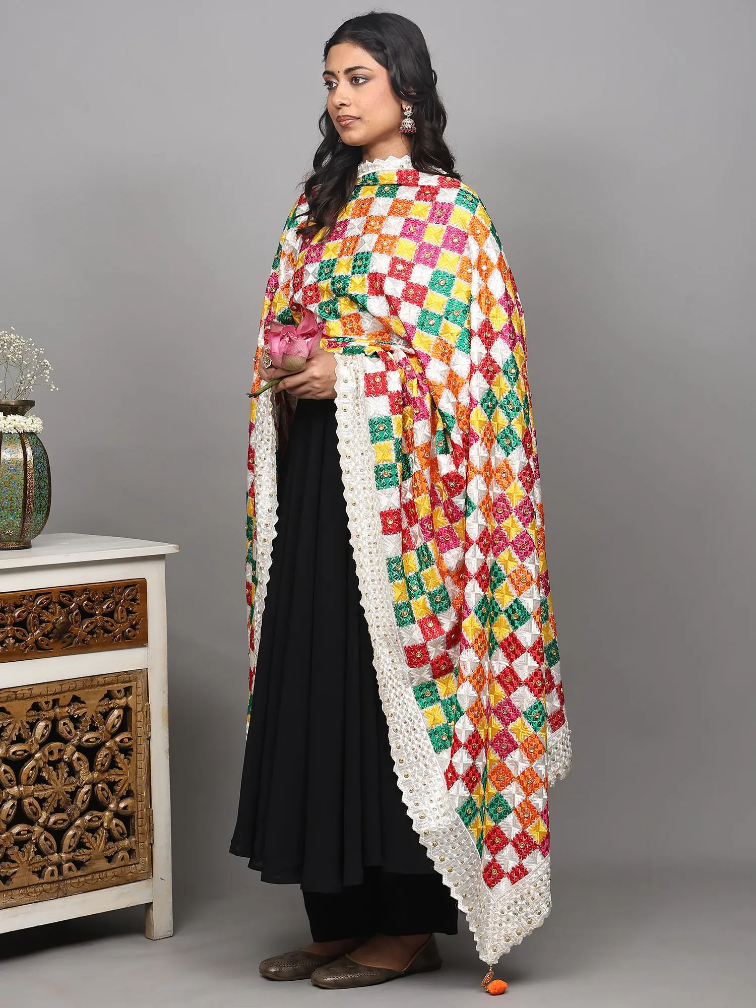 Multicolor Embroidered Phulkari Dupatta from Punjab with Mirrors and Beaded Zari Border