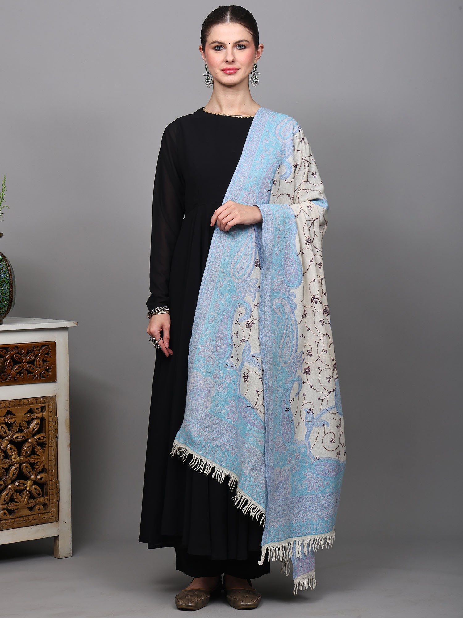 White-Onyx Reversible Two Ply Shawl with Woven Paisleys and Floral Sprigs