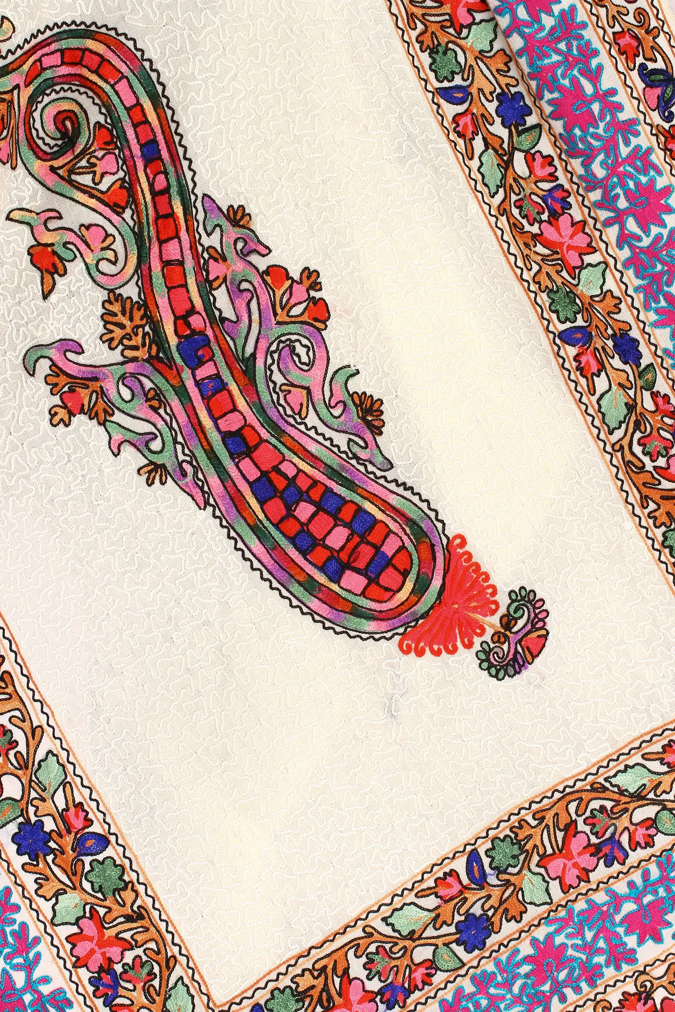 Indulge in the exquisite beauty of this pure wool stole, a testament to the rich artisanal heritage of Amritsar. The serene, star-white base of this stole provides a perfect canvas for the vibrant, multicolor Aari embroidery that adorns its borders and a prominent paisley motif. This is more than just an accessory; it's a wearable piece of art, meticulously handcrafted to elevate your style and bring a touch of timeless elegance to any ensemble.