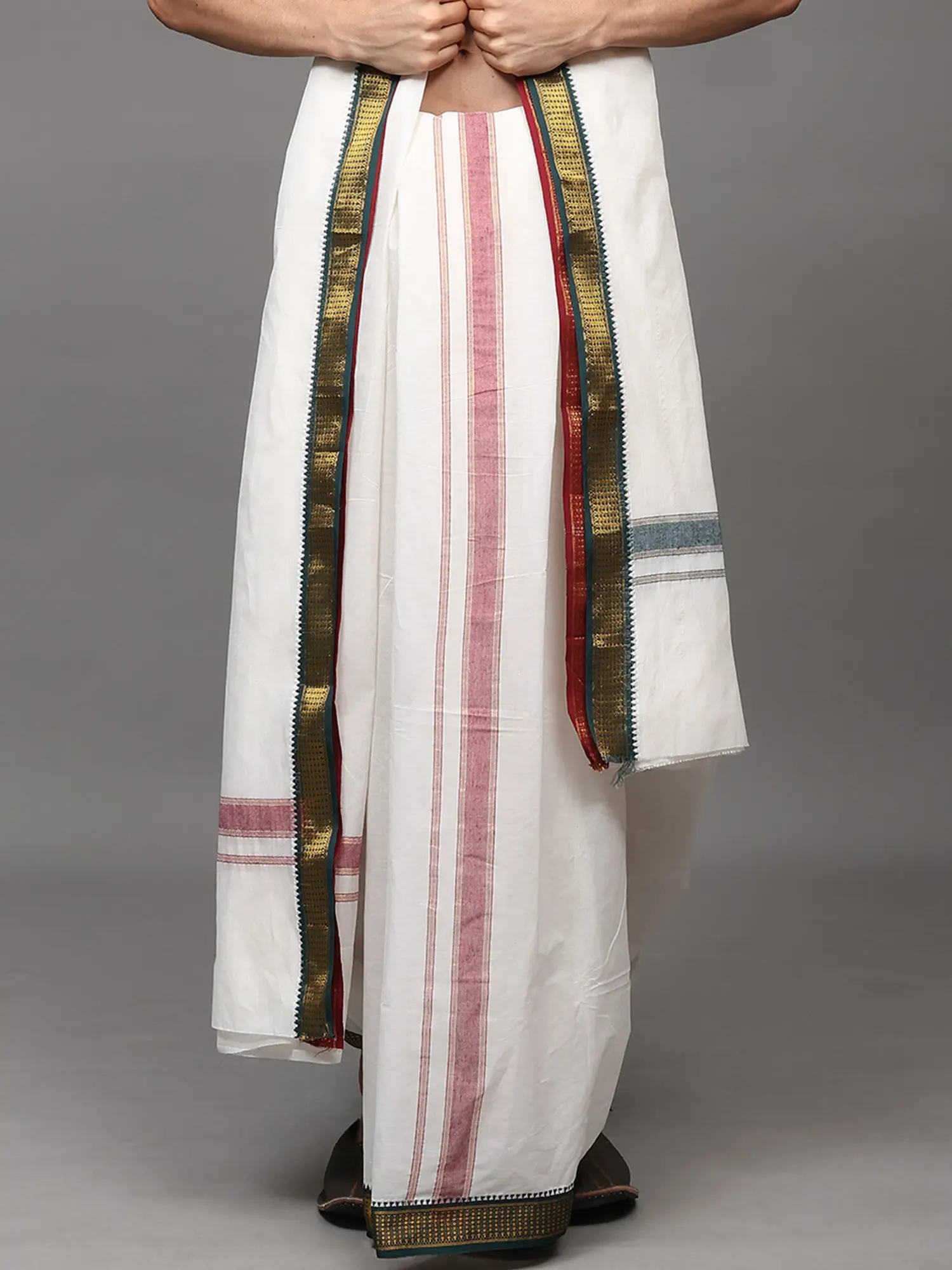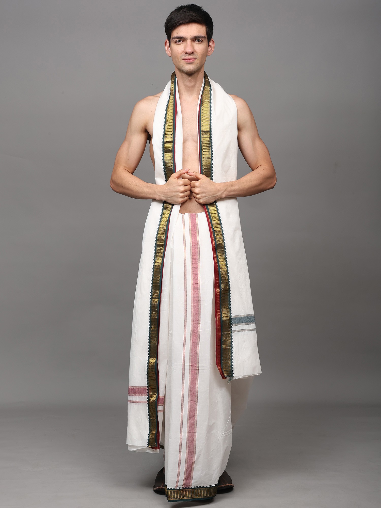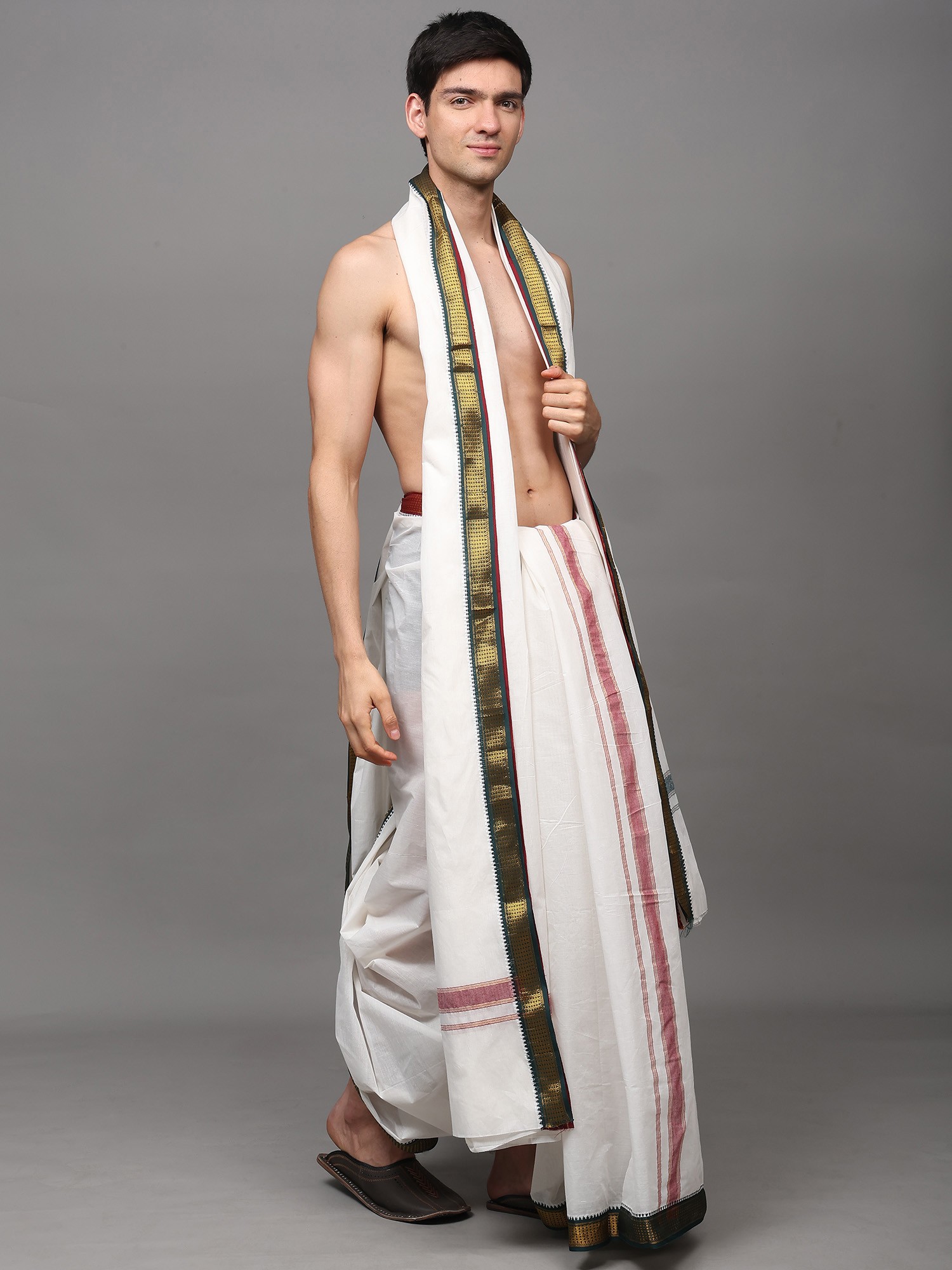 Snow-White Cotton Dhoti and Veshti Ready To Wear Set with Rich Broad Zari Woven Border