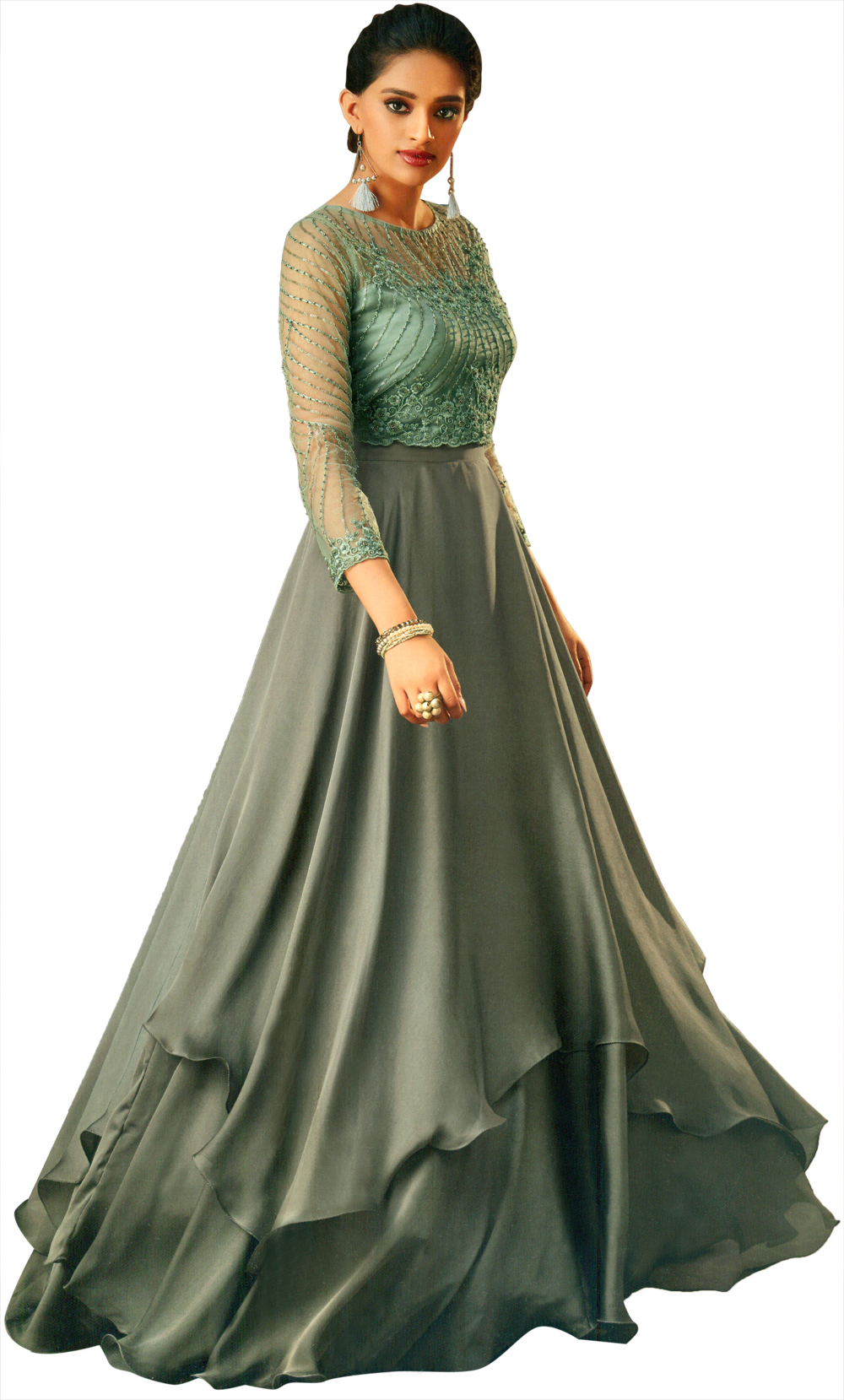 We all know that fashion trends are never constant and are always changing with time and to compete with this contemporary fashion era, we have for you this stylized and royal westernized lehenga. Although its colors are not like the evergreen red, yellow, green etc color type, but the unique colored fabric make it a perfect wear for evening functions. The sober and subtle taste of fabric and style enhances the richness and elegance of this lehenga cum evening gown. The crop top is woven on a Bristol blue art silk fabric veiled with a net till the neck, also forming long sleeves. The intense floral embroidery and an elegant work of beads and stones on the top, gives a rich look to the complete attire.