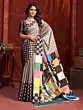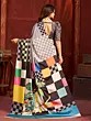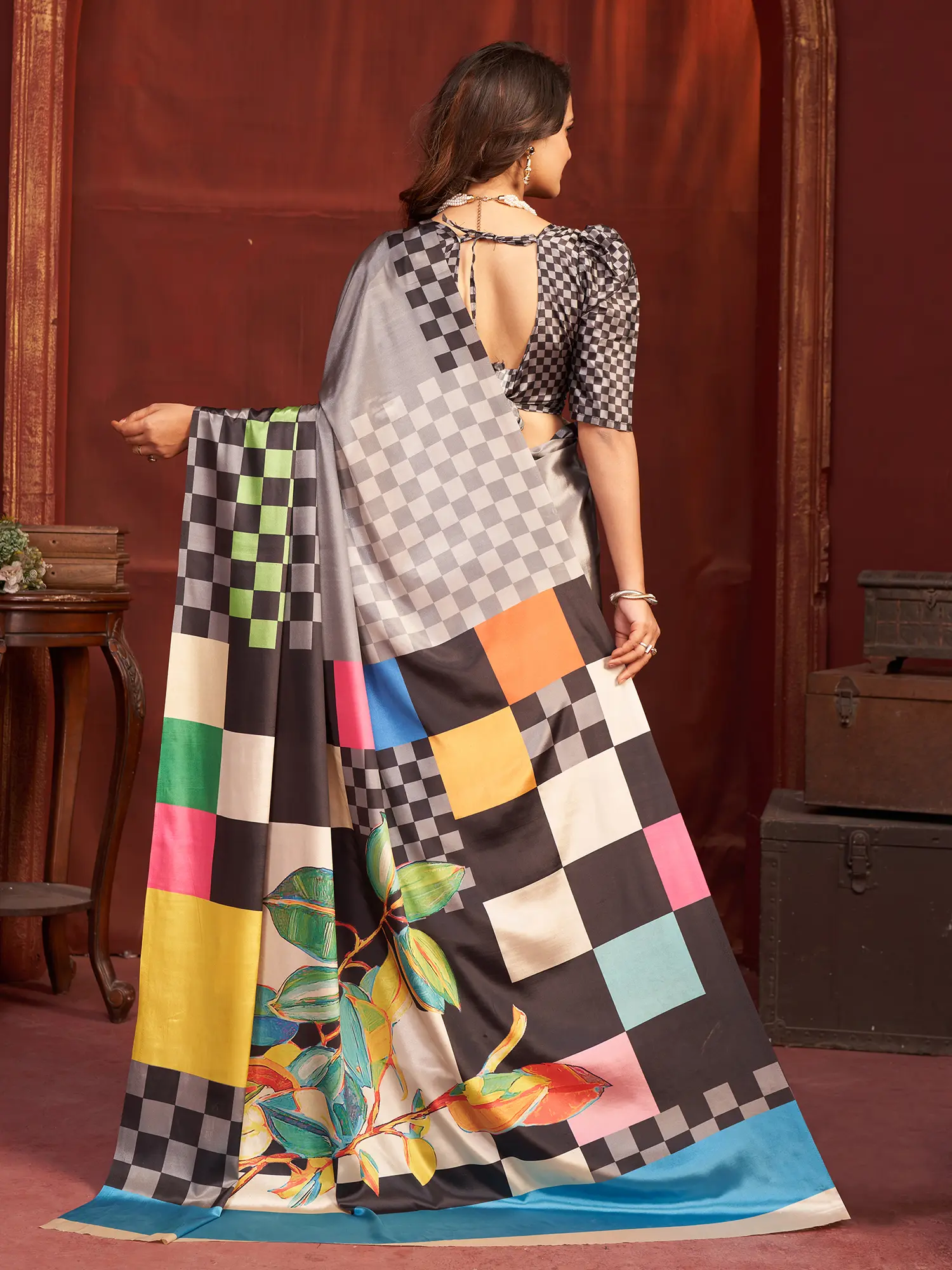 The true magic of this saree lies in its captivating print. A dynamic interplay of geometric checks in shades of grey and black forms the foundation, creating a modern and graphic appeal. This is beautifully juxtaposed with a vibrant and artistic floral motif that bursts with life. Imagine lush leaves and blooming flowers rendered in a riot of colors – emerald greens, sunshine yellows, playful pinks, and striking blues – all set against a contrasting backdrop. This bold yet artful combination ensures all eyes will be on you, making it an unforgettable addition to your wardrobe.