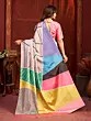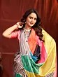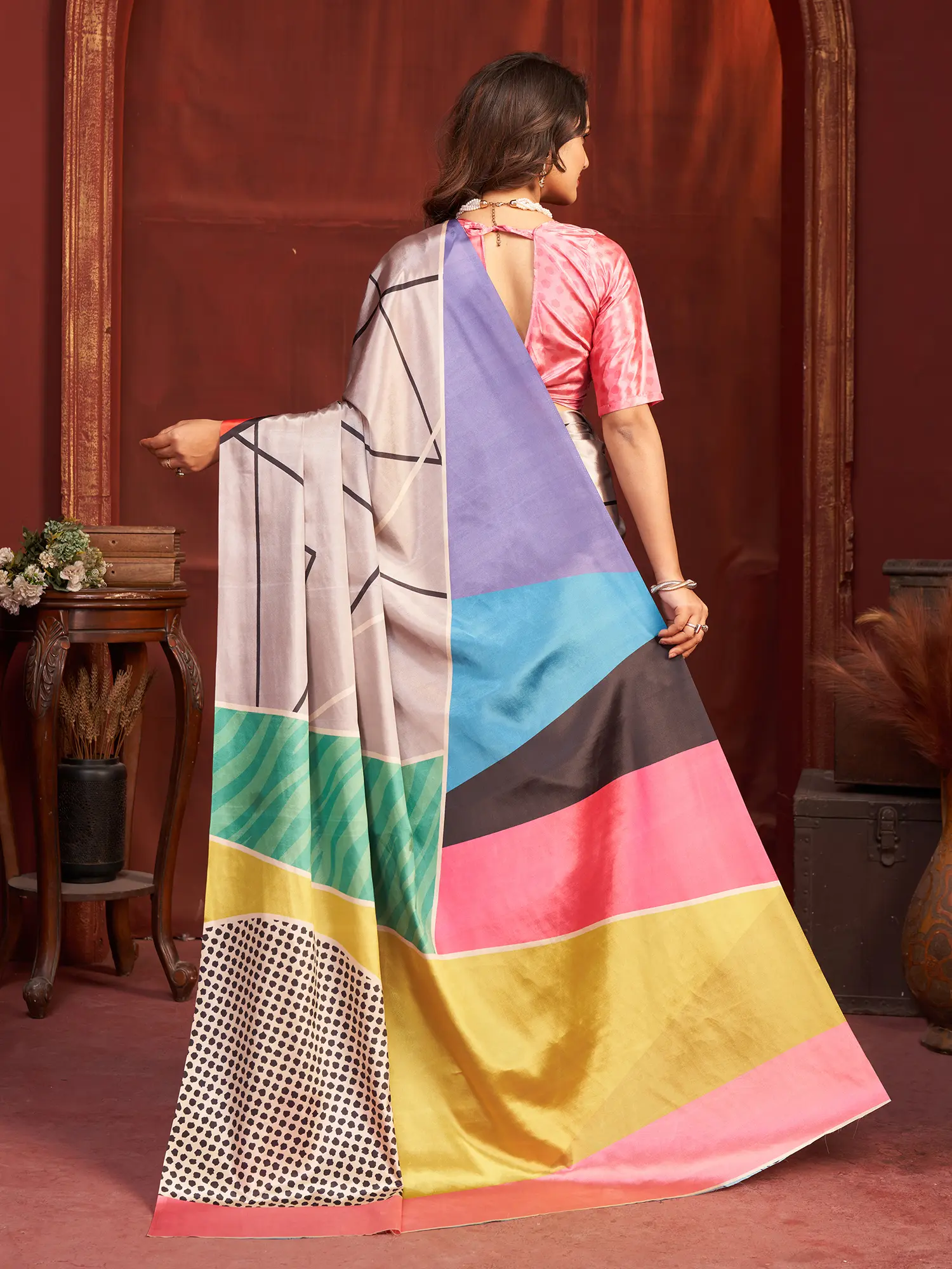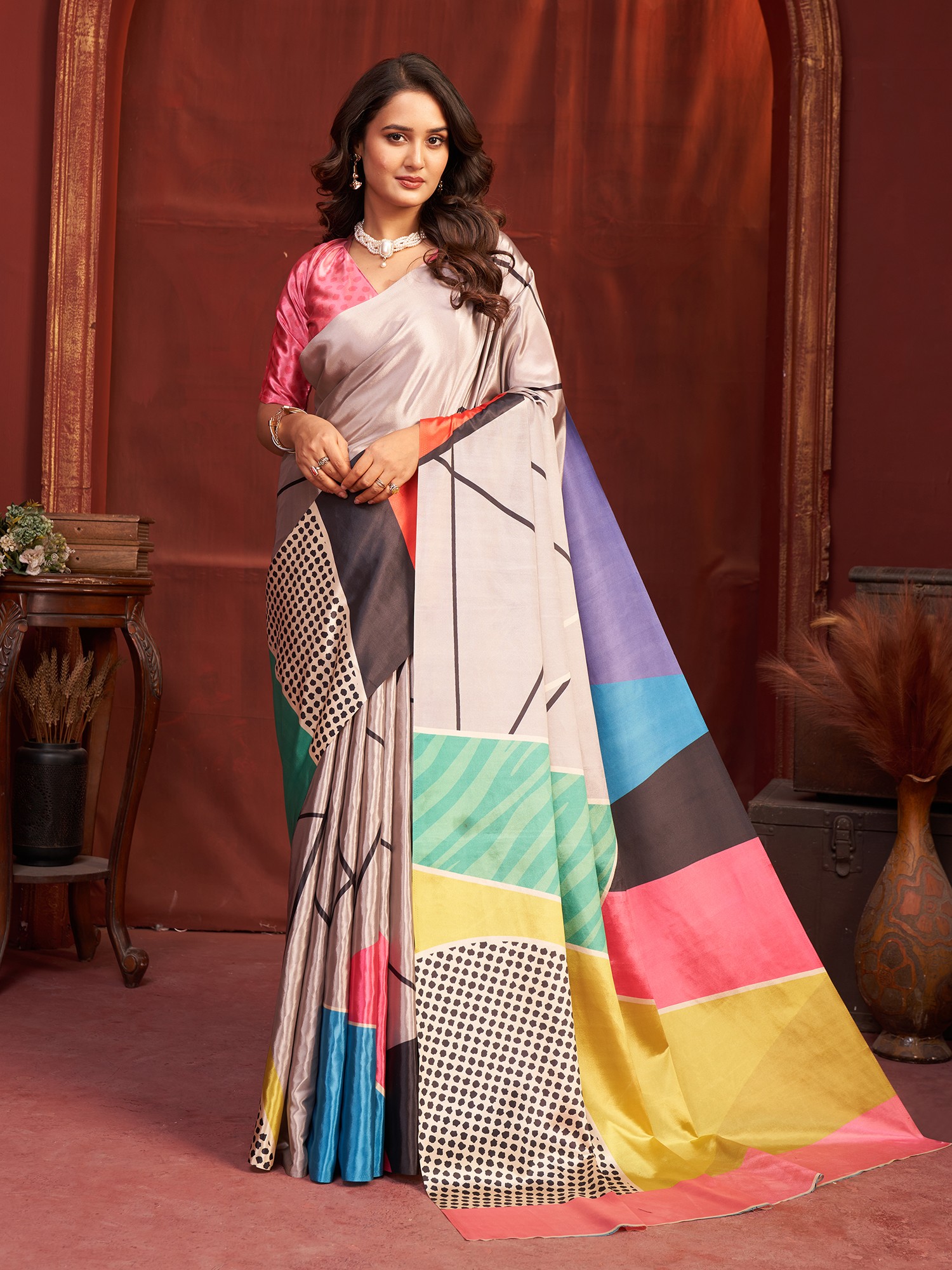 What truly sets this saree apart is its captivating print. Moving away from traditional motifs, this design features a striking geometric pattern in a vibrant palette of colors. Bold blocks of pink, teal, yellow, and black are juxtaposed with crisp white lines and a classic polka dot accent, creating a visual masterpiece. The steel-grey base provides a sophisticated canvas, allowing the dynamic print to command attention without being overwhelming. This contemporary design is perfect for those who wish to make a fashion-forward statement and celebrate a more modern interpretation of ethnic wear. It’s a celebration of color and form, designed to turn heads and spark conversations.