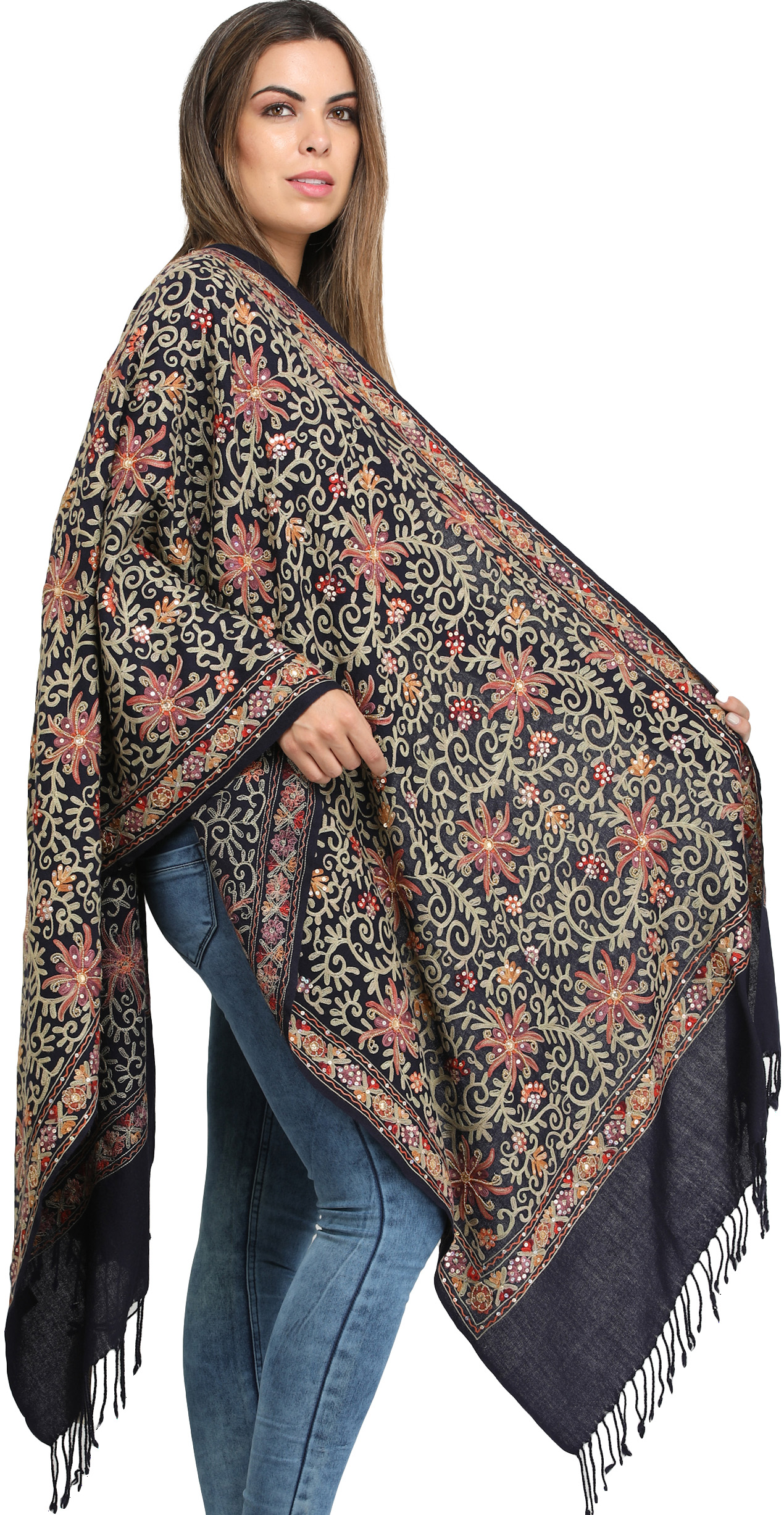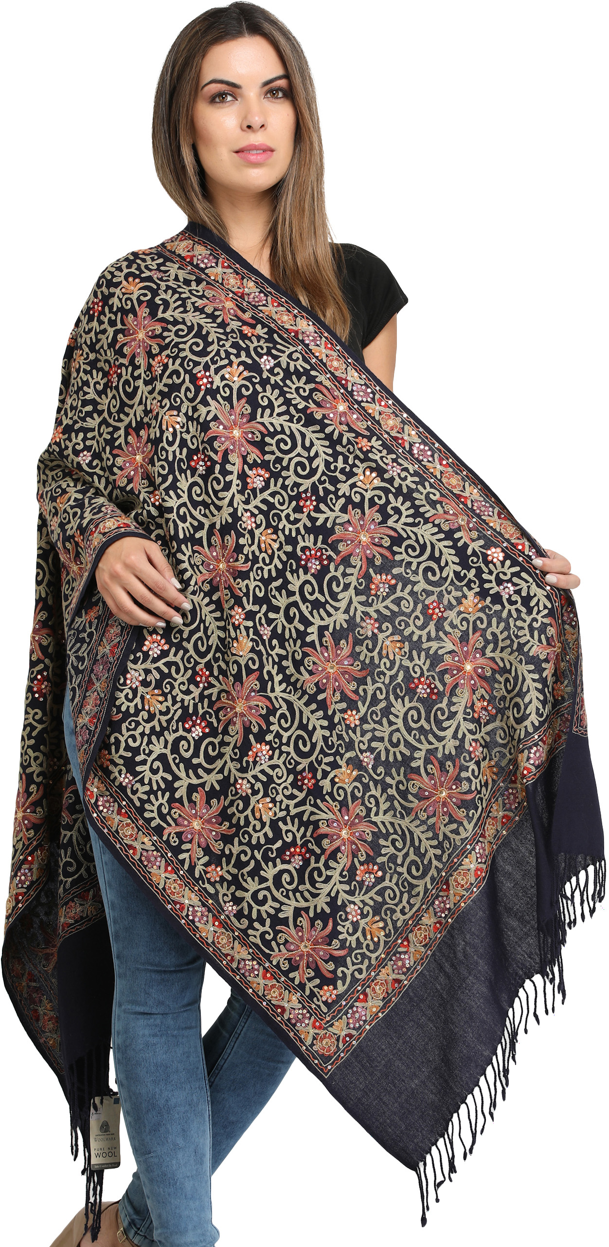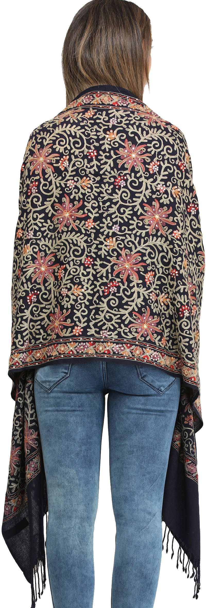 The delicate designs form the perfect layout to pair this beauty with your favourite attire and elevate its sophistication and stunningness. This wrap is everything you need when it comes to having to oomph up your attires. A brilliant embroidery that can blend in perfectly with radiantly or subtly coloured outfits, makes the patterns and hues of this layering piece the perfect pick for the winters.