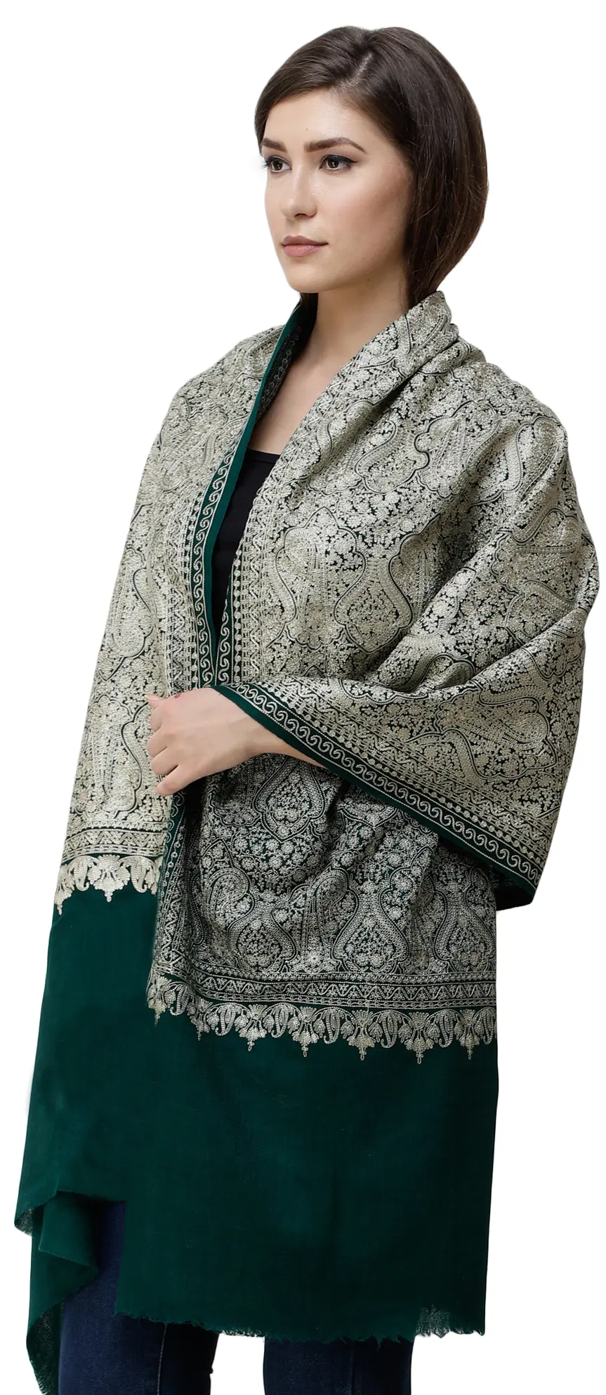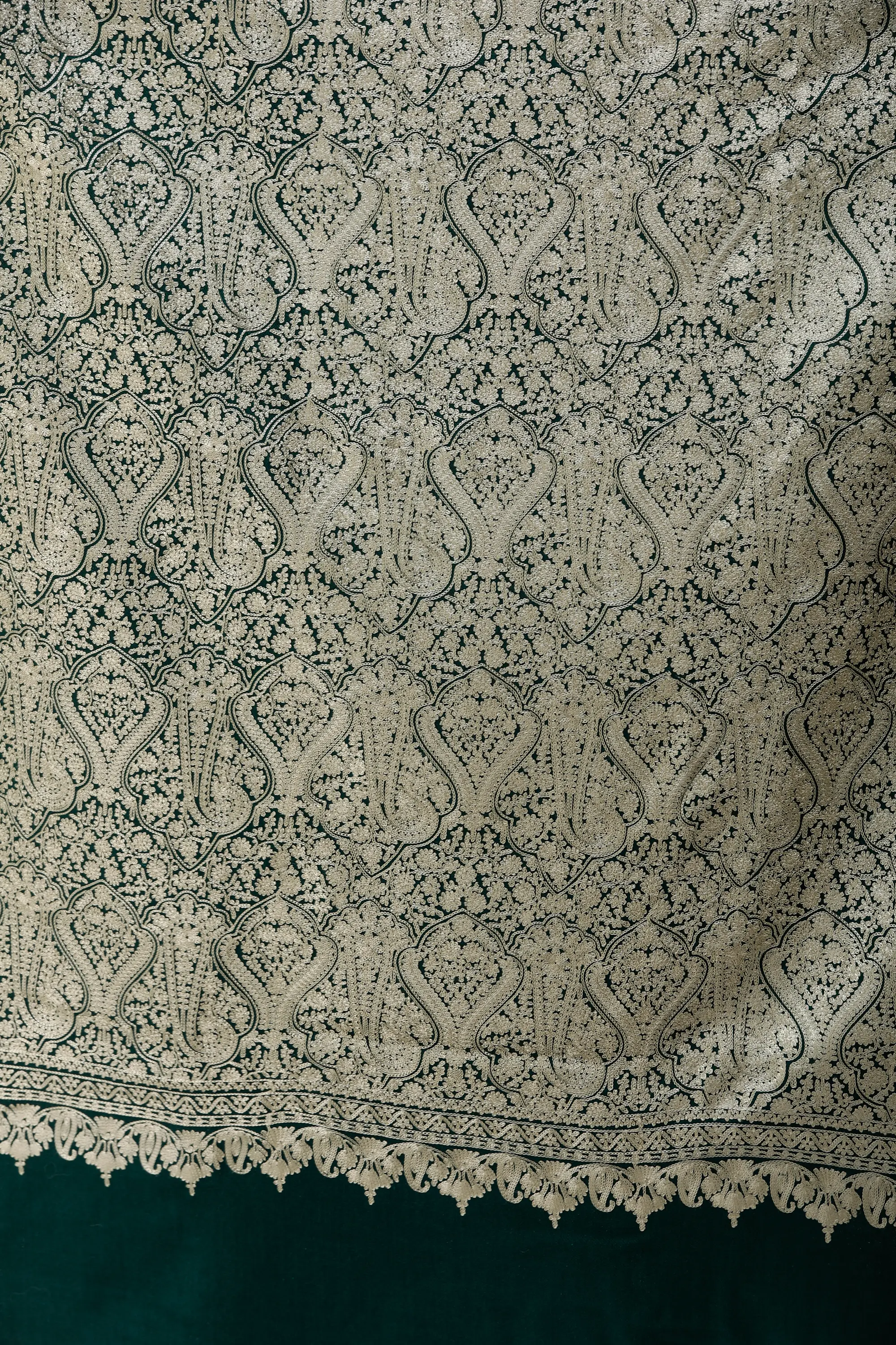 Unveil the timeless allure of a stole from Amritsar adorned with all-over Aari embroidery. This ancient Aari embroidery technique, deeply rooted in Mughal history, is executed with meticulous precision by skilled artisans. Each embroidered motif is a testament to their craftsmanship. The classic design remains relevant in today's fashion landscape, making it a valuable addition to your wardrobe. The stole's rich color and intricate detailing reflect the age-old traditions and artistry of Amritsar, blending history with contemporary style.