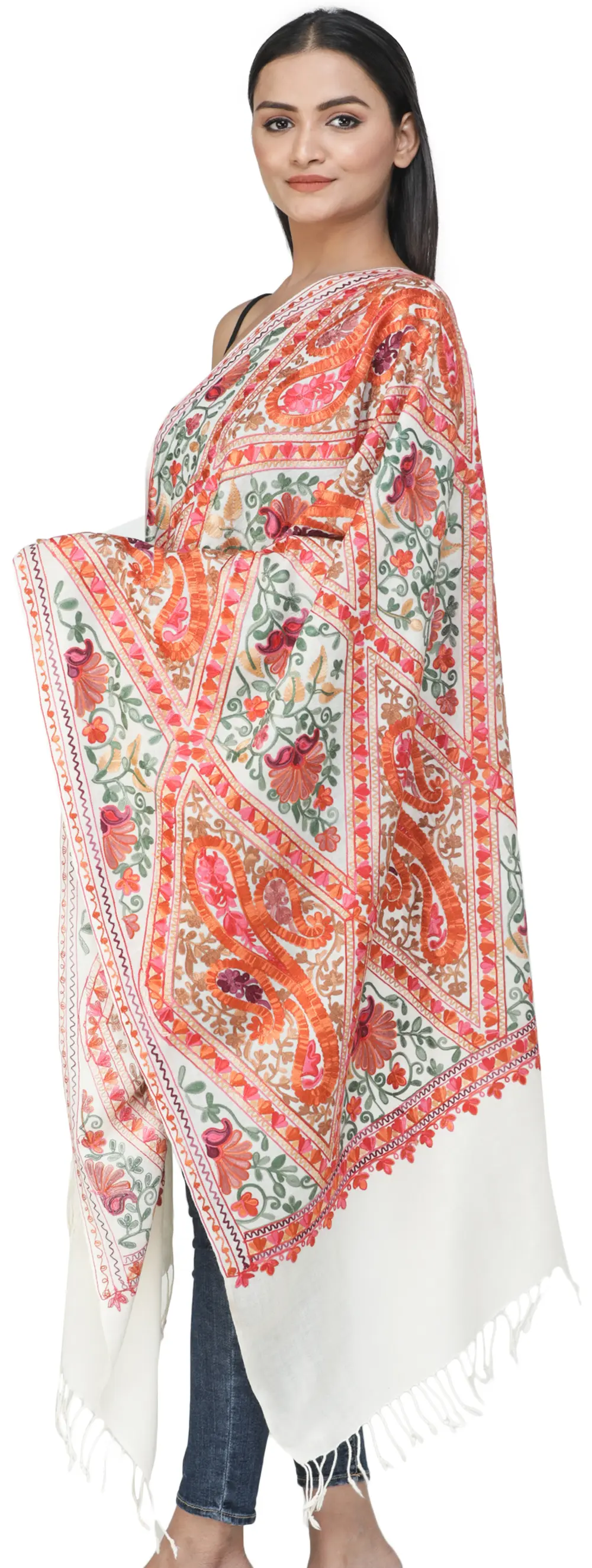 Kashmiri artisans have lent their expertise to this exquisite stole. The intricate Aari-embroidered paisleys and flowers sprawl across the fabric in vivid, multicolored threads. This design has been passed down through generations. Its timeless elegance and unparalleled artistry have been adapted to fit today's fashion landscape. This stole encapsulates the rich cultural tapestry of Kashmir, making it a valuable piece that combines heritage with contemporary style.