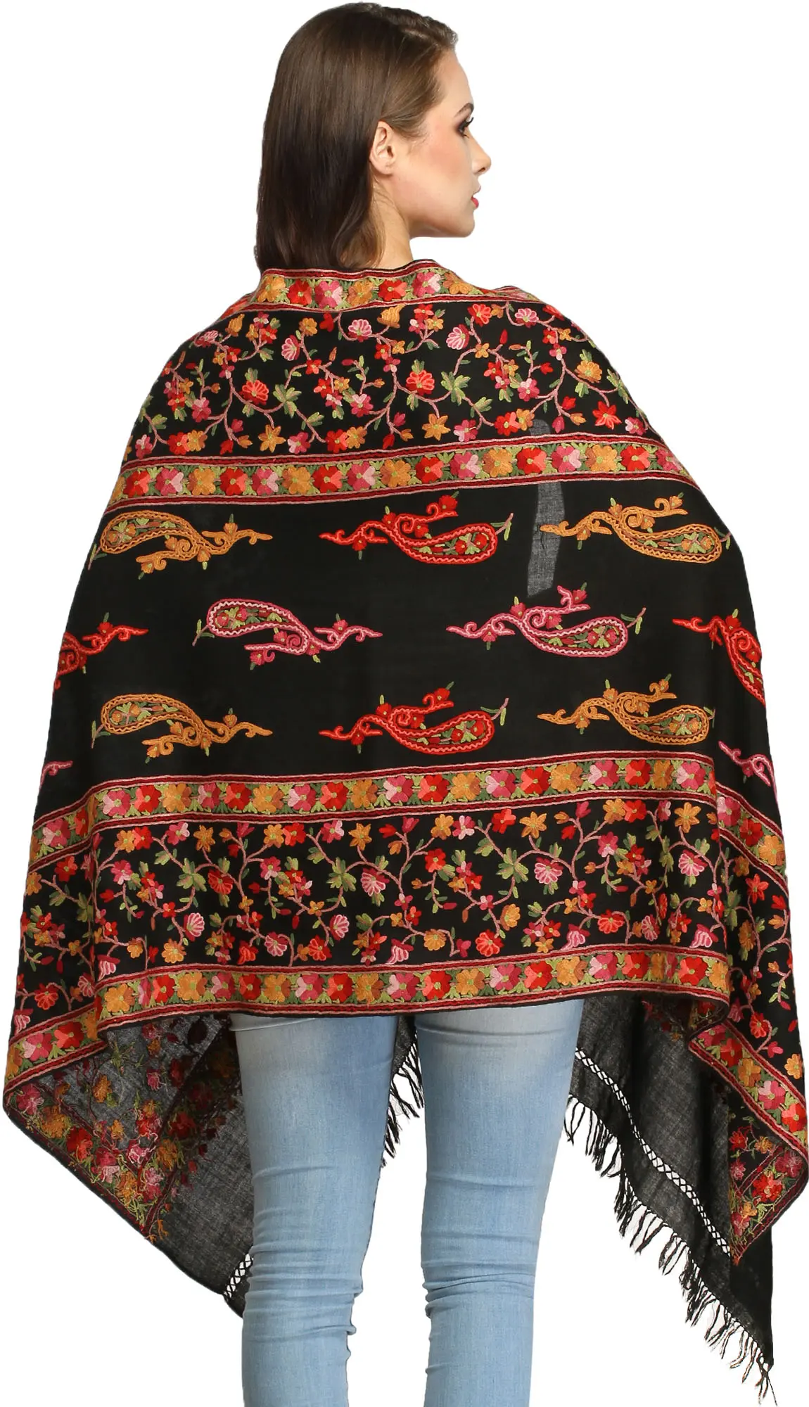 Pure Wool Shawl from Kashmir with Sozni Hand-Embroidered Giant Paisleys