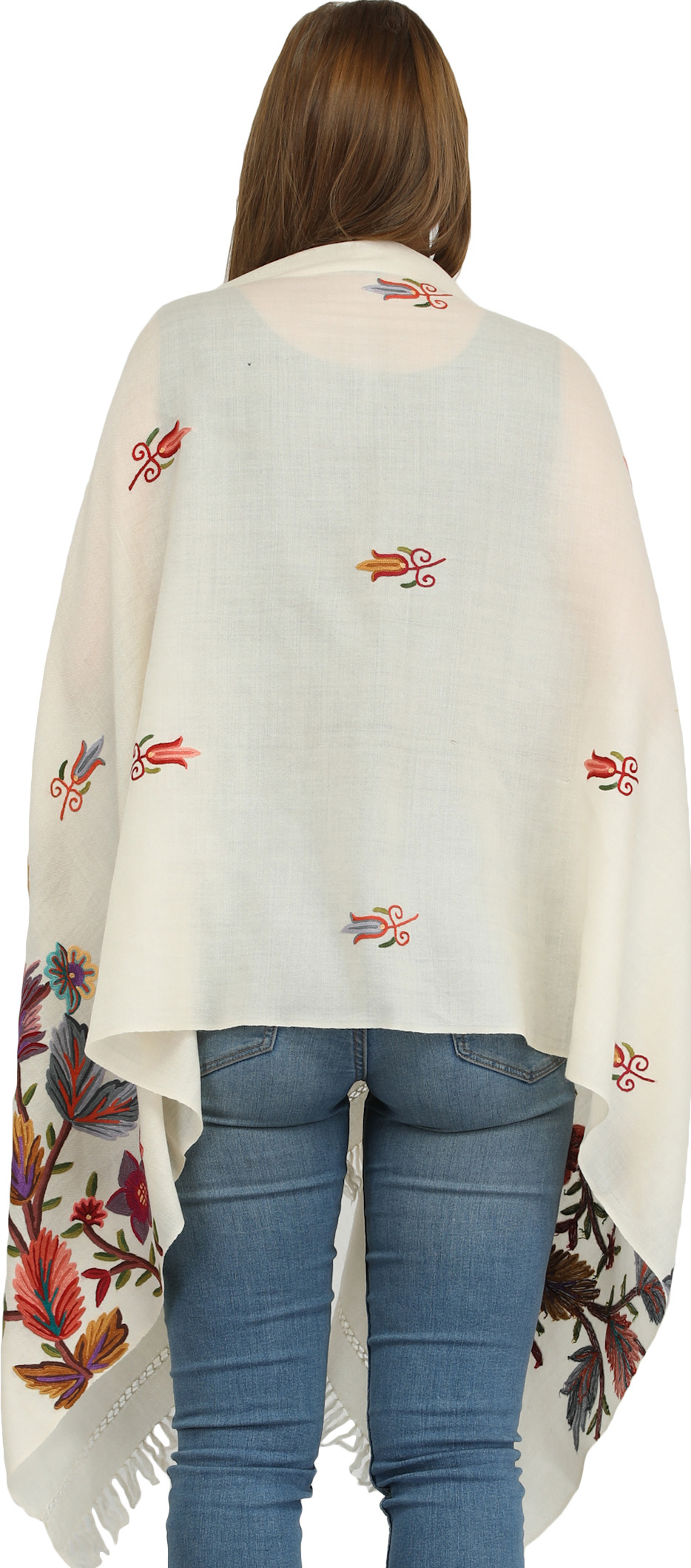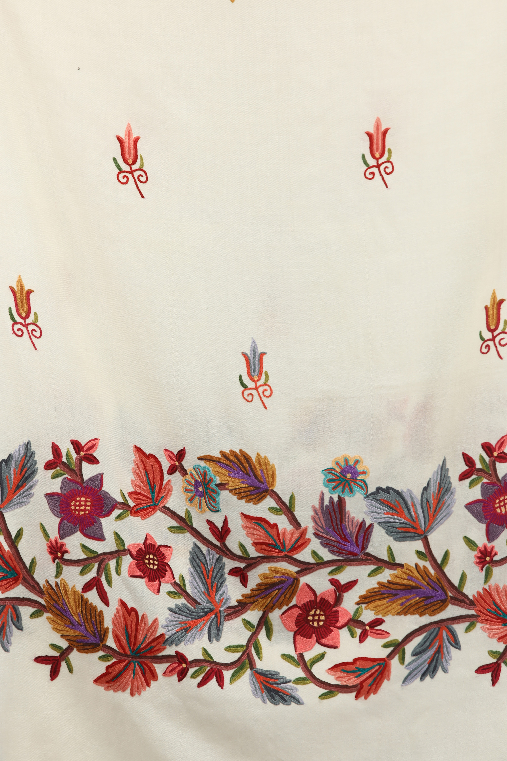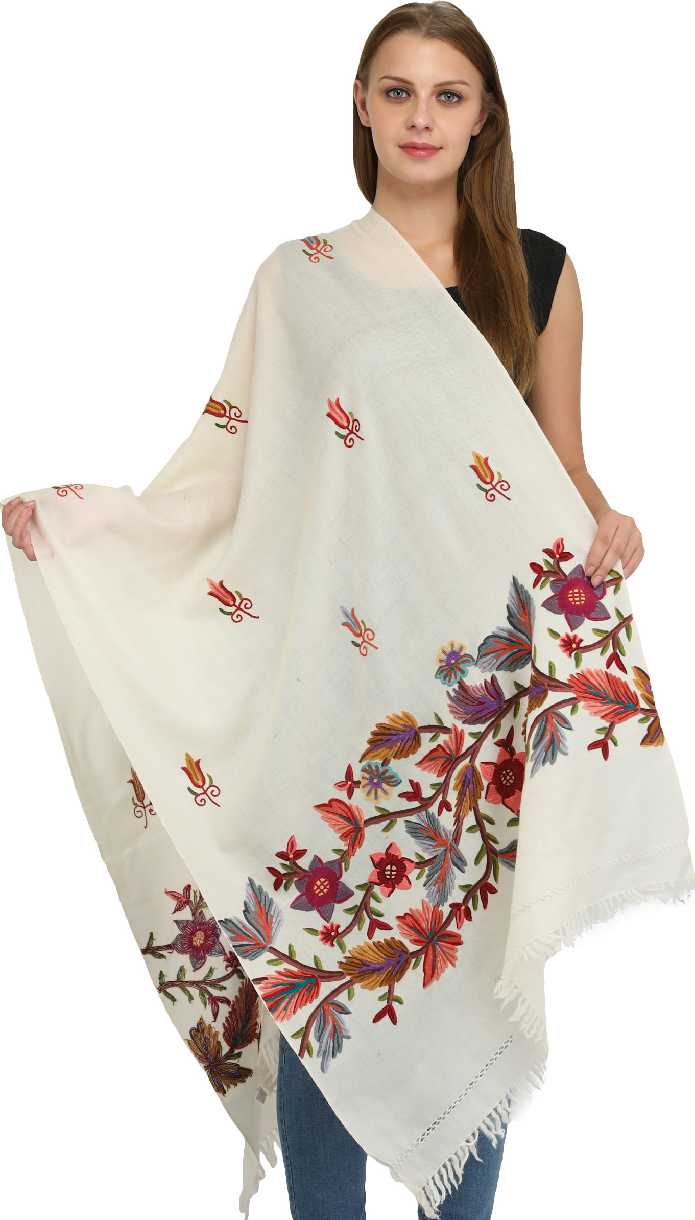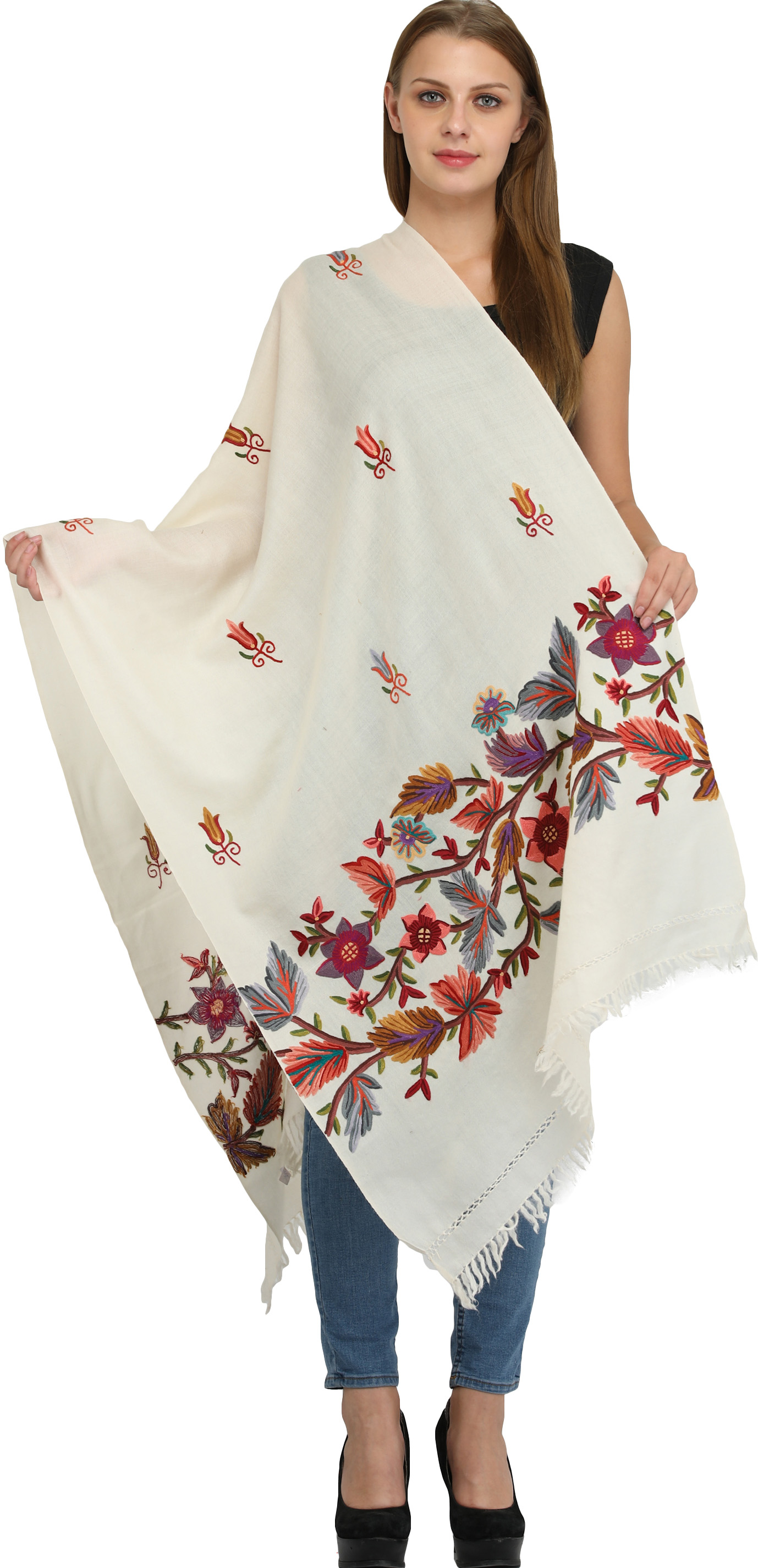 Ivory and Red Kashmiri Stole with Aari Hand-Embroidery All-Over