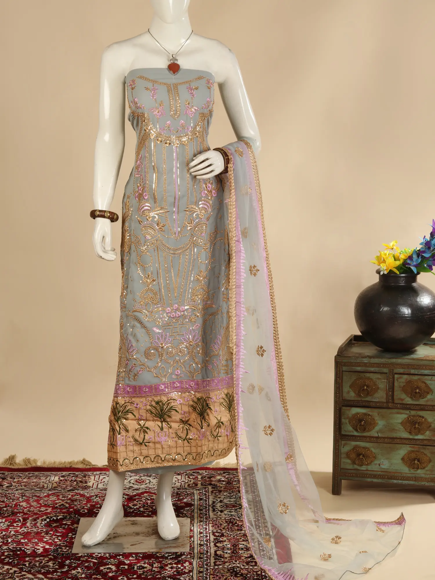 Faux Georgette Anarkali Suit With Broad Border Dupatta And Floral Embroidery On Neck & Waist