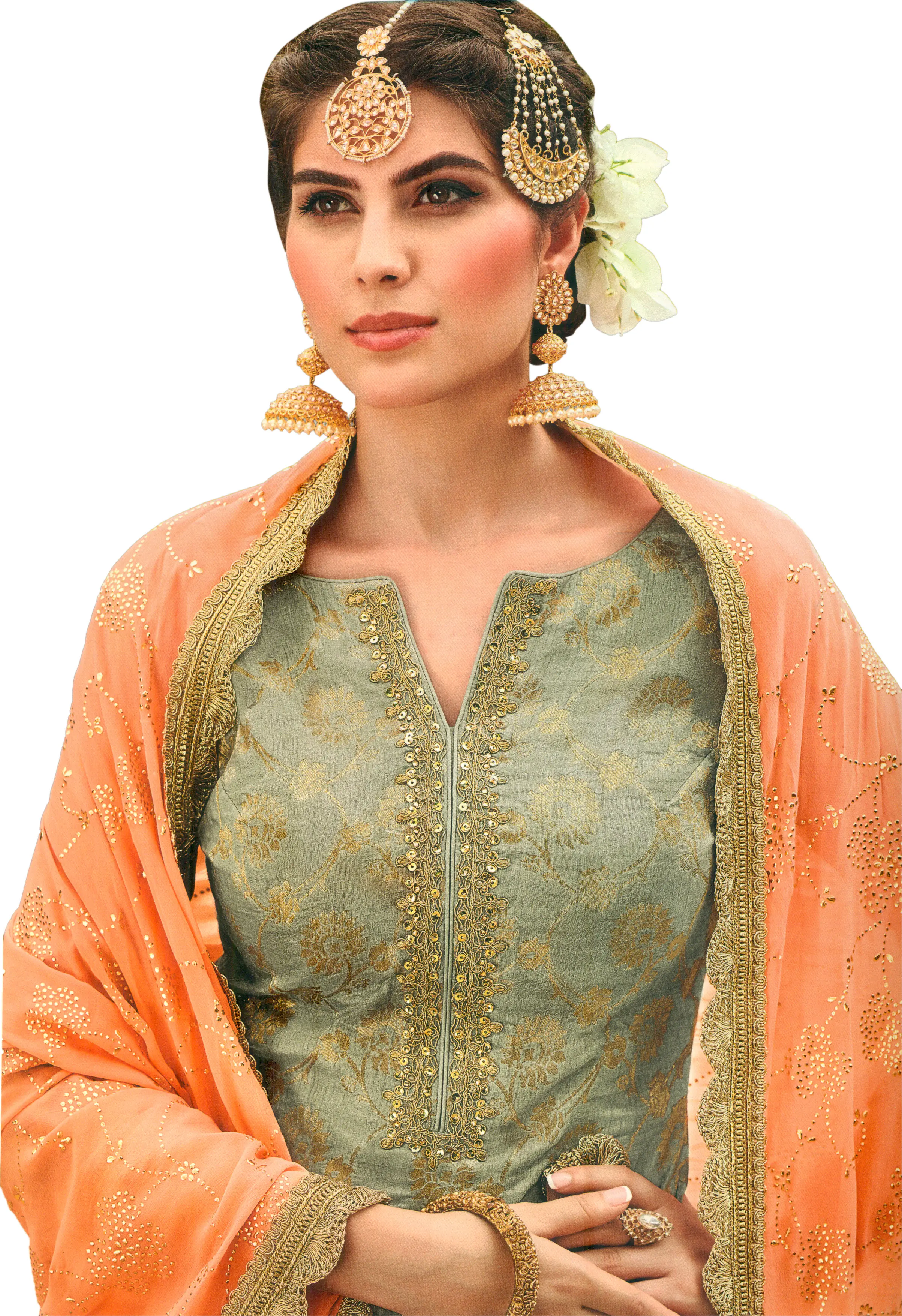 Glacier-Gray Faux Georgette Three-Piece Salwar Kameez with Matching Dupatta and Heavy Zari- Sequins Embroidery