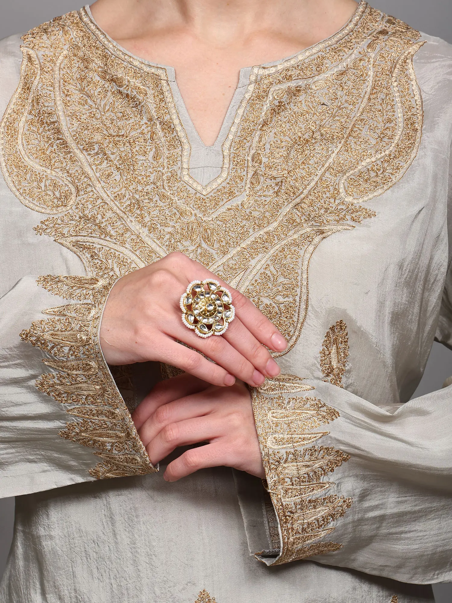 Immerse yourself in the rich heritage of Kashmiri craftsmanship with this exquisite straight salwar suit set. Crafted from luxurious art silk, this ensemble offers a sophisticated sheen and a graceful drape, making it perfect for occasions where understated elegance is key. The delicate fabric feels soft against the skin, promising comfort without compromising on style. The ensemble features a beautifully designed straight-cut kurta, which offers a flattering and contemporary silhouette. The neckline is adorned with intricate golden chain stitch embroidery, a testament to the artisanal skill of Kashmir. This detailed work forms a captivating motif that cascades down the front of the kurta, drawing the eye and adding a touch of regal charm. The same delicate embroidery graces the cuffs of the long sleeves, creating a harmonious and polished look. Scattered across the kurta are smaller, elegantly placed embroidered motifs, further enhancing its visual appeal and showcasing the meticulous attention to detail. The accompanying salwar is designed for both comfort and style. Its straight-leg cut provides a clean and modern line, while the elasticated waistband ensures a perfect and comfortable fit for various body types. The hem of the salwar mirrors the intricate embroidery found on the kurta, featuring a beautiful border that adds a refined finishing touch. This coordinated detailing ensures that every element of the outfit speaks of quality and thoughtful design.