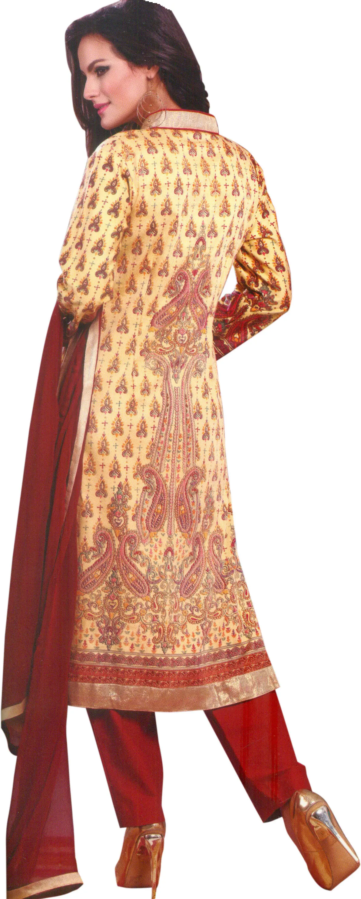 Step into a world of refined elegance with this stunning Trouser Salwar Kameez suit, a masterpiece designed to captivate. The base of the ensemble is a soft, pure cotton fabric, ensuring both comfort and breathability, perfect for any occasion, from festive gatherings to elegant evenings out. The rich straw-yellow hue serves as a delightful canvas for the intricate maroon print that dances across the fabric. This detailed print, inspired by traditional motifs, features delicate paisley patterns interspersed with smaller floral and geometric designs, creating a visually rich and harmonious composition. The neckline is adorned with a contrasting maroon and gold border, lending a regal touch and framing the face beautifully. Subtle crystal embellishments are strategically placed, catching the light and adding a touch of shimmer that elevates the entire look without being overpowering.