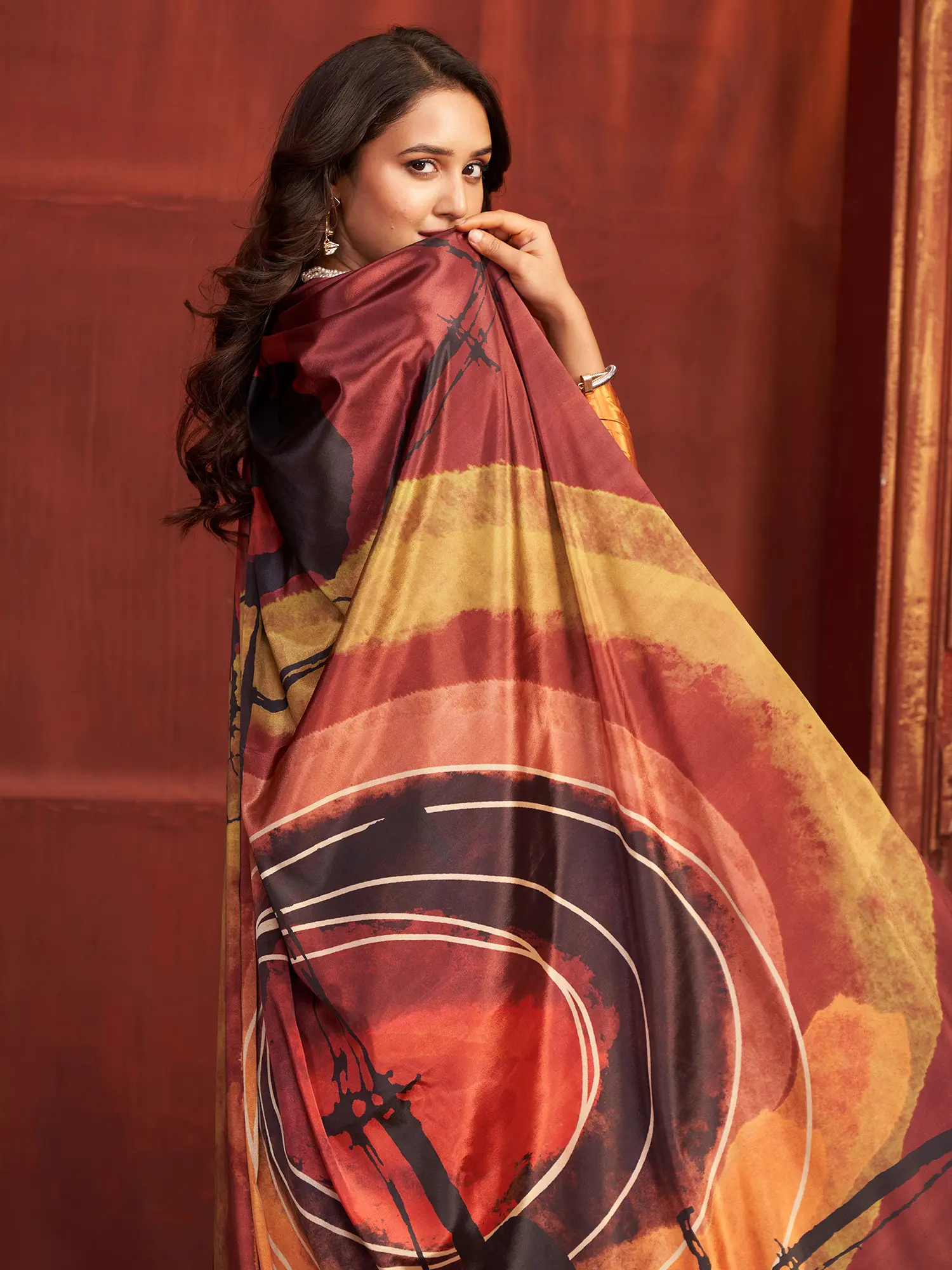 The striking palette features deep maroons that transition into warm ochres and vibrant oranges, accented by graphic black lines that add a contemporary edge. These dynamic abstract sunburst motifs are not merely printed but expertly integrated, creating a visual spectacle that unfolds with every fold and pleat. The generous expanse of the fabric allows the artistry to truly breathe and command its environment.