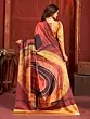 Striking Malai Crepe Silk Saree Featuring Bold Designer Printed Abstract Sunburst Patterns With Dramatic Contrast