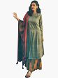Feeling queenly in your casual wear is a tough balance, but with this string-gray salwar kameez, be assured to enjoy comfort and regalia together. The soft cotton is tailored into a lovely kurta, which is beautified by delicate floral motifs and a flowing, complemented by the yellow floral printed palazzo pants that continue a comfy streak. The crepe dupatta adds a beautiful grace to the look, with its floral patterns and soft tassels.