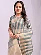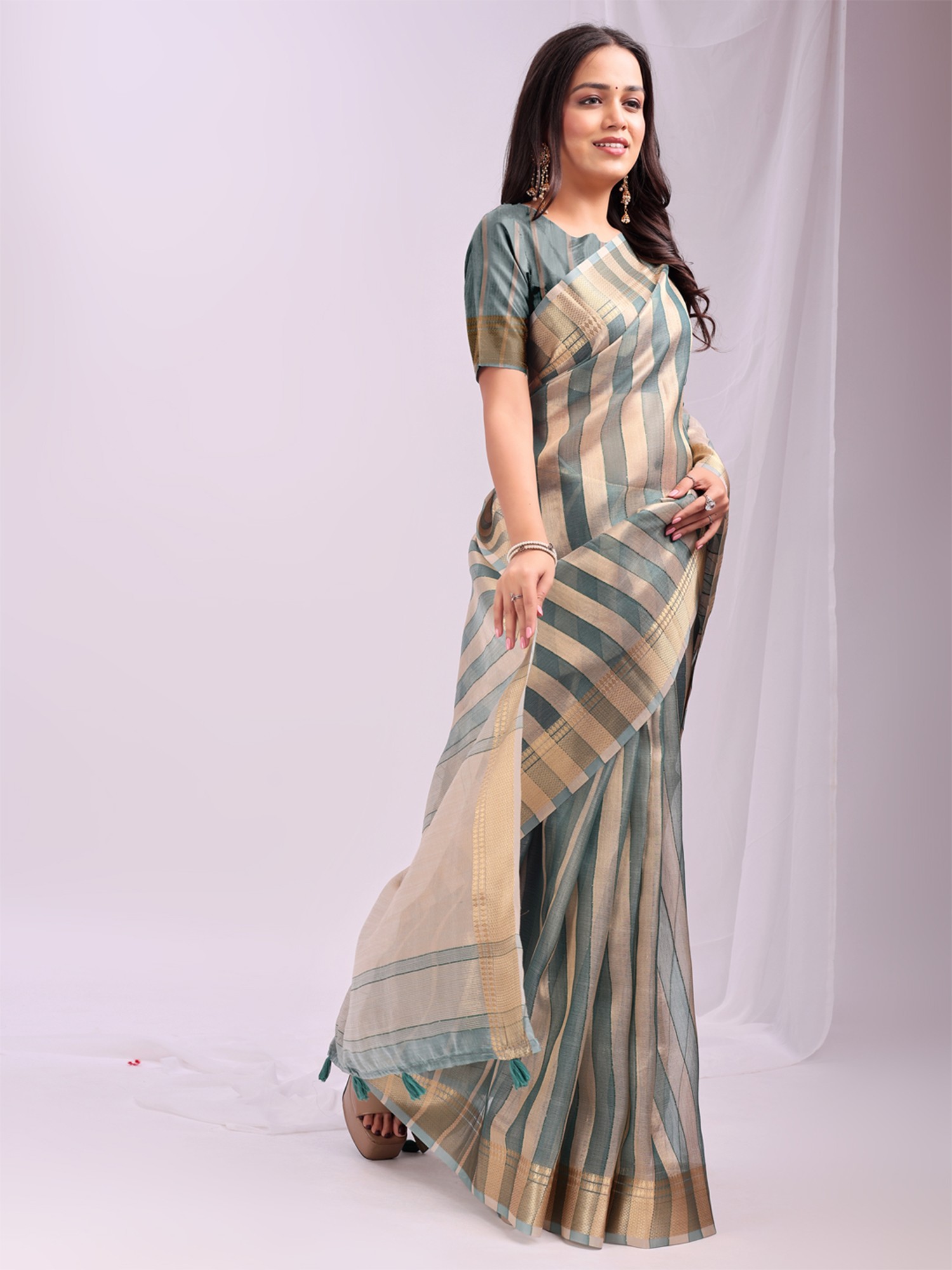 Stripe Pattern Elegant Festive Wear Organza Saree With Tassels Pallu