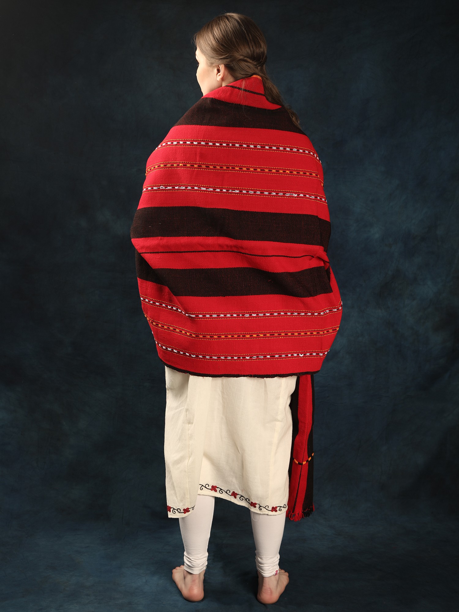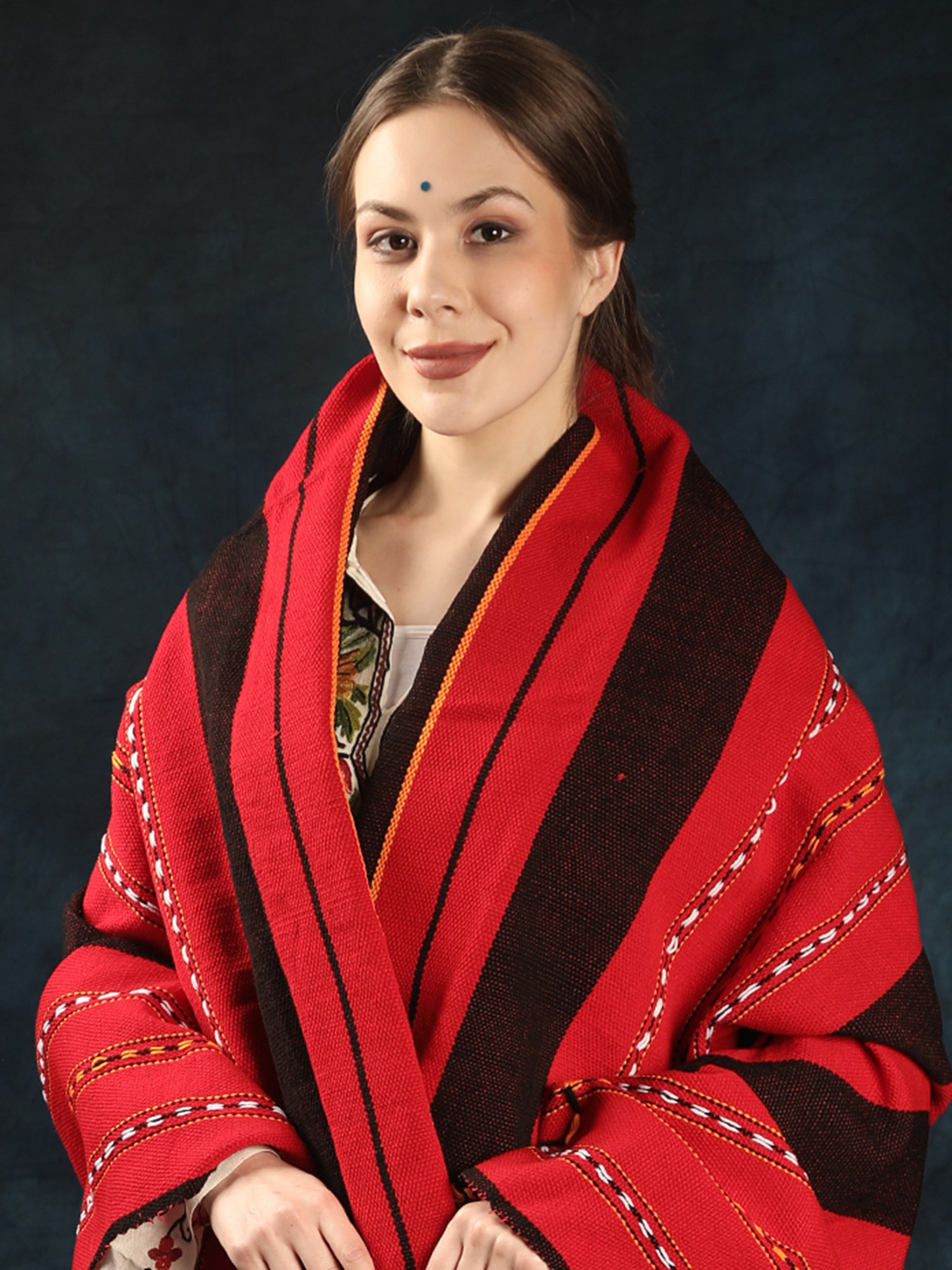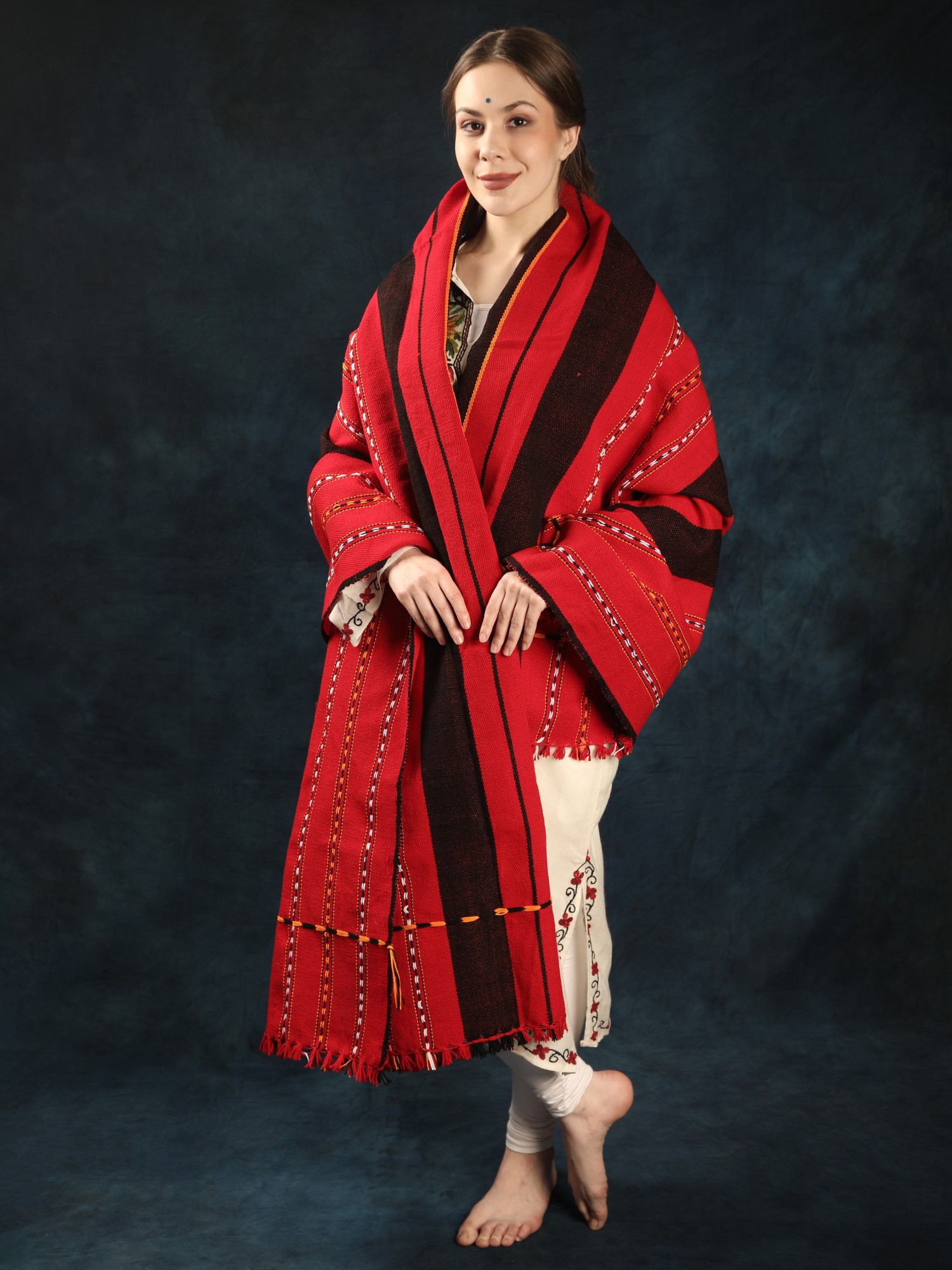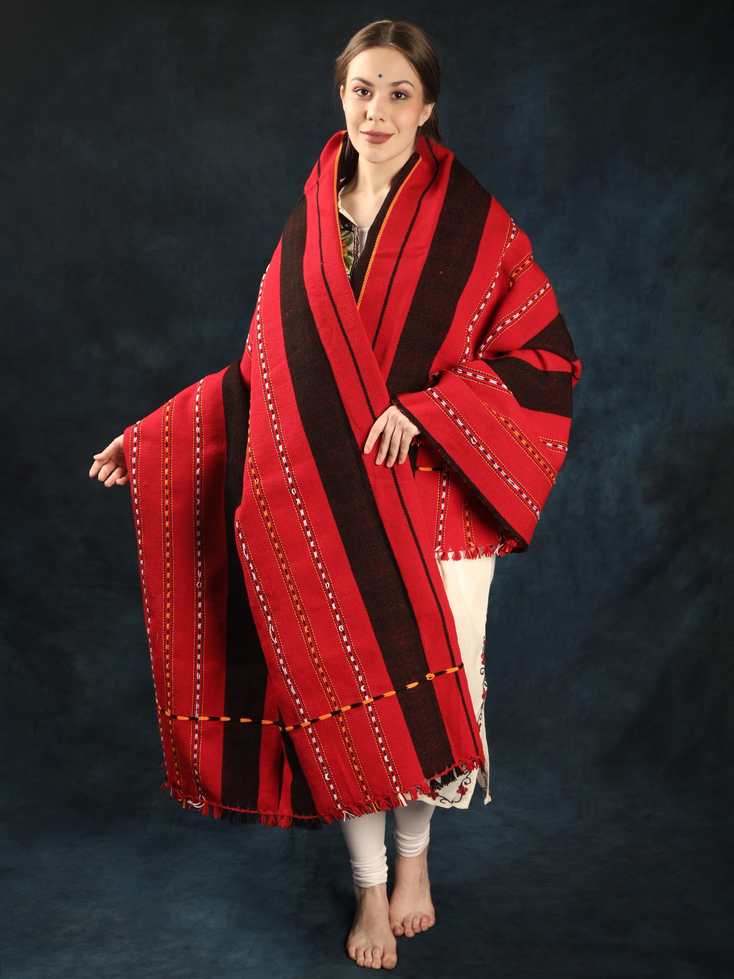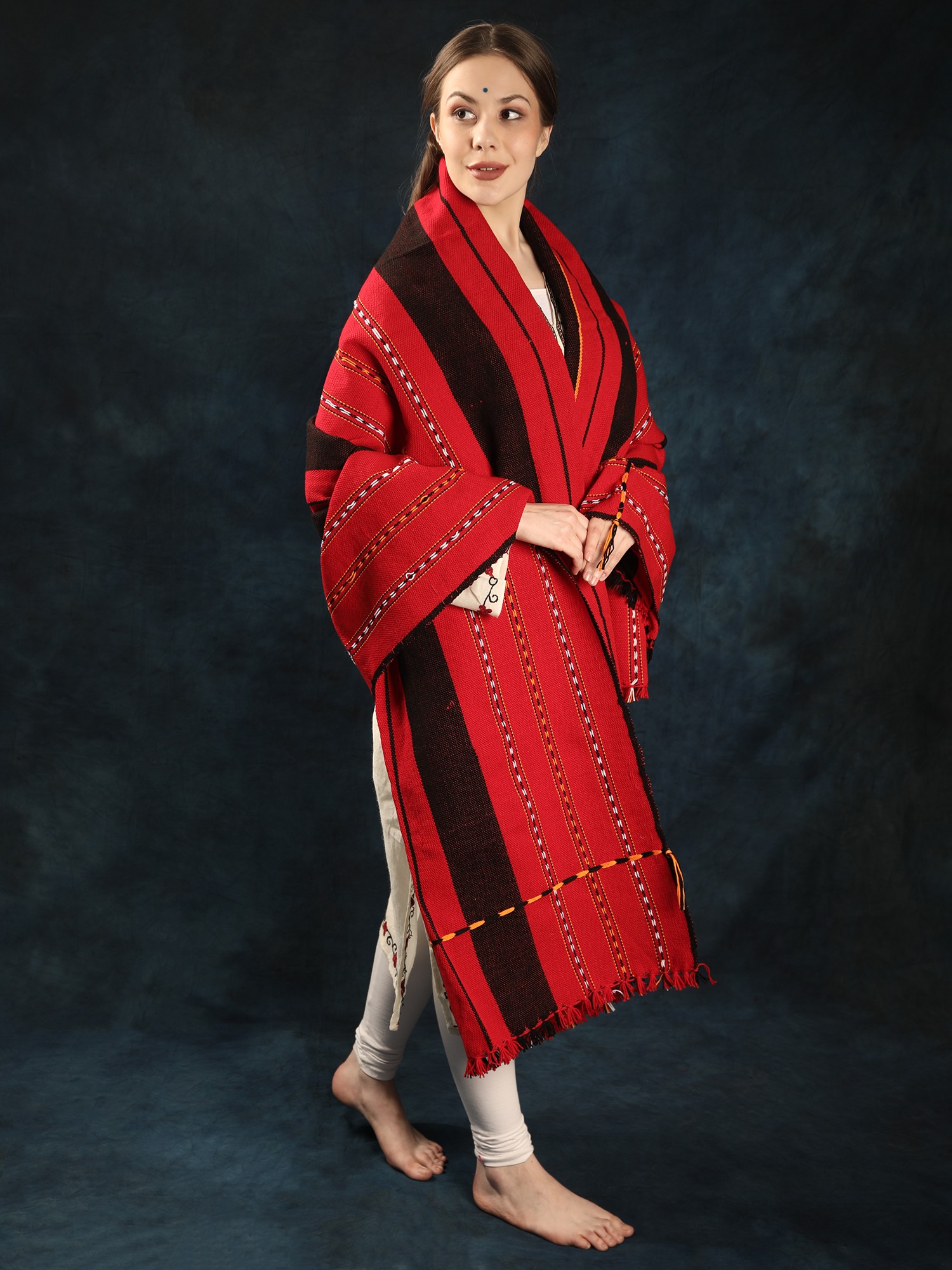 With this shawl, you may experience the essence of Nagaland's heritage and infuse your outfit with an aura of indigenous charm. This “folk shawl” captures the essence of Nagaland's rich colorful legacy, with each thread embroidered with narratives of tradition. Adorned with stripe patterns, it symbolizes the resilience and unity of its people. Its warmth is equaled only by its beauty, thanks to its superior wool construction. Wrap yourself in its embrace during chilly evenings, or drape it gracefully over your shoulders to exude eternal charm.
