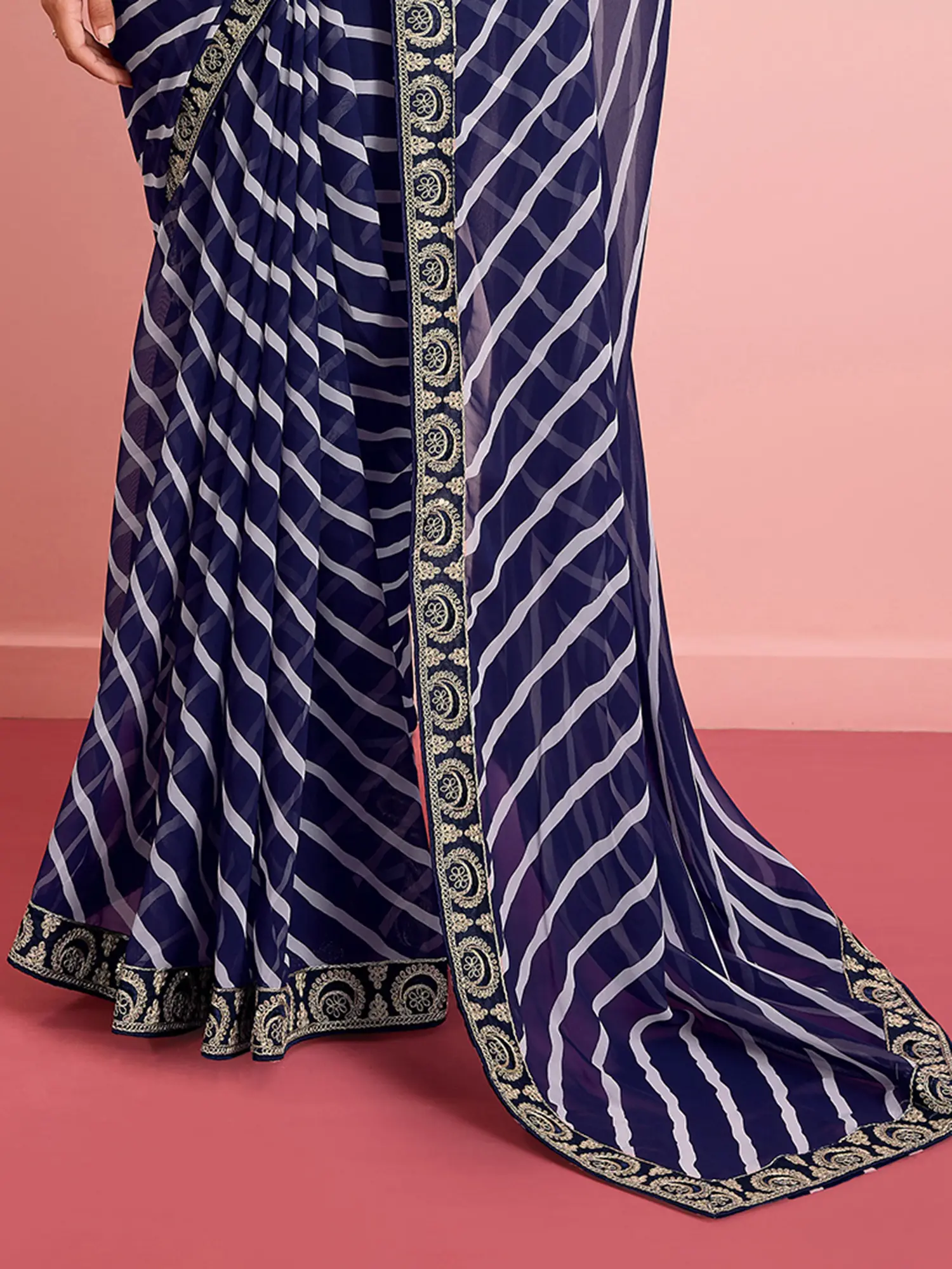 Discover the perfect blend of contemporary style and traditional craftsmanship with this exquisite georgette saree. The deep navy fabric is adorned with a captivating all-over striped pattern in crisp white, creating a visually striking and dynamic aesthetic. This classic motif lends a touch of sophistication and charm, making the saree a versatile choice for a variety of occasions.