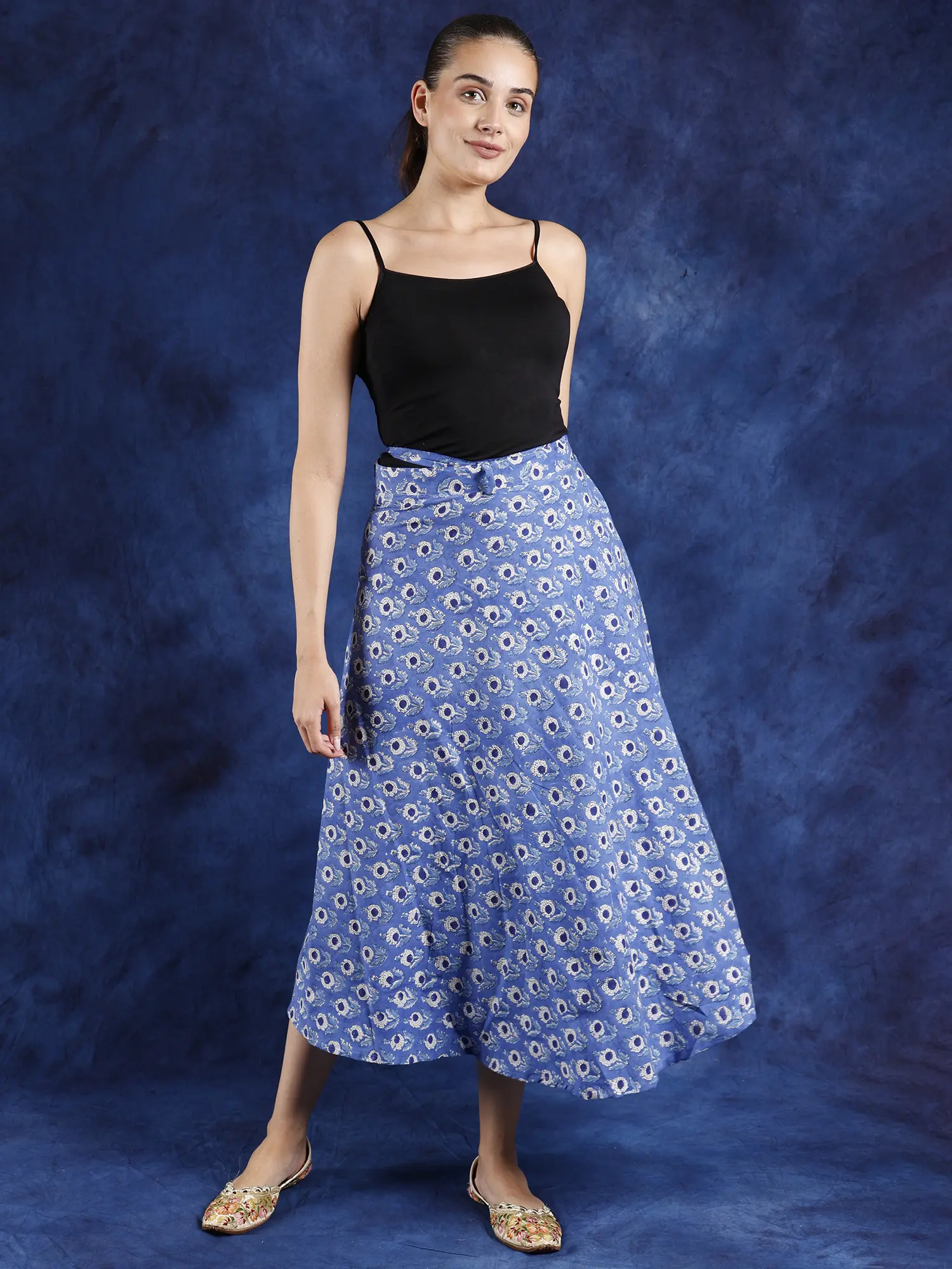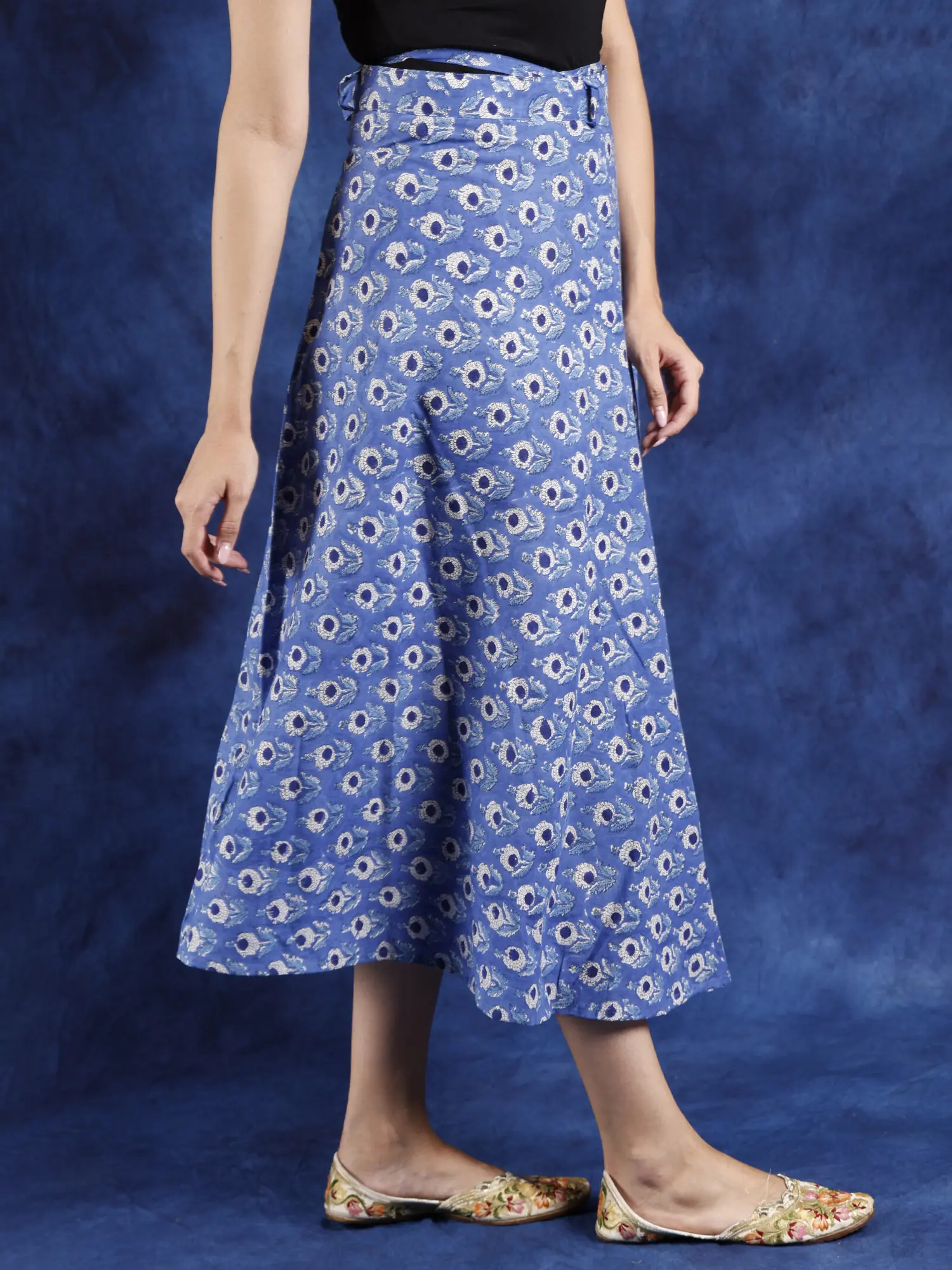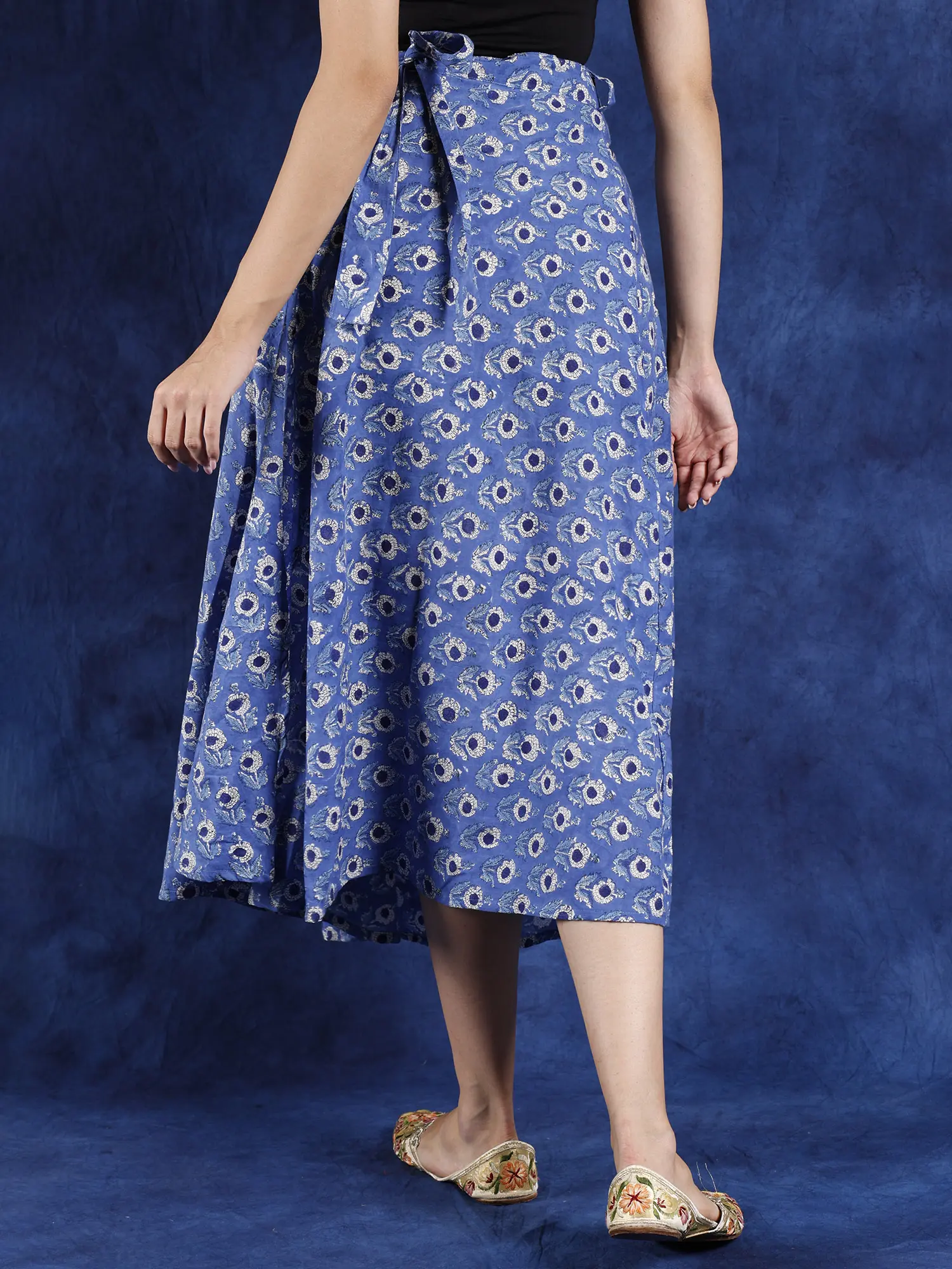 Bring a chic touch of pure cotton to your casual looks with this wrap-around floral print skirt. The comfy feel of cotton is enhanced by the wrap-around fit, which is adjustable according to your ease. Lovely floral bootis cover the entire skirt, adding the charm of nature to your looks.