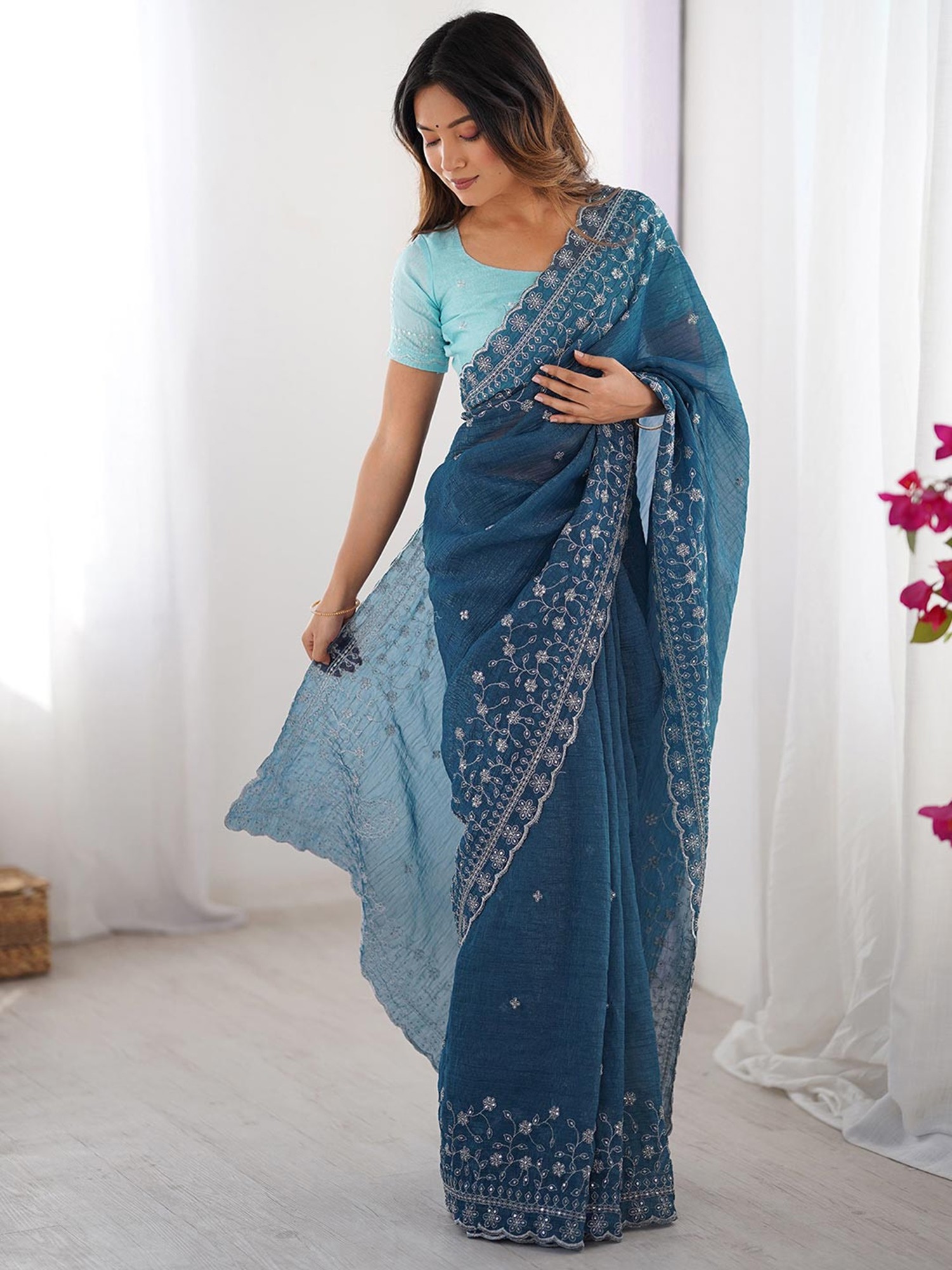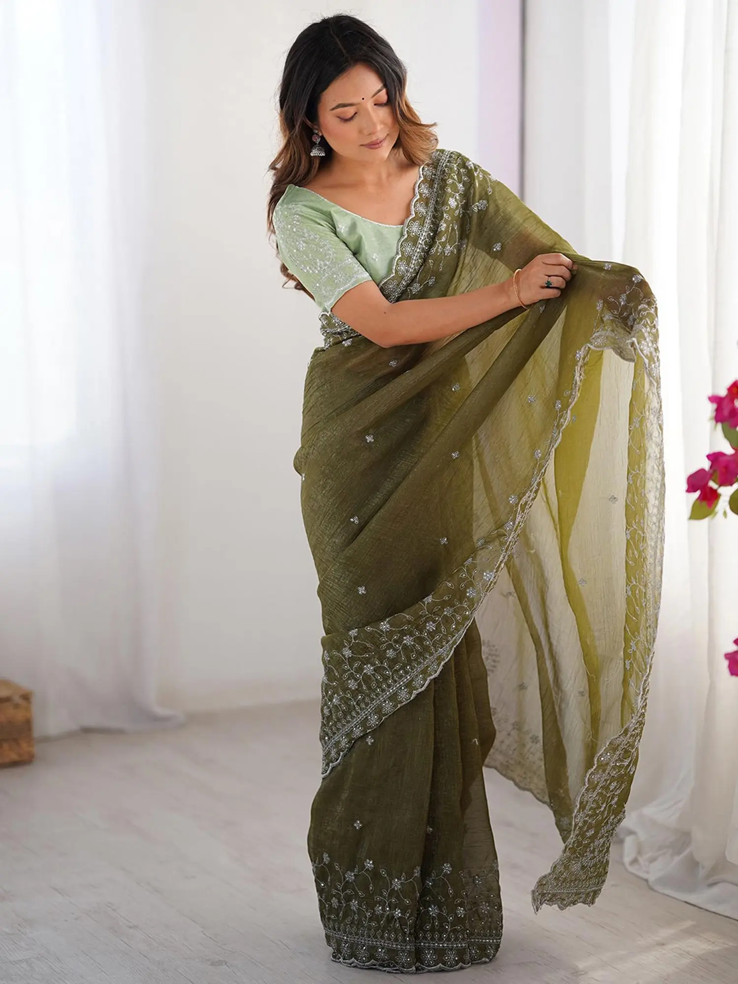 Stunning Shaded Chinon Saree Featuring Premium Double Color Swarovski Embroidery And Elegant Subtle Piping Detailing