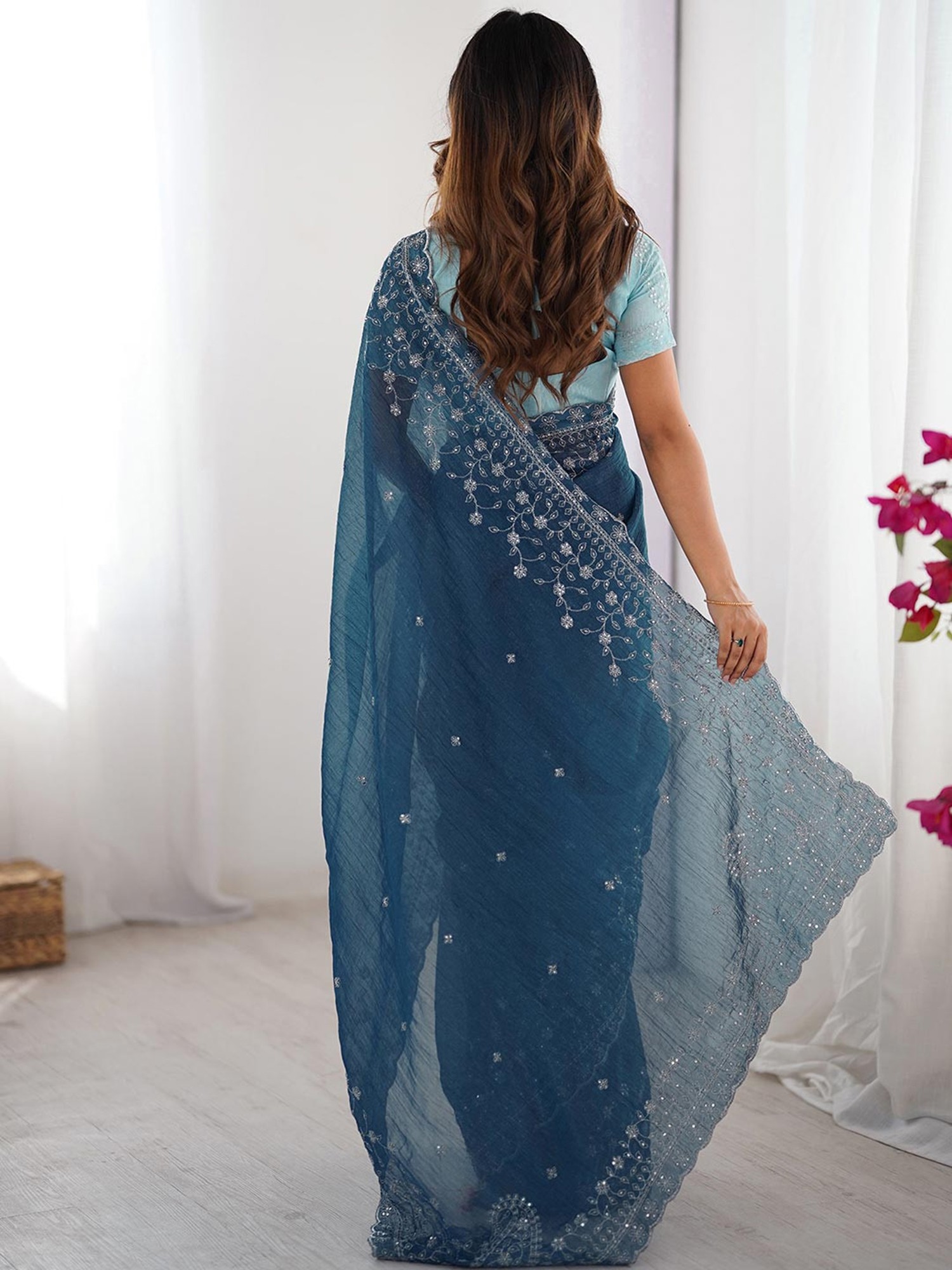 Gorgeous Fendy Satin Saree Adorned With Sequence Moti And Cutdana Embellishments Perfect For Designer Partywear