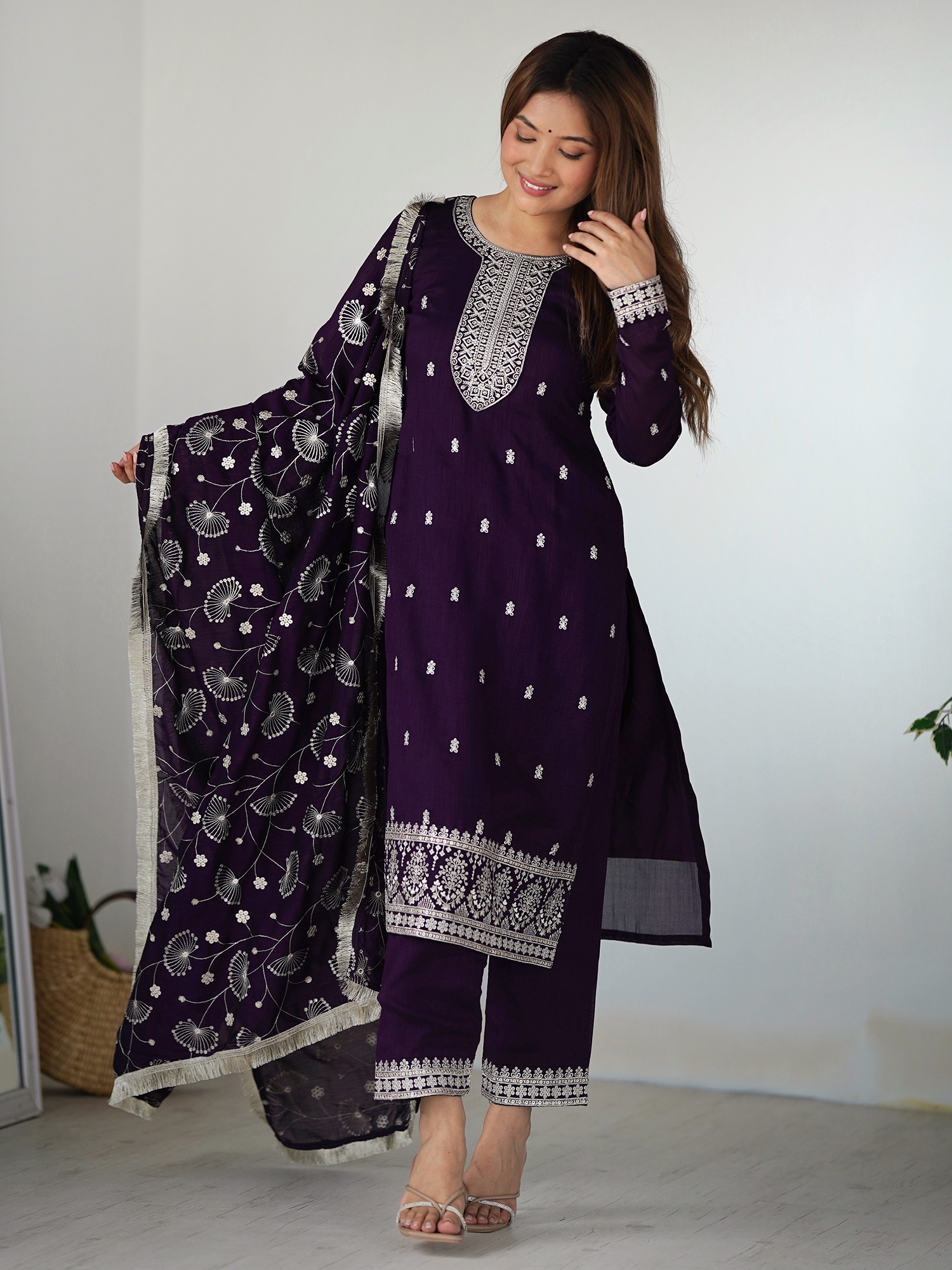 Vichitra Silk Embroidered Sequins And Zari Work Designer Salwar Suit With Matching Dupatta